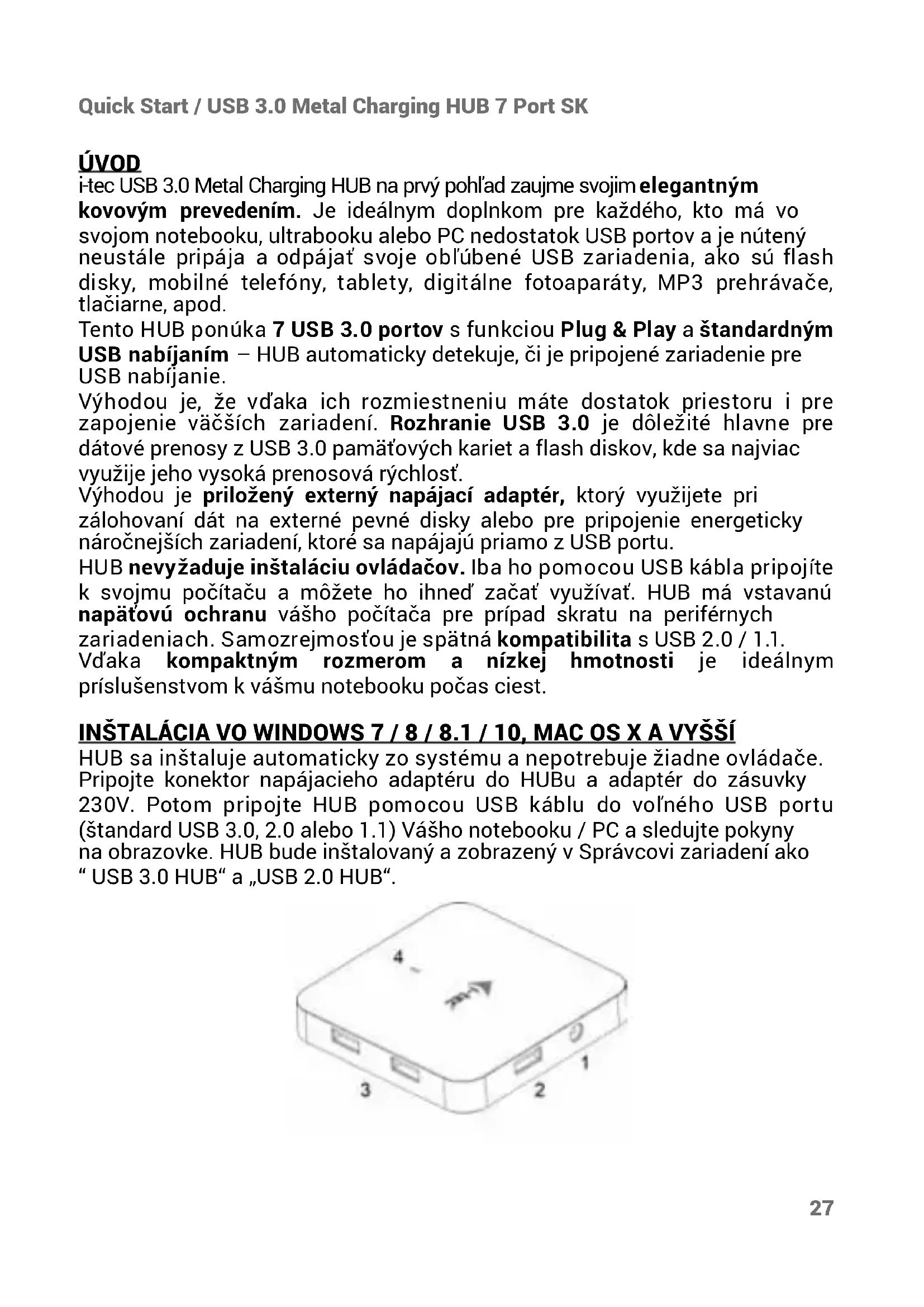 Dostępne na naszych stronach www.i-tec.cz/pl/ w zakładce „FAQ“ przy niniejszym produkcie.27 Quick Start / USB 3.0 Metal Charging HUB 7 Port SK ÚVOD i-tec USB 3.0 Metal Charging HUB na prvý pohľad zaujme svojim elegantným kovovým prevedením. Je ideálnym doplnkom pre každého, kto má vo svojom notebooku, ultrabooku alebo PC nedostatok USB portov a je nútený neustále pripája a odpájať svoje obľúbené USB zariadenia, ako sú ash disky, mobilné telefóny, tablety, digitálne fotoaparáty, MP3 prehrávače, tlačiarne, apod. Tento HUB ponúka 7 USB 3.0 portov s funkciou Plug & Play a štandardným USB nabíjaním – HUB automaticky detekuje, či je pripojené zariadenie pre USB nabíjanie. Výhodou je, že vďaka ich rozmiestneniu máte dostatok priestoru i pre zapojenie väčších zariadení. Rozhranie USB 3.0 je dôležité hlavne pre dátové prenosy z USB 3.0 pamäťových kariet a ash diskov, kde sa najviac využije jeho vysoká prenosová rýchlosť. Výhodou je priložený externý napájací adaptér, ktorý využijete pri zálohovaní dát na externé pevné disky alebo pre pripojenie energeticky náročnejších zariadení, ktoré sa napájajú priamo z USB portu. HUB nevyžaduje inštaláciu ovládačov. Iba ho pomocou USB kábla pripojíte k svojmu počítaču a môžete ho ihneď začať využívať. HUB má vstavanú napäťovú ochranu vášho počítača pre prípad skratu na periférnych zariadeniach. Samozrejmosťou je spätná kompatibilita s USB 2.0 / 1.1. Vďaka kompaktným rozmerom a nízkej hmotnosti je ideálnym príslušenstvom k vášmu notebooku počas ciest. INŠTALÁCIA VO WINDOWS 7 / 8 / 8.1 / 10, MAC OS X A VYŠŠÍ HUB sa inštaluje automaticky zo systému a nepotrebuje žiadne ovládače. Pripojte konektor napájacieho adaptéru do HUBu a adaptér do zásuvky 230V. Potom pripojte HUB pomocou USB káblu do voľného USB portu (štandard USB 3.0, 2.0 alebo 1.1) Vášho notebooku / PC a sledujte pokyny na obrazovke. HUB bude inštalovaný a zobrazený v Správcovi zariadení ako “ USB 3.0 HUB“ a „USB 2.0 HUB“.28 Quick Start / USB 3.0 Metal Charging HUB 7 PortSK POPIS