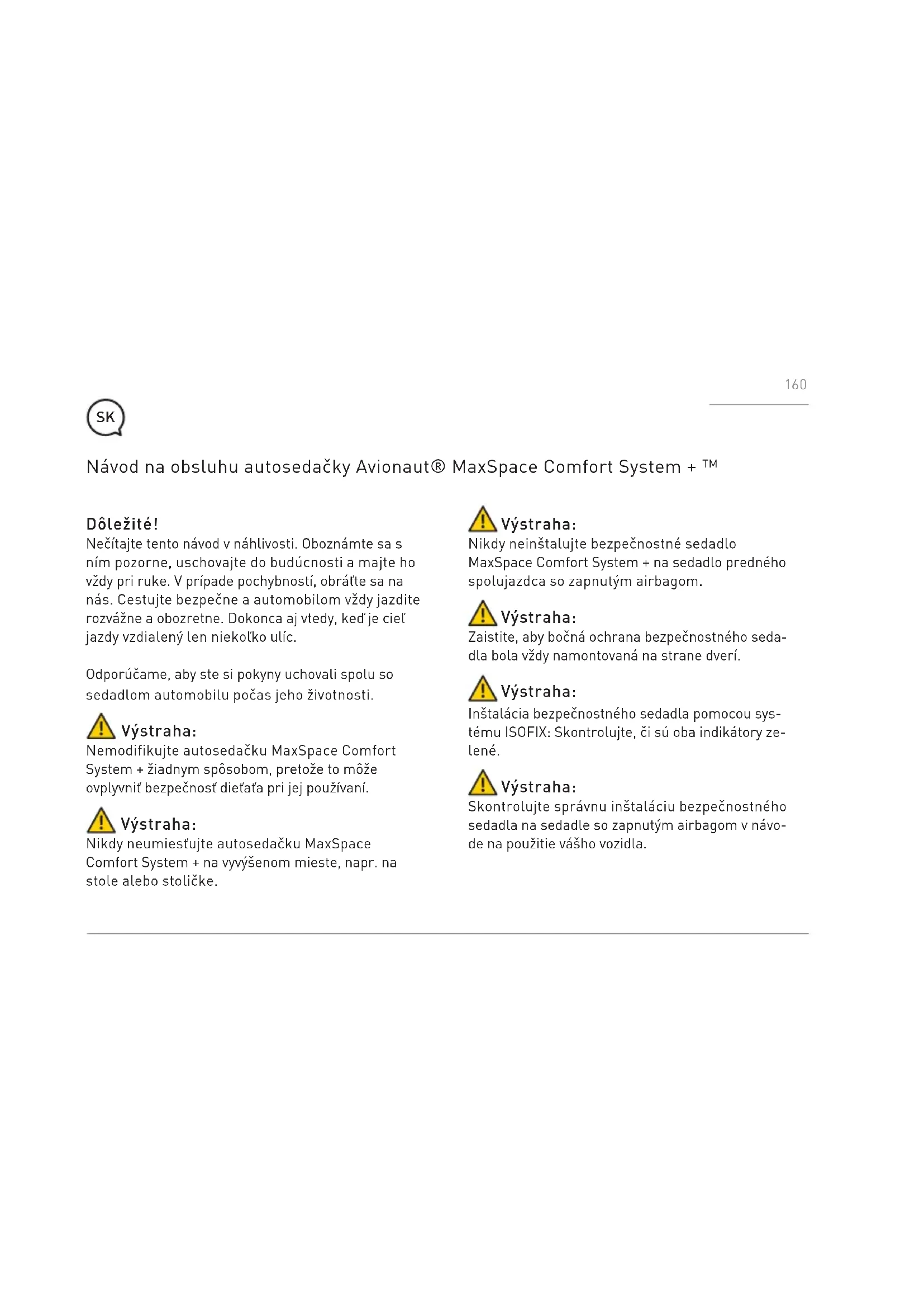 - Denna garanti har utarbetats av Ł.KARWALA som är registrerat i Polen. 158Företagets adress är: Ł.KARWALA Szarlejka, ul. Lukaszewicza 172 42-130 Wreczyca Wielka, Polska (1) Köpta produkter med borttagna eller ändrade etiketter eller identifikationsnummer anses vara icke godkända. På grund av att äktheten hos sådana produkter inte kan fastställas gäller garantin inte dem. 159Dôležité! Nečítajte tento návod v náhlivosti. Oboznámte sa s ním pozorne, uschovajte do budúcnosti a majte ho vždy pri ruke. V prípade pochybností, obráťte sa na nás. Cestujte bezpečne a automobilom vždy jazdite rozvážne a obozretne. Dokonca aj vtedy, keď je cieľ jazdy vzdialený len niekoľko ulíc. Odporúčame, aby ste si pokyny uchovali spolu so sedadlom automobilu počas jeho životnosti. Výstraha: Nemodifikujte autosedačku MaxSpace Comfort System + žiadnym spôsobom, pretože to môže ovplyvniť bezpečnosť dieťaťa pri jej používaní. Výstraha: Nikdy neumiesťujte autosedačku MaxSpace Comfort System + na vyvýšenom mieste, napr. na stole alebo stoličke. Návod na obsluhu autosedačky Avionaut® MaxSpace Comfort System + ™ Výstraha: Nikdy neinštalujte bezpečnostné sedadlo MaxSpace Comfort System + na sedadlo predného spolujazdca so zapnutým airbagom. Výstraha: Zaistite, aby bočná ochrana bezpečnostného seda- dla bola vždy namontovaná na strane dverí. Výstraha: Inštalácia bezpečnostného sedadla pomocou sys- tému ISOFIX: Skontrolujte, či sú oba indikátory ze- lené. Výstraha: Skontrolujte správnu inštaláciu bezpečnostného sedadla na sedadle so zapnutým airbagom v návo- de na použitie vášho vozidla.