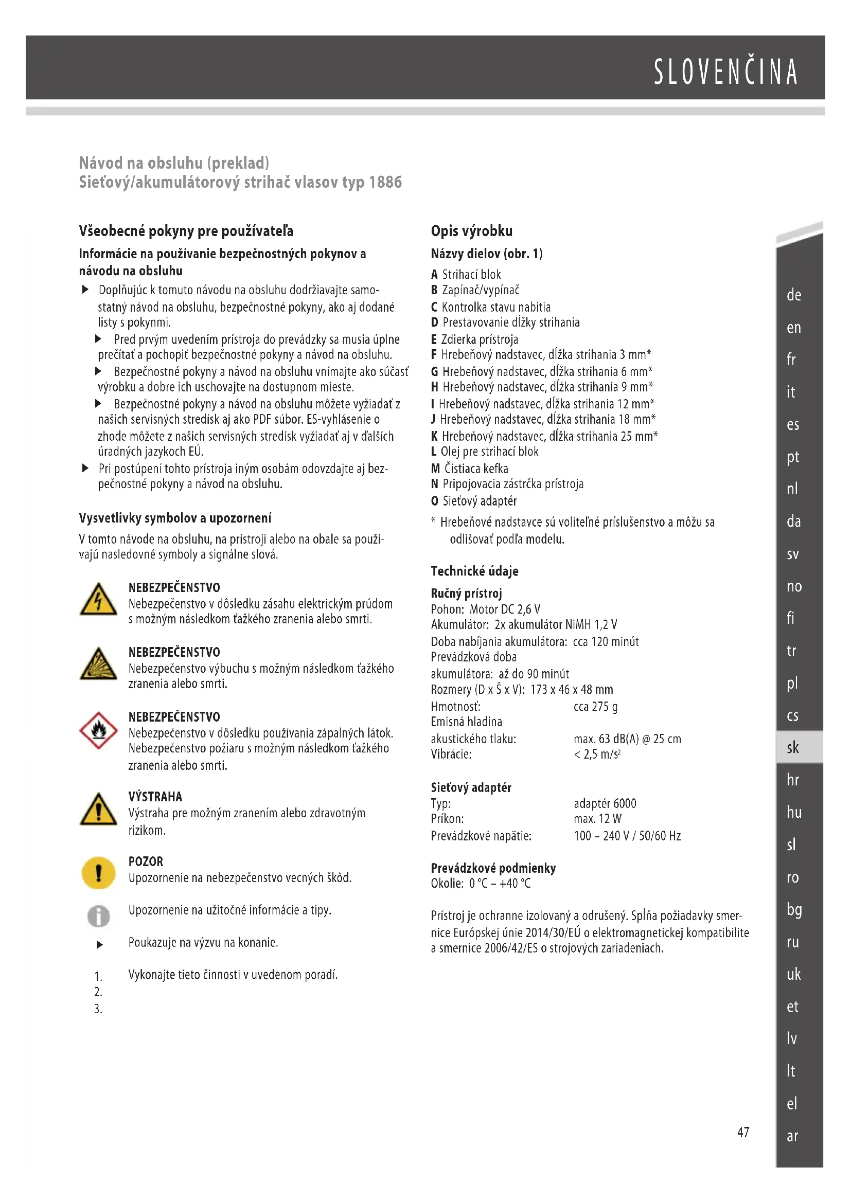 Návod na obsluhu (preklad) Sieťový/akumulátorový strihač vlasov typ 1886 Všeobecné pokyny pre používateľa Informácie na používanie bezpečnostných pokynov a návodu na obsluhu f Doplňujúc k tomuto návodu na obsluhu dodržiavajte samo- statný návod na obsluhu, bezpečnostné pokyny, ako aj dodané listy s pokynmi. f Pred prvým uvedením prístroja do prevádzky sa musia úplne prečítať a pochopiť bezpečnostné pokyny a návod na obsluhu. f Bezpečnostné pokyny a návod na obsluhu vnímajte ako súčasť výrobku a dobre ich uschovajte na dostupnom mieste. f Bezpečnostné pokyny a návod na obsluhu môžete vyžiadať z našich servisných stredísk aj ako PDF súbor. ES-vyhlásenie o zhode môžete z našich servisných stredísk vyžiadať aj v ďalších úradných jazykoch EÚ. f Pri postúpení tohto prístroja iným osobám odovzdajte aj bez- pečnostné pokyny a návod na obsluhu. Vysvetlivky symbolov a upozornení V tomto návode na obsluhu, na prístroji alebo na obale sa použí- vajú nasledovné symboly a signálne slová. NEBEZPEČENSTVO Nebezpečenstvo v dôsledku zásahu elektrickým prúdom s možným následkom ťažkého zranenia alebo smrti. NEBEZPEČENSTVO Nebezpečenstvo výbuchu s možným následkom ťažkého zranenia alebo smrti. NEBEZPEČENSTVO Nebezpečenstvo v dôsledku používania zápalných látok. Nebezpečenstvo požiaru s možným následkom ťažkého zranenia alebo smrti. VÝSTRAHA Výstraha pre možným zranením alebo zdravotným rizikom. POZOR Upozornenie na nebezpečenstvo vecných škôd. Upozornenie na užitočné informácie a tipy. Poukazuje na výzvu na konanie. Vykonajte tieto činnosti v uvedenom poradí.