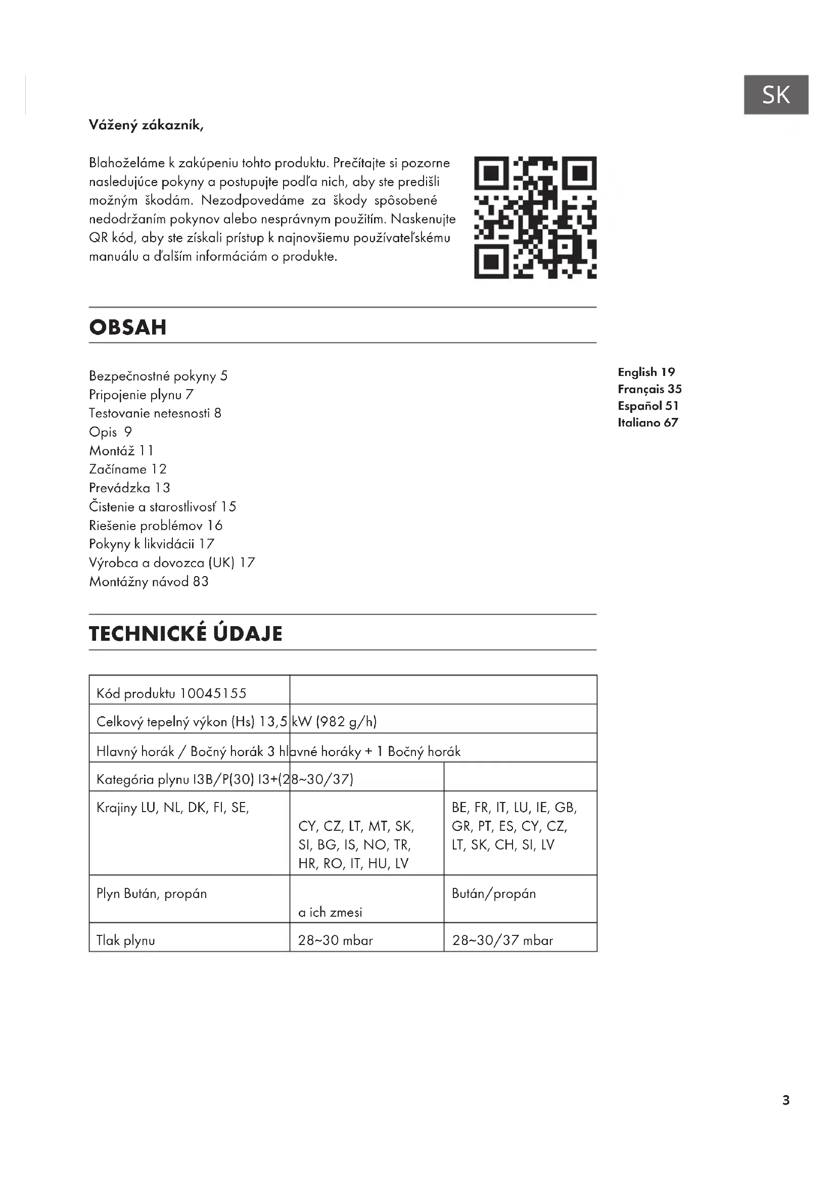 Vážený zákazník, Blahoželáme k zakúpeniu tohto produktu. Prečítajte si pozorne nasledujúce pokyny a postupujte podľa nich, aby ste predišli možným škodám. Nezodpovedáme za škody spôsobené nedodržaním pokynov alebo nesprávnym použitím. Naskenujte QR kód, aby ste získali prístup k najnovšiemu používateľskému manuálu a ďalším informáciám o produkte. OBSAH Bezpečnostné pokyny5 Pripojenie plynu7 Testovanie netesnosti8 Opis 9 Montáž11 Začíname12 Prevádzka13 Čistenie a starostlivosť15 Riešenie problémov16 Pokyny k likvidácii17 Výrobca a dovozca (UK)17 Montážny návod83 TECHNICKÉ ÚDAJE Kód produktu 10045155 Celkový tepelný výkon (Hs) 13,5 kW (982 g/h) Hlavný horák / Bočný horák 3 hlavné horáky + 1 Bočný horák Kategória plynu I3B/P(30) I3+(28~30/37) Krajiny LU, NL, DK, FI, SE, CY, CZ, LT, MT, SK, SI, BG, IS, NO, TR, HR, RO, IT, HU, LV BE, FR, IT, LU, IE, GB, GR, PT, ES, CY, CZ, LT, SK, CH, SI, LV Plyn Bután, propán a ich zmesi Bután/propán Tlak plynu 28~30mbar 28~30/37mbar English 19 Français 35 Español 51 Italiano 674