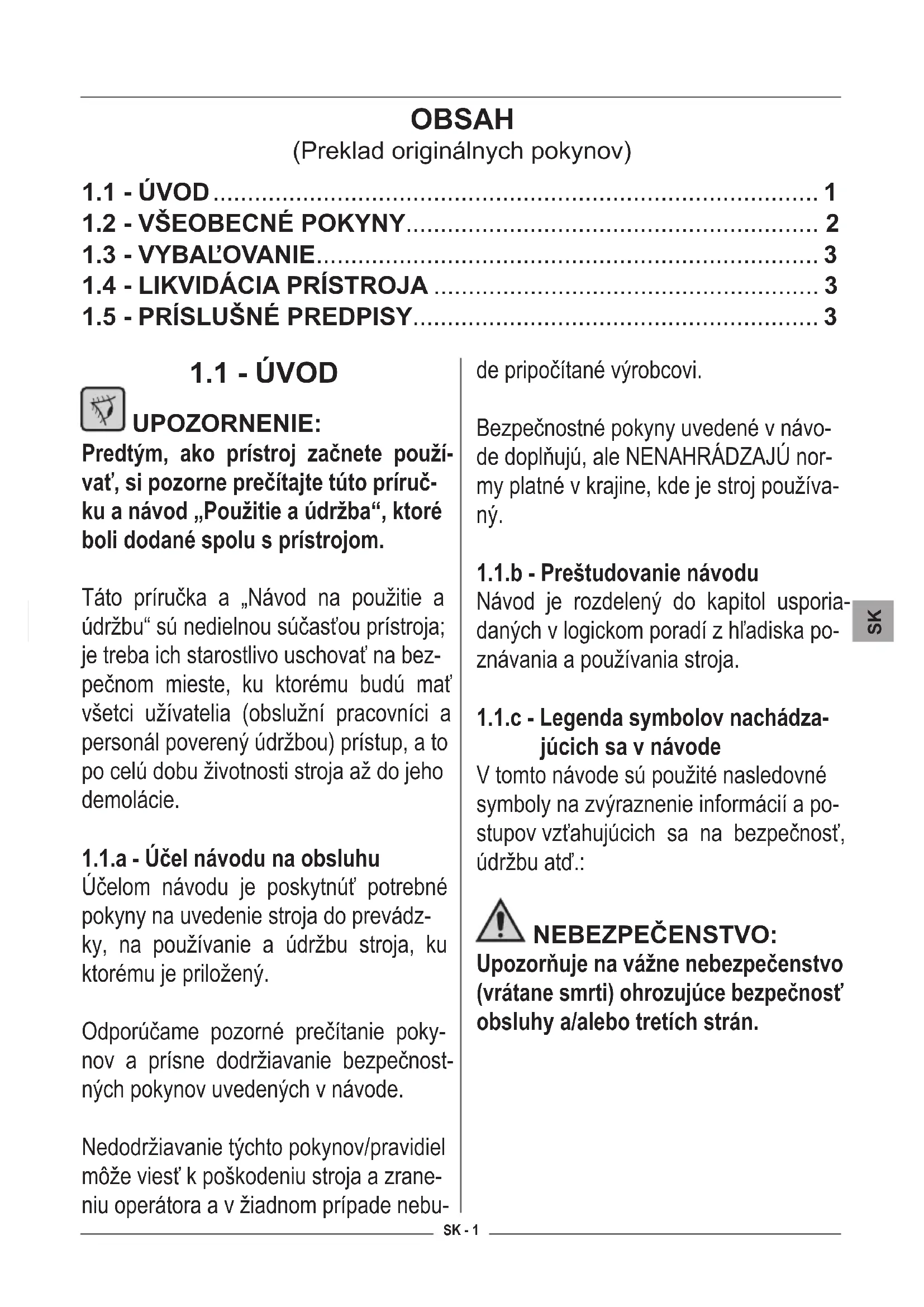 Účelom návodu je poskytnúť potrebné pokyny na uvedenie stroja do prevádz- ky, na používanie a údržbu stroja, ku ktorému je priložený. Odporúčame pozorné prečítanie poky- nov a prísne dodržiavanie bezpečnost- ných pokynov uvedených v návode. Nedodržiavanie týchto pokynov/pravidiel môže viesť k poškodeniu stroja a zrane- niu operátora a v žiadnom prípade nebu- de pripočítané výrobcovi. Bezpečnostné pokyny uvedené v návo- de doplňujú, ale NENAHRÁDZAJÚ nor- my platné v krajine, kde je stroj používa- ný.