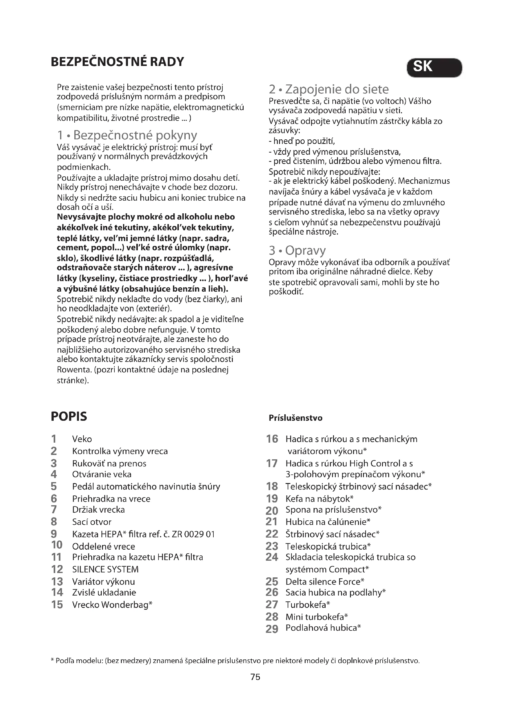 SK76 1 • Vybalenie Prístroj vybaľte a odstráňte z neho všetky prípadné nálepky, uschovajte si záručný list a prečítajte si pozorne návod na použitie pred tým, než prístroj prvýkrát použijete. 2 • Rady a bezpečnostné odporucanla Pred každým použitím musí byť prívodná šnúra celkom odvinutá. Nenechajte prívodnú šnúru zachytiť či prechádzať cez ostré hrany. Pokiaľ používate predlžovaciu šnúru, presvedčte sa, že je v perfektnom stave a zodpovedá napätiu vašej elektrickej inštalácie. Po každom použití vypnite prístroj a vytiahnite sieťovú šnúru. Nikdy vysávač neuvádzajte do prevádzky bez vreca a bez ltračného systému (kazeta). Tento prístroj je kvôli tomu vybavený bezpečnostným systémom, ktorý upozorňuje na neprítomnosť kazety ltra HEPA. Nepohybujte s vysávačom ťahaním za prívodný kábel. Pri premiestňovaní uchopte vysávač za držadlo. Nikdy prístroj nedvíhajte ťahaním za prívodnú šnúru. Vždy pred údržbou a čistením vypnite prístroj a vytiahnite vidlicu prívodnej šnúry zo zásuvky. Používajte iba vrecká a ltre od rmy Rowenta alebo Wonderbag. Používajte iba príslušenstvo od rmy Rowenta. Skontrolujte, či všetky ltre sú na svojom mieste. V prípade ťažkostí so zaobstaraním príslušenstva a ltrov pre tento vysávač sa obráťte na zákaznícky servis rmy Rowenta (pozri kontaktné údaje na poslednej stránke). Tento prístroj nesmú používať osoby (vrátane detí), ktoré majú zníženú fyzickú, senzorickú alebo mentálnu schopnosť, alebo osoby, ktoré nemajú na to skúsenosti alebo vedomosti, okrem prípadov, keď im pri tom pomáha osoba zodpovedná za ich bezpečnosť, dozor alebo osoba, ktorá ich vopred poučí o používaní tohto prístroja. Je vhodné dohliadať na deti, aby ste si boli istí, že sa s týmto prístrojom nehrajú. PRED PRVÝM POUŽITíM