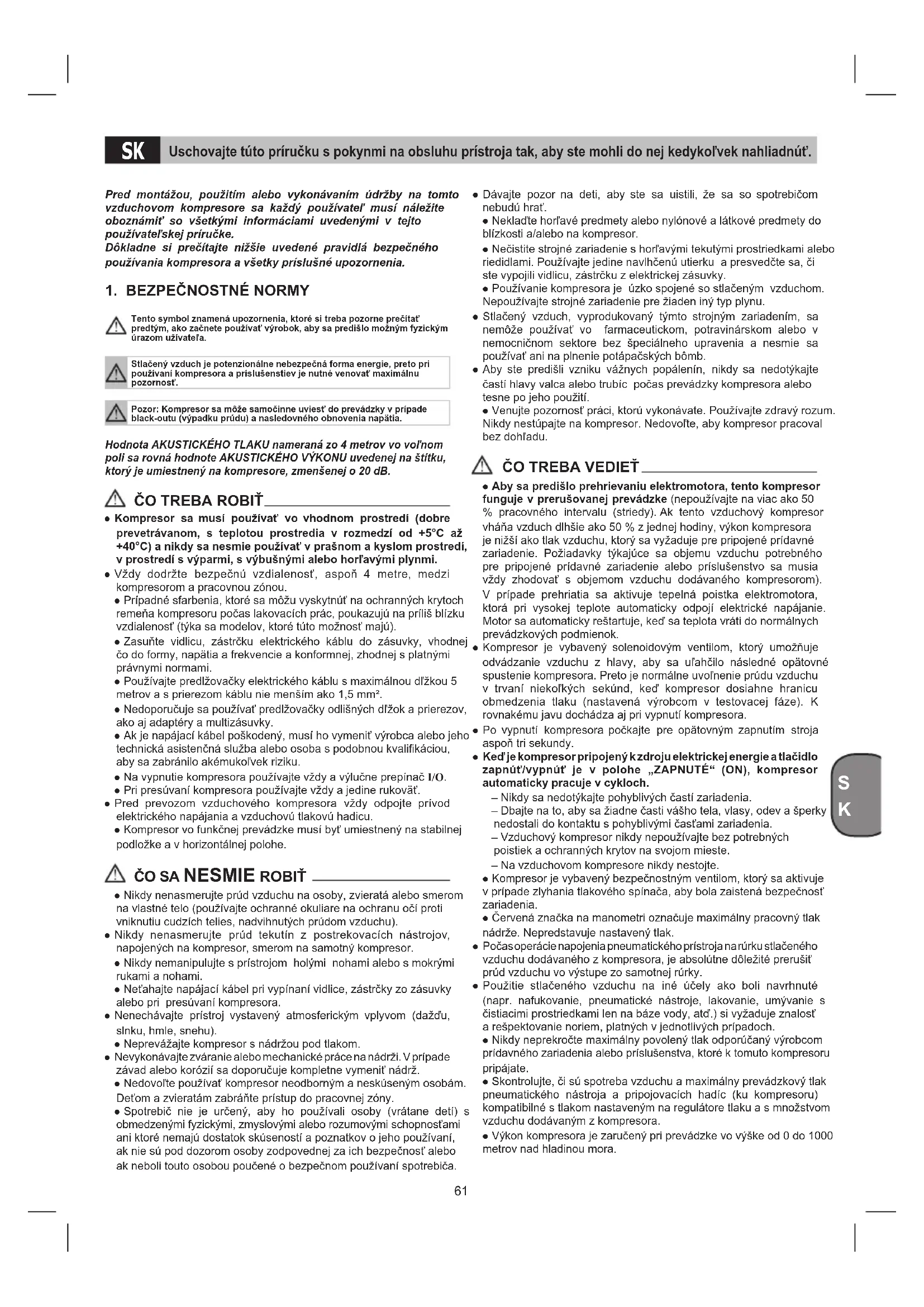 ● Aby sa predišlo prehrievaniu elektromotora, tento kompresor funguje v prerušovanej prevádzke (nepoužívajte na viac ako 50 % pracovného intervalu (striedy). Ak tento vzduchový kompresor vháňa vzduch dlhšie ako 50 % z jednej hodiny, výkon kompresora je nižší ako tlak vzduchu, ktorý sa vyžaduje pre pripojené prídavné zariadenie. Požiadavky týkajúce sa objemu vzduchu potrebného pre pripojené prídavné zariadenie alebo príslušenstvo sa musia vždy zhodovať s objemom vzduchu dodávaného kompresorom). V prípade prehriatia sa aktivuje tepelná poistka elektromotora, ktorá pri vysokej teplote automaticky odpojí elektrické napájanie. Motor sa automaticky reštartuje, keď sa teplota vráti do normálnych prevádzkových podmienok. ● Kompresor je vybavený solenoidovým ventilom, ktorý umožňuje odvádzanie vzduchu z hlavy, aby sa uľahčilo následné opätovné spustenie kompresora. Preto je normálne uvoľnenie prúdu vzduchu v trvaní niekoľkých sekúnd, keď kompresor dosiahne hranicu obmedzenia tlaku (nastavená výrobcom v testovacej fáze). K rovnakému javu dochádza aj pri vypnutí kompresora. ● Po vypnutí kompresora počkajte pre opätovným zapnutím stroja aspoň tri sekundy. ● Keď je kompresor pripojený k zdroju elektrickej energie a tlačidlo zapnúť/vypnúť je v polohe „ZAPNUTÉ“ (ON), kompresor automaticky pracuje v cykloch. – Nikdy sa nedotýkajte pohyblivých častí zariadenia. – Dbajte na to, aby sa žiadne časti vášho tela, vlasy, odev a šperky nedostali do kontaktu s pohyblivými časťami zariadenia. – Vzduchový kompresor nikdy nepoužívajte bez potrebných poistiek a ochranných krytov na svojom mieste. – Na vzduchovom kompresore nikdy nestojte. ● Kompresor je vybavený bezpečnostným ventilom, ktorý sa aktivuje v prípade zlyhania tlakového spínača, aby bola zaistená bezpečnosť zariadenia. ● Červená značka na manometri označuje maximálny pracovný tlak nádrže. Nepredstavuje nastavený tlak. ● Počas operácie napojenia pneumatického prístroja na rúrku stlačeného vzduchu dodávaného z kompresora, je absolútne dôležité prerušiť prúd vzduchu vo výstupe zo samotnej rúrky. ● Použitie stlačeného vzduchu na iné účely ako boli navrhnuté (napr. nafukovanie, pneumatické nástroje, lakovanie, umývanie s čistiacimi prostriedkami len na báze vody, atď.) si vyžaduje znalosť a rešpektovanie noriem, platných v jednotlivých prípadoch. ● Nikdy neprekročte maximálny povolený tlak odporúčaný výrobcom prídavného zariadenia alebo príslušenstva, ktoré k tomuto kompresoru pripájate. ● Skontrolujte, či sú spotreba vzduchu a maximálny prevádzkový tlak pneumatického nástroja a pripojovacích hadíc (ku kompresoru) kompatibilné s tlakom nastaveným na regulátore tlaku a s množstvom vzduchu dodávaným z kompresora. ● Výkon kompresora je zaručený pri prevádzke vo výške od 0 do 1000 metrov nad hladinou mora. Uschovajte túto príručku s pokynmi na obsluhu prístroja tak, aby ste mohli do nej kedykoľvek nahliadnúť. SK62
