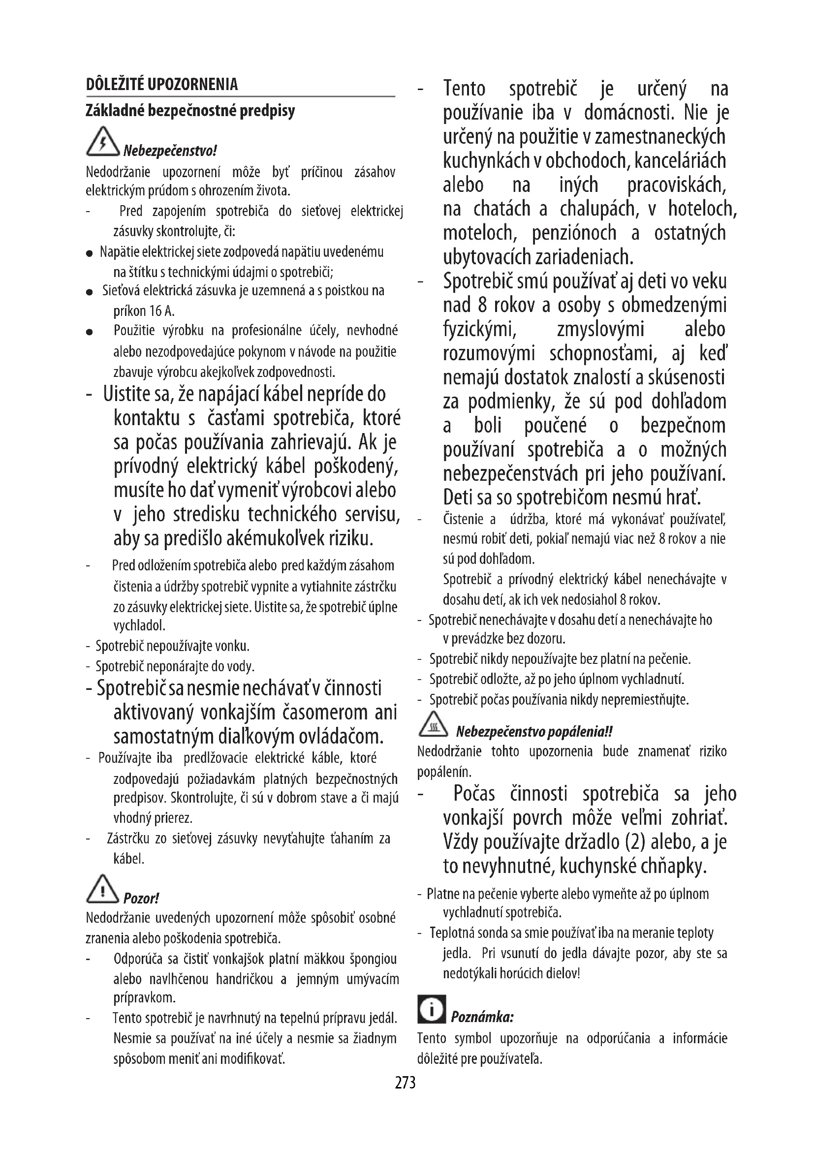 Základné bezpečnostné predpisy Nebezpečenstvo! Nedodržanie upozornení môže byť príčinou zásahov elektrickým prúdom sohrozením života. - Pred zapojením spotrebiča do sieťovej elektrickej zásuvky skontrolujte, či: ● Napätie elektrickej siete zodpovedá napätiu uvedenému na štítku s technickými údajmi o spotrebiči; ● Sieťová elektrická zásuvka je uzemnená aspoistkou na príkon 16A. ● Použitie výrobku na profesionálne účely, nevhodné alebo nezodpovedajúce pokynom vnávode na použitie zbavuje výrobcu akejkoľvek zodpovednosti. - Uistite sa, že napájací kábel nepríde do kontaktu s časťami spotrebiča, ktoré sa počas používania zahrievajú. Ak je prívodný elektrický kábel poškodený, musíte ho dať vymeniť výrobcovi alebo v jeho stredisku technického servisu, aby sa predišlo akémukoľvek riziku. - Pred odložením spotrebiča alebo pred každým zásahom čistenia aúdržby spotrebič vypnite avytiahnite zástrčku zo zásuvky elektrickej siete. Uistite sa, že spotrebič úplne vychladol. - Spotrebič nepoužívajte vonku. - Spotrebič neponárajte do vody. - Spotrebič sa nesmie nechávať včinnosti aktivovaný vonkajším časomerom ani samostatným diaľkovým ovládačom. - Používajte iba predlžovacie elektrické káble, ktoré zodpovedajú požiadavkám platných bezpečnostných predpisov. Skontrolujte, či sú v dobrom stave a či majú vhodný prierez. - Zástrčku zo sieťovej zásuvky nevyťahujte ťahaním za kábel. Pozor! Nedodržanie uvedených upozornení môže spôsobiť osobné zranenia alebo poškodenia spotrebiča. - Odporúča sa čistiť vonkajšok platní mäkkou špongiou alebo navlhčenou handričkou a jemným umývacím prípravkom. - Tento spotrebič je navrhnutý na tepelnú prípravu jedál. Nesmie sa používať na iné účely anesmie sa žiadnym spôsobom meniť ani modikovať. - Tento spotrebič je určený na používanie iba v domácnosti. Nie je určený napoužitie vzamestnaneckých kuchynkách vobchodoch, kanceláriách alebo na iných pracoviskách, na chatách a chalupách, v hoteloch, moteloch, penziónoch a ostatných ubytovacích zariadeniach. - Spotrebič smú používať aj deti vo veku nad 8rokov aosoby sobmedzenými fyzickými, zmyslovými alebo rozumovými schopnosťami, aj keď nemajú dostatok znalostí askúsenosti za podmienky, že sú pod dohľadom a boli poučené o bezpečnom používaní spotrebiča a o možných nebezpečenstvách pri jeho používaní. Deti sa so spotrebičom nesmú hrať. - Čistenie a údržba, ktoré má vykonávať používateľ, nesmú robiť deti, pokiaľ nemajú viac než 8rokov anie sú pod dohľadom. Spotrebič a prívodný elektrický kábel nenechávajte v dosahu detí, ak ich vek nedosiahol 8 rokov. - Spotrebič nenechávajte v dosahu detí a nenechávajte ho v prevádzke bez dozoru. - Spotrebič nikdy nepoužívajte bez platní na pečenie. - Spotrebič odložte, až po jeho úplnom vychladnutí. - Spotrebič počas používania nikdy nepremiestňujte. Nebezpečenstvo popálenia!! Nedodržanie tohto upozornenia bude znamenať riziko popálenín. - Počas činnosti spotrebiča sa jeho vonkajší povrch môže veľmi zohriať. Vždy používajte držadlo (2) alebo, a je to nevyhnutné, kuchynské chňapky. - Platne na pečenie vyberte alebo vymeňte až po úplnom vychladnutí spotrebiča. - Teplotná sonda sa smie používať iba na meranie teploty jedla. Pri vsunutí do jedla dávajte pozor, aby ste sa nedotýkali horúcich dielov! Poznámka: Tento symbol upozorňuje na odporúčania a informácie dôležité pre používateľa.274 - Potraviny nepripravujte zabalené do plastovej fólie, do alobalu ani do polyetylénových vreciek, aby ste predišli riziku požiaru. - Po čistení, pred opätovným vložením platní na pečenie do spotrebiča, ich nechajte úplne vysušiť. Tento spotrebič spĺňa požiadavky Nariadenia (ES) č. 1935/2004 o materiáloch a predmetoch určených na styk spotravinami. Likvidácia spotrebiča Spotrebič sa nesmie likvidovať spolu skomunálnym odpadom, ale musí sa odovzdať vzbernom stredisku na separovaný zber odpadu. OPIS