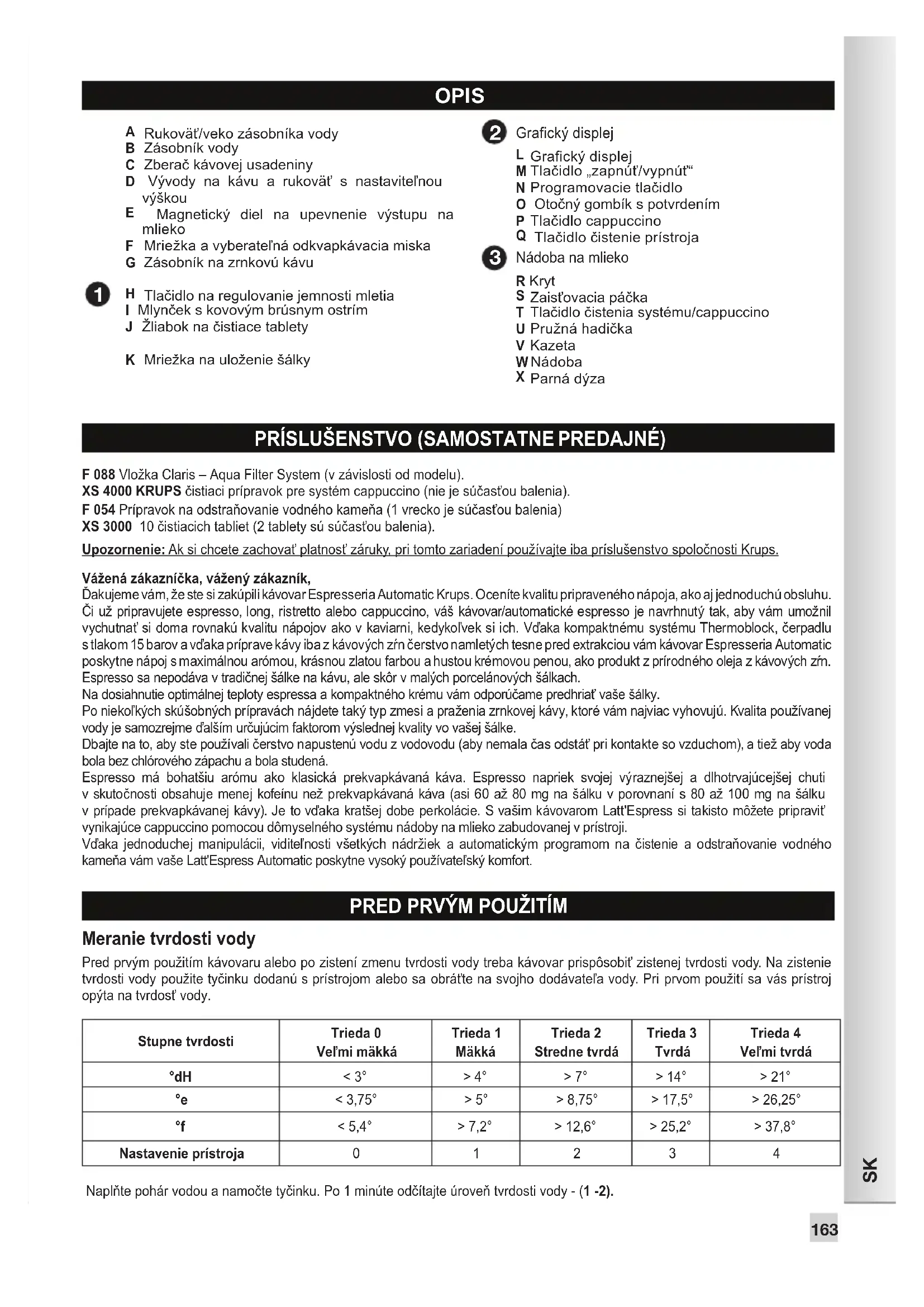 Parná dýza PRÍSLUŠENSTVO (SAMOSTATNE PREDAJNÉ) F 088 Vložka Claris – Aqua Filter System (v závislosti od modelu). XS 4000 KRUPS čistiaci prípravok pre systém cappuccino (nie je súčasťou balenia). F 054 Prípravok na odstraňovanie vodného kameňa (1 vrecko je súčasťou balenia) XS 3000 10 čistiacich tabliet (2 tablety sú súčasťou balenia). Upozornenie: Ak si chcete zachovať platnosť záruky, pri tomto zariadení používajte iba príslušenstvo spoločnosti Krups. Vážená zákazníčka, vážený zákazník, Ďakujeme vám, že ste si zakúpili kávovar Espresseria Automatic Krups. Oceníte kvalitu pripraveného nápoja, ako aj jednoduchú obsluhu. Či už pripravujete espresso, long, ristretto alebo cappuccino, váš kávovar/automatické espresso je navrhnutý tak, aby vám umožnil vychutnať si doma rovnakú kvalitu nápojov ako v kaviarni, kedykoľvek si ich. Vďaka kompaktnému systému Thermoblock, čerpadlu s tlakom 15 barov a vďaka príprave kávy iba z kávových zŕn čerstvo namletých tesne pred extrakciou vám kávovar Espresseria Automatic poskytne nápoj s maximálnou arómou, krásnou zlatou farbou a hustou krémovou penou, ako produkt z prírodného oleja z kávových zŕn. Espresso sa nepodáva v tradičnej šálke na kávu, ale skôr v malých porcelánových šálkach. Na dosiahnutie optimálnej teploty espressa a kompaktného krému vám odporúčame predhriať vaše šálky. Po niekoľkých skúšobných prípravách nájdete taký typ zmesi a praženia zrnkovej kávy, ktoré vám najviac vyhovujú. Kvalita používanej vody je samozrejme ďalším určujúcim faktorom výslednej kvality vo vašej šálke. Dbajte na to, aby ste používali čerstvo napustenú vodu z vodovodu (aby nemala čas odstáť pri kontakte so vzduchom), a tiež aby voda bola bez chlórového zápachu a bola studená. Espresso má bohatšiu arómu ako klasická prekvapkávaná káva. Espresso napriek svojej výraznejšej a dlhotrvajúcejšej chuti v skutočnosti obsahuje menej kofeínu než prekvapkávaná káva (asi 60 až 80 mg na šálku v porovnaní s 80 až 100 mg na šálku v prípade prekvapkávanej kávy). Je to vďaka kratšej dobe perkolácie. S vašim kávovarom Latt'Espress si takisto môžete pripraviť vynikajúce cappuccino pomocou dômyselného systému nádoby na mlieko zabudovanej v prístroji. Vďaka jednoduchej manipulácii, viditeľnosti všetkých nádržiek a automatickým programom na čistenie a odstraňovanie vodného kameňa vám vaše Latt'Espress Automatic poskytne vysoký používateľský komfort.