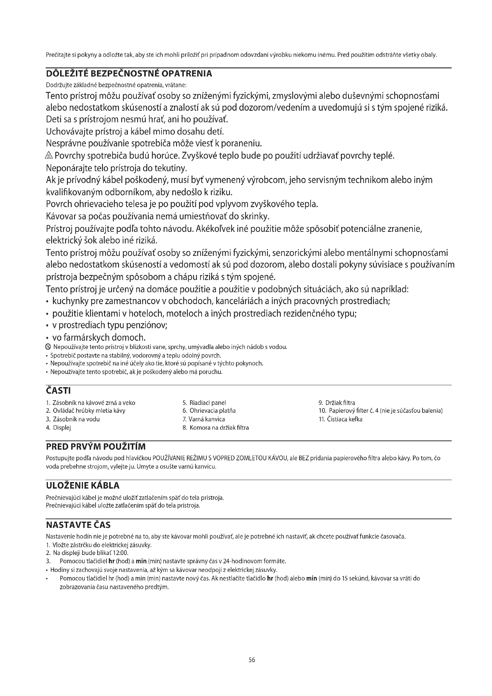 Dodržujte základné bezpečnostné opatrenia, vrátane: Tento prístroj môžu používať osoby so zníženými fyzickými, zmyslovými alebo duševnými schopnosťami alebo nedostatkom skúseností a znalostí ak sú pod dozorom/vedením a uvedomujú si s tým spojené riziká. Deti sa s prístrojom nesmú hrať, ani ho používať. Uchovávajte prístroj a kábel mimo dosahu detí. Nesprávne používanie spotrebiča môže viesť k poraneniu. h Povrchy spotrebiča budú horúce. Zvyškové teplo bude po použití udržiavať povrchy teplé. Neponárajte telo prístroja do tekutiny. Ak je prívodný kábel poškodený, musí byť vymenený výrobcom, jeho servisným technikom alebo iným kvalikovaným odborníkom, aby nedošlo k riziku. Povrch ohrievacieho telesa je po použití pod vplyvom zvyškového tepla. Kávovar sa počas používania nemá umiestňovať do skrinky. Prístroj používajte podľa tohto návodu. Akékoľvek iné použitie môže spôsobiť potenciálne zranenie, elektrický šok alebo iné riziká. Tento prístroj môžu používať osoby so zníženými fyzickými, senzorickými alebo mentálnymi schopnosťami alebo nedostatkom skúseností a vedomostí ak sú pod dozorom, alebo dostali pokyny súvisiace s používaním prístroja bezpečným spôsobom a chápu riziká s tým spojené. Tento prístroj je určený na domáce použitie a použitie v podobných situáciách, ako sú napríklad:
