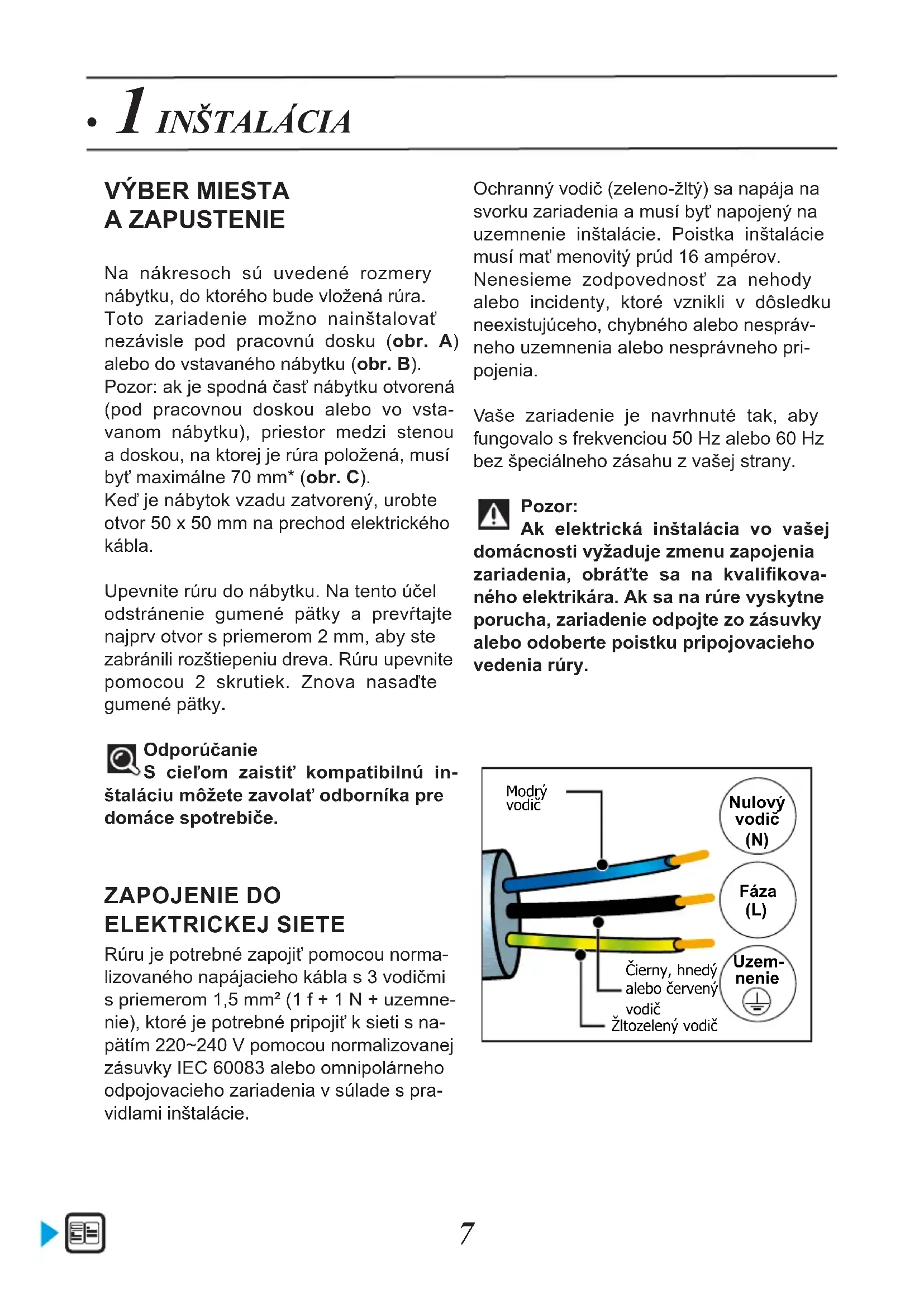 A ZAPUSTENIE Na nákresoch sú uvedené rozmery nábytku, do ktorého bude vložená rúra.Toto zariadenie možno nainštalovať nezávisle pod pracovnú dosku (obr. A) alebo do vstavaného nábytku (obr. B). Pozor: ak je spodná časť nábytku otvorená (pod pracovnou doskou alebo vo vsta-vanom nábytku), priestor medzi stenou a doskou, na ktorej je rúra položená, musí byť maximálne 70 mm* (obr. C).Keď je nábytok vzadu zatvorený, urobte otvor 50 x 50 mm na prechod elektrického kábla.Upevnite rúru do nábytku. Na tento účel odstránenie gumené pätky a prevŕtajte najprv otvor s priemerom 2 mm, aby ste zabránili rozštiepeniu dreva. Rúru upevnite pomocou 2 skrutiek. Znova nasaďte gumené pätky.Odporúčanie S cieľom zaistiť kompatibilnú in-štaláciu môžete zavolať odborníka pre domáce spotrebiče. ZAPOJENIE DO ELEKTRICKEJ SIETE Rúru je potrebné zapojiť pomocou norma-lizovaného napájacieho kábla s 3 vodičmi s priemerom 1,5 mm² (1 f + 1 N + uzemne-nie), ktoré je potrebné pripojiť k sieti s na-pätím 220~240 V pomocou normalizovanej zásuvky IEC 60083 alebo omnipolárneho odpojovacieho zariadenia v súlade s pra-vidlami inštalácie.Ochranný vodič (zeleno-žltý) sa napája na svorku zariadenia a musí byť napojený na uzemnenie inštalácie. Poistka inštalácie musí mať menovitý prúd 16 ampérov.Nenesieme zodpovednosť za nehody alebo incidenty, ktoré vznikli v dôsledku neexistujúceho, chybného alebo nespráv-neho uzemnenia alebo nesprávneho pri-pojenia. Vaše zariadenie je navrhnuté tak, aby fungovalo s frekvenciou 50 Hz alebo 60 Hz bez špeciálneho zásahu z vašej strany.Pozor: Ak elektrická inštalácia vo vašej domácnosti vyžaduje zmenu zapojenia zariadenia, obráťte sa na kvalikova-ného elektrikára. Ak sa na rúre vyskytne porucha, zariadenie odpojte zo zásuvky alebo odoberte poistku pripojovacieho vedenia rúry. Modrý vodič Nulový vodič (N) Fáza (L) Čierny, hnedý alebo červený vodič Žltozelený vodič Uzem-nenie8