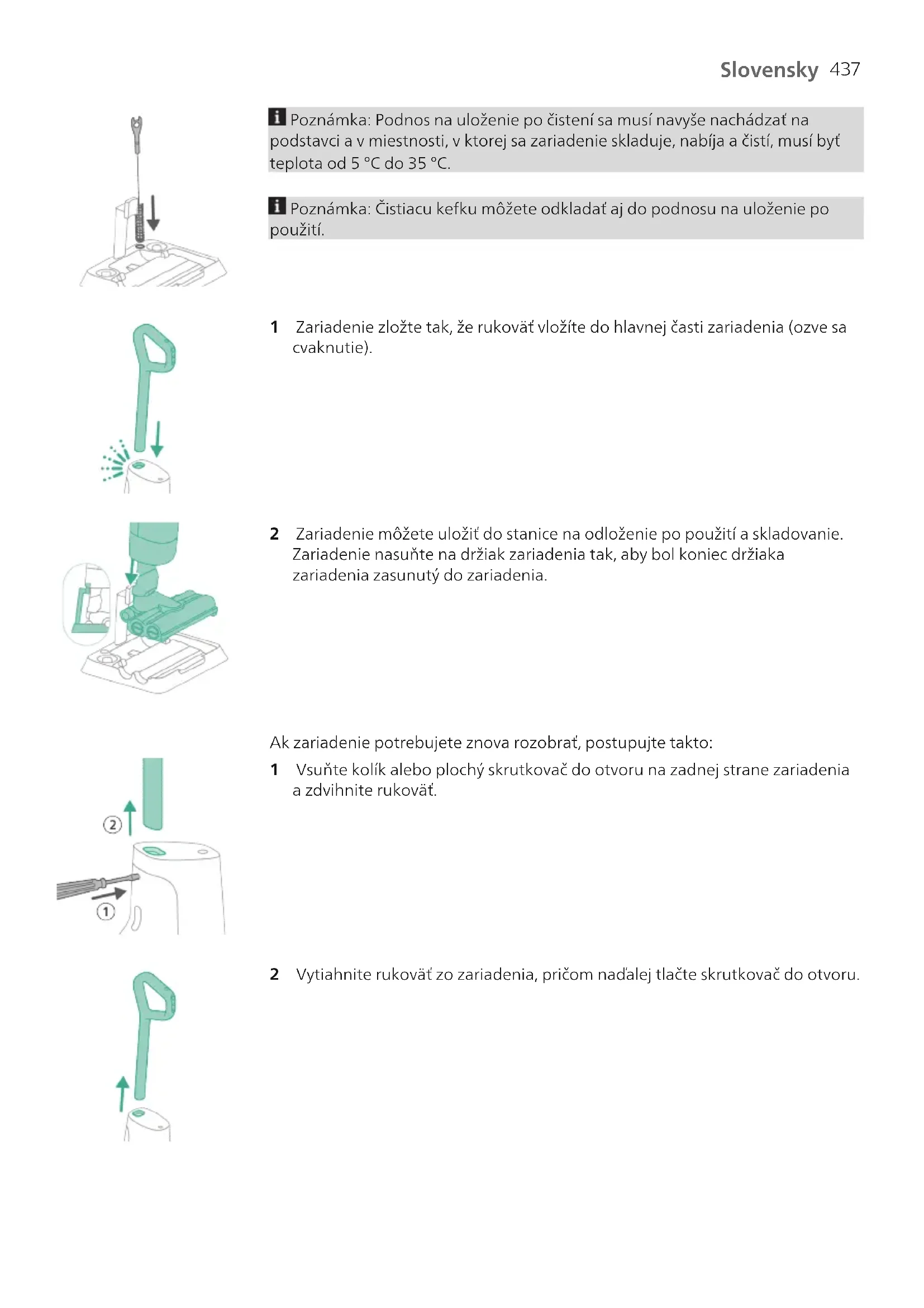 Pri čistení nedvíhajte hubicu AquaSpin z podlahy, nepohybujte s ňou do strán a nevykonávajte prudké zmeny smeru, pretože by za sebou zanechávala vodu. Poznámka: Čas prevádzky závisí od úrovne výkonu použitého pri čistení.443 Slovensky Čistenie zariadenia Automatické čistenie (AUTOCLEAN) po každom použití Aby ste zabránili zápachu a usadzovaniu vodného kameňa, používajte po každom použití funkciu automatického čistenia – AUTOCLEAN. Režim AUTOCLEAN umožňuje vyčistiť celé zariadenie približne za 4 minúty. 1 Vložte zariadenie do stanice na odloženie po použití askladovanie. Zariadenie nasuňte na držiak zariadenia tak, aby bol koniec držiaka zariadenia zasunutý do zariadenia. Poznámka: Vyprázdnite nádobu na špinavú vodu, ak je hladina vody nad značkou AUTOCLEAN. Vopačnom prípade môžete vynechať nasledujúce kroky aprejsť na 6.krok. 2 Stlačením tlačidla uvoľnite zásobník na špinavú vodu a vyberte ho. 3 Vyberte mokrý filter zo zásobníka na špinavú vodu.444 Slovensky 4 Vodu zo zásobníka na špinavú vodu vylejte do umývadla. 5 Mokrý filter vložte späť do zásobníka na špinavú vodu. 6 Naplňte nádobu na čistú vodu, ak je hladina vody pod značkou AUTOCLEAN. Vopačnom prípade môžete vynechať nasledujúce kroky aprejsť na 12.krok. 7 Vložte prázdny zásobník na špinavú vodu späť do zariadenia a vyberte zásobník na čistú vodu. 8 Otvorte tesniaci uzáver na nádobe na čistú vodu.445 Slovensky 9 Zásobník na čistú vodu naplňte aspoň po značku AUTOCLEAN studenou alebo vlažnou vodou z vodovodu. Výstraha: Do zásobníka na čistú vodu nikdy nenalievajte vodu z vodovodu, ktorej teplota presahuje 50 °C. Výstraha: Funkciu AUTOCLEAN nepoužívajte s čistiacim prostriedkom, pretože by mohlo dôjsť k nadmernému peneniu. 10 Uzavrite nádobu na čistú vodu tesniacim uzáverom. 11 Nasaďte zásobník na čistú vodu späť do zariadenia. 12 Nabite zariadenie. Zapojte napájaciu zástrčku do konektora na zadnej strane zariadenia. Potom zasuňte adaptér do sieťovej zásuvky.446 Slovensky 13 Spustite cyklus AUTOCLEAN stlačením tlačidla AUTOCLEAN . Ak je displej čierny, najprv displej aktivujte stlačením tlačidla zap./vyp. . 14 Zariadenie vykoná čistiaci cyklus AUTOCLEAN. Poznámka: Cyklus AUTOCLEAN trvá približne 4 minúty. Najlepšie výsledky dosiahnete, keď necháte cyklus AUTOCLEAN prebehnúť až do konca. Cyklus AUTOCLEAN môžete kedykoľvek pozastaviť alebo zrušiť. Poznámka: Ak zrušíte program AUTOCLEAN, zariadenie bude asi 10 sekúnd vysávať zostávajúcu vodu v podnose na uloženie po čistení. 15 Stlačením tlačidla uvoľnite zásobník na špinavú vodu a vyberte ho. 16 Vyberte mokrý filter zo zásobníka na špinavú vodu.447 Slovensky 17 Vodu zo zásobníka na špinavú vodu vylejte do umývadla. 18 Zásobník na špinavú vodu vyčistite pod tečúcou vodou. 19 Mokrý filter vyčistite pod tečúcou vodou. 20 Pred nasadením späť na zásobník na špinavú vodu nechajte mokrý filter nádržky a jeho prietokový prvok úplne vyschnúť. 21 Mokrý filter vložte späť do zásobníka na špinavú vodu.448 Slovensky 22 Nasaďte zásobník na špinavú vodu späť do zariadenia. 23 Otočte kefkami z mikrovlákien proti smeru hodinových ručičiek (1) a vyberte ich z hubice AquaSpin (2). Tip: Ak sa kefku z mikrovlákien nedarí vybrať, môžete na jej uvoľnenie použiť rukoväť čistiacej kefky. 24 Aby kefky z mikrovlákien mohli riadne uschnúť, položte otvorené konce kefiek na určené držiaky v stanici na odloženie po použití askladovanie. Poznámka: Proces schnutia môže trvať približne 24 hodín. Vyčistenie podnosu na uloženie po použití Ak sa podnos na uloženie po čistení zašpiní, môžete ho vyčistiť pomocou nasledujúcich krokov. 1 Vyberte podnos zodkladacej stanice. 2 Opláchnite podnos pod tečúcou vodou a nechajte ho uschnúť. Až potom ho vložte späť do odkladacej stanice.449 Slovensky 3 Dbajte na to, aby ste podnos vždy vrátili späť do odkladacej stanice. Podnos je pre správny chod funkcie AUTOCLEAN nevyhnutný. Čistenie hubice AquaSpin 1 Otočte kefkami z mikrovlákien proti smeru hodinových ručičiek (1) a vyberte ich z hubice AquaSpin (2). Tip: Ak sa kefku z mikrovlákien nedarí vybrať, môžete na jej uvoľnenie použiť rukoväť čistiacej kefky. 2 Zamotané vlasy alebo vlákna môžete z kefiek z mikrovlákien odstrániť prejdením prstami jednej ruky. Tip: Na strihanie chĺpkov a vlákien, ktoré sa zaplietli do kefiek z mikrovlákien, môžete použiť aj nožnice. Odstránenie prekážok zo zariadenia Zariadenie sa môže upchať. To si môžete všimnúť, keď sa na podlahu dostane viac vody ako zvyčajne alebo keď sa väčšie nečistoty prestanú nasávať a padajú späť na podlahu. Pokyny na odstránenie prekážok zrôznych častí zariadenia nájdete nižšie.450 Slovensky Odstránenie prekážok zhlavnej časti zariadenia Ak sa zariadenie upchá, najskôr ho vypnite avyberte nádobu na špinavú vodu. Potom prekážku odstráňte pohybom čistiacej kefky nahor anadol vsacom kanáli hlavnej časti zariadenia. Odstraňovanie prekážok z hubice AquaSpin Ak sa upchá hubica AquaSpin, vyberte znej kefky. Potom pohybujte čistiacou kefkou nahor anadol vsacom kanáli hubice AquaSpin. Odstraňovanie prekážok zo zvlhčovacích pásikov hubice AquaSpin Po dlhom a častom používaní zariadenia sa môžu upchať zvlhčovacie pásiky hubice AquaSpin. Pri odstraňovaní prekážok v zvlhčovacích pásikoch hubice AquaSpin postupujte podľa nižšie uvedených pokynov. 1 Odoberte kryty zvlhčovacích pásikov z hubice AquaSpin tak, že ich posuniete nabok. 2 Odstráňte zvlhčovacie pásiky z hubice AquaSpin tak, že ich vysuniete nabok.451 Slovensky 3 Očistite zvlhčovacie pásiky pod tečúcou vodou. 4 Pred vložením späť na hubicu AquaSpin nechajte zvlhčovacie pásiky uschnúť. 