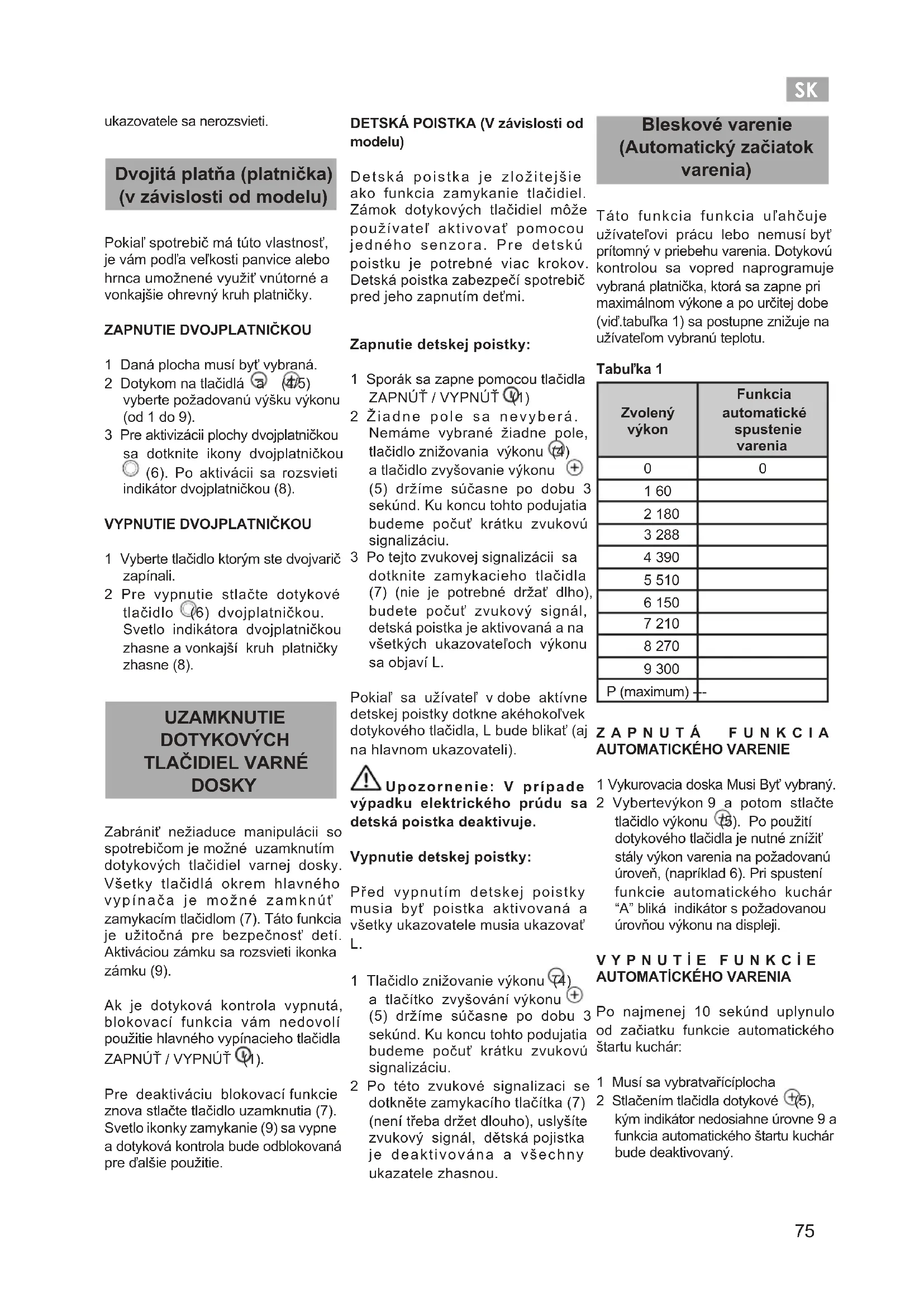 Bezpečnostná upozornenie: V prípade poškodenia alebo prasknutia sklokeramiky, sporák okamžite odpojte od elektrického prúdu, hrozí nebezpečenstvo úrazu elektrickým prúdom. Spotrebič nie je určený pre prácu s externým časovým spínačom (nie je súčasťou prístroja) alebo samostatným diaľkovým ovládačom. Spotrebič nečistite parou. Spotrebič a jeho dostupné časti sa pri prevádzke môžu ohriať. Vyvarujte sa dotyku týchto horúcich častí. Deti mladšie ako 8 rokov, ak nie sú pod neustálou kontrolou, by sa nemali k sporáku približovať. Deti 8 ročné a staršie, osoby s fyzickou, psychickou alebo mentálnou poruchou, a osoby neskúsených môžu používať tento spotrebič len po podaní dostatočných informácií o jeho prevádzke a o prípadnom nebezpečenstve pri jeho používaní. Čistenie a údržbu nesmú vykonávať deti bez dozoru. Deti si nesmú so spotrebičom hrať. Pozor: Je nebezpečnévařit s tukemneboolejem bez dozoruosoby, možnosť vzniku požiaru. Nikdy sa nepokúšajte uhasiť požiar vodou. V takejto situácii odpojte spotrebič od elektrického prúdu a požiar uduste pokrievkou, tanierom alebo dekou. Neodkladajte rôzne veci na plochu sporáku. Vyvarujete sa tak možnému požiaru. Ak bol poškodený hlavný vstupný kábel spotrebiča, musí byť vymenený iba výrobcom alebo autorizovanou servisnou jednotkou. POZOR: Používajte iba vhodné chrániče varnej dosky vyrobené pre domáce potreby alebo originálne chrániče varnej dosky tohto spotrebiča. Používanie nevhodných chráničov môže spôsobiť nehodu.SK