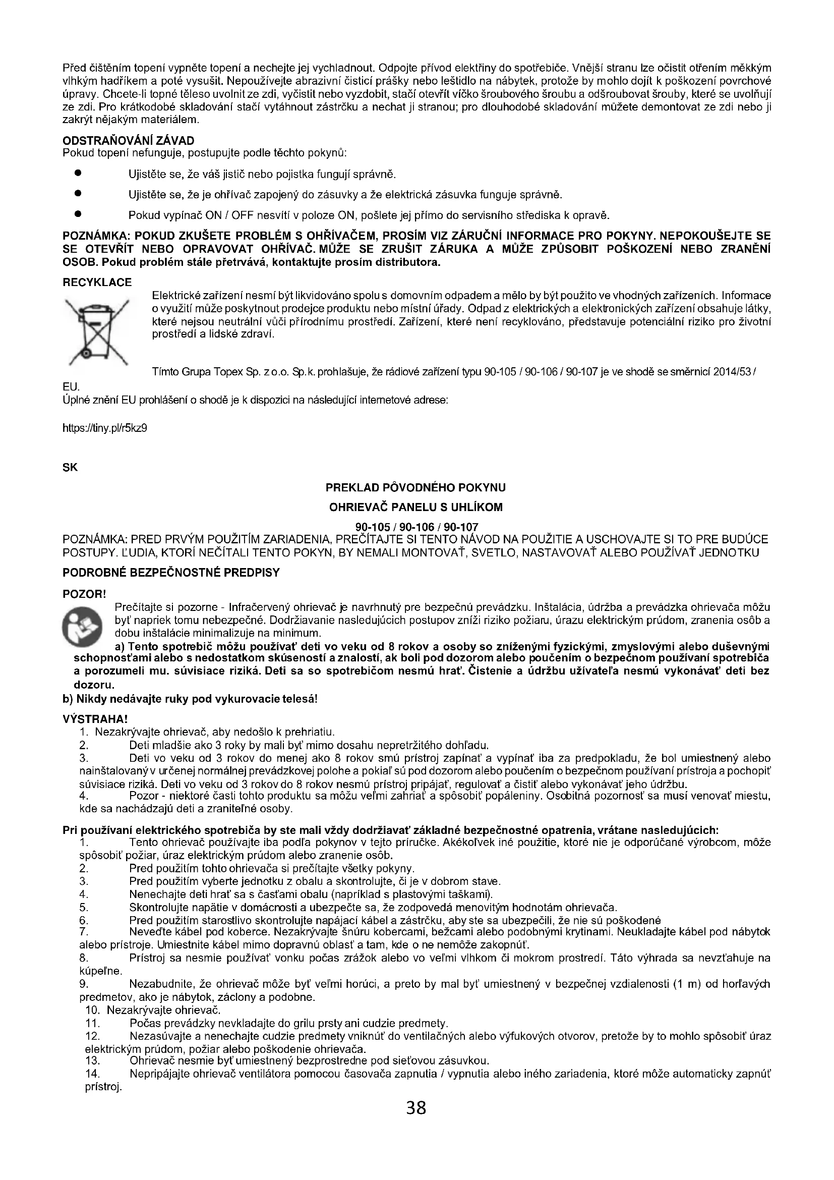 POZOR! Prečítajte si pozorne - Infračervený ohrievač je navrhnutý pre bezpečnú prevádzku. Inštalácia, údržba a prevádzka ohrievača môžu byť napriek tomu nebezpečné. Dodržiavanie nasledujúcich postupov zníži riziko požiaru, úrazu elektrickým prúdom, zranenia osôb a dobu inštalácie minimalizuje na minimum. a) Tento spotrebič môžu používať deti vo veku od 8 rokov a osoby so zníženými fyzickými, zmyslovými alebo duševnými schopnosťami alebo s nedostatkom skúseností a znalostí, ak boli pod dozorom alebo poučením o bezpečnom používaní spotrebiča a porozumeli mu. súvisiace riziká. Deti sa so spotrebičom nesmú hrať. Čistenie a údržbu užívateľa nesmú vykonávať deti bez dozoru. b) Nikdy nedávajte ruky pod vykurovacie telesá! VÝSTRAHA!