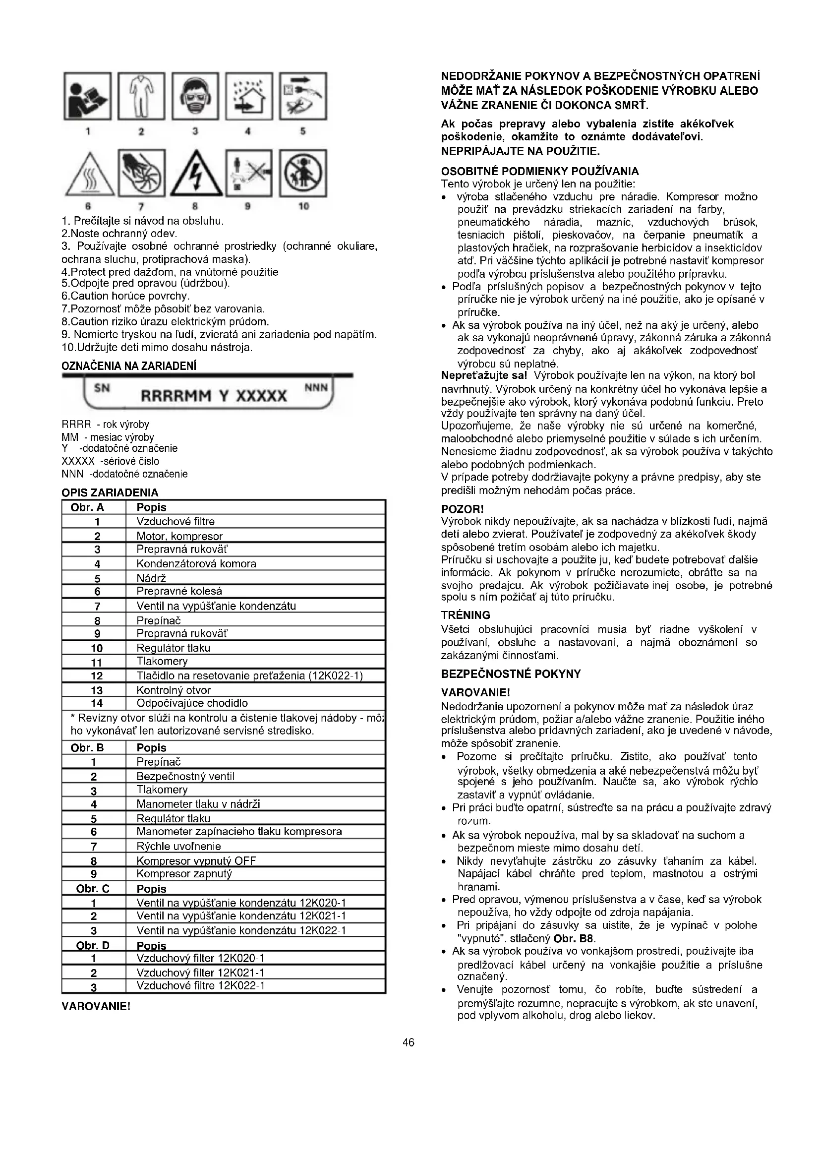 BEZOLEJOVÉ KOMPRESORY 12K020-1/12K021-1/12K022-1 PREČÍTAJTE SI NÁVOD NA OBSLUHU! Venujte osobitnú pozornosť bezpečnostným pokynom.
