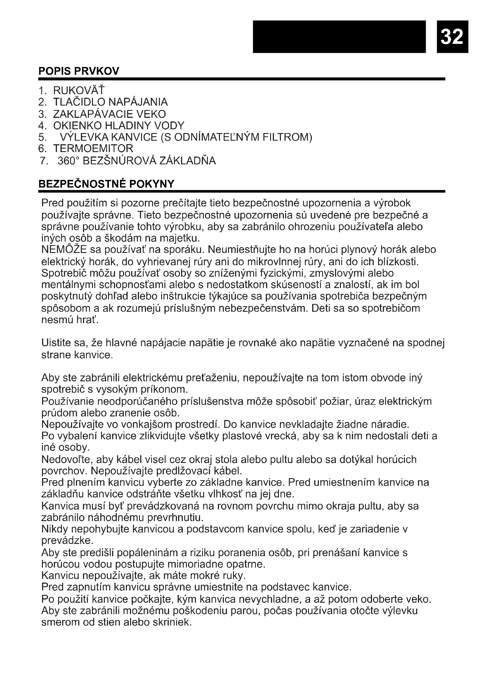 Odpojte spotrebič zo zásuvky a počkajte, kým vychladne. Nikdy neponárajte spotrebič do vody alebo inej tekutiny. Na čistenie spotrebiča nepoužívajte žiadne akrobatické alebo abrazívne čistiace prostriedky. Na čistenie spotrebiča nepoužívajte ostré predmety. Pravidelne kontrolujte spotrebič, či nie je poškodený. Vonkajšiu časť kanvice čistite mäkkou, vlhkou handričkou. Potom ju dôkladne vysušte suchou handričkou. Základňu čistite čistou, suchou handričkou. Vyberte sieťový filter vsadený do výlevky kanvice, vyčistite ho a znovu vložte.35 Slovenský Tento symbol na výrobku, jeho príslušenstve alebo obale označuje, že pri naskoršej likvidácii výrobku (z akýchkoľvek dôvodov) nesmie byť s výrobkom zachádzané ako s domácim odpadom. Výrobok zlikvidujte jeho odovzdaním na zberné miesto pre likvidáciu použitých elektrických a elektronických zariadení šetrnú k životnému prostrediu. Zaistením ich správnej likvidácie zabránite vzniku potenciálnych rizík pre životné prostredie a ľudské zdravie, ktorá by mohla vzniknúť nesprávnym zachádzaním s odpadmi. Okrem toho recyklácia odpadových materiálov napomáha udržaniu prírodných zdrojov surovín pre budúce generácie. Podrobné informácie k likvidácii tohto výrobku šetrné k životnému prostrediu získate u pracovníka ochrany životného prostredia miestneho (mestského alebo obvodného) úradu alebo v predajni, v ktorej ste výrobok zakúpili. POKYNY PRE SPRÁVNU LIKVIDÁCIU VÝROBKU (likvidácii použitých elektrických a elektronických zariadení) OPOZORILO Výkričník vo vnútri trojuholníka na skrinke prístroja upozorňuje užívateľa na existenciu dôležitých po-kynov pre jeho obsluhu uvedených v návode. Symbol blesku vo vnútri trojuholníka upozorňuje užívateľa na nebezpečné napätie na niektorých die-loch vo vnútri skrinky prístroja. Nevyberajte prístroj zo skrinky - riziko úrazu elektrickým prúdom. Vo vnútri skrinky prístroja nie sú die- ly ktoré by mohol opraviť alebo nastaviť jeho užívateľ bez zodpovedajúceho vybavenia a kvalifikácie. Ak bude prístroj vyžadovať nastavenie alebo opravu kontaktujte odborný servis. Zásahom do prístroja v dobe platnosti záruky sa vystavujete riziku straty príp. záručných plnení. Chráňte prístroj pred zmoknutím, postriekaním alebo poliatím akoukoľvek kvapalinou - riziko úrazu lektrickým prúdom. Nepoužívajte prístroj mimo miestnosti. Pre odpojenie prístroja od elektrickej siete vyberte vidlicu sieťového kábla prístroja zo sieťovej zásuvky. Prístroj umiestenie na dobre vetranom mieste. Nezakrývajte vetracie otvory skrinky prístroja - riziko jeho prehriatia a poškodenia. Chráňte prístroj pred priamym slnkom, neumiestňujte prístroj v blízkosti zdrojov tepla. Vysokými teplo-tami je výrazne skracovaná životnosť elektronických komponentov prístroja. ŠPECIFIKÁCIE Napájanie: AC 220-240 V ~ 50/60 Hz. 1850 - 2200 W Pohotovostný režim (off): menej ako 0,3 W Kapacita: 1,8 litra (max.) Špecifikácie a dizajn môžu byť bez predchádzajúceho upozornenia zmenené z dôvodu zlepšenia.36 Polski