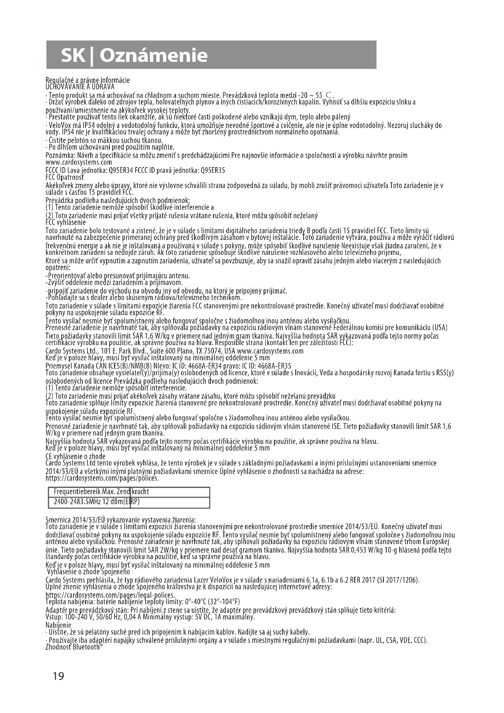 a) pri uporabi izdelka v prometu obstajajo tveganja, vključno, vendar ne omejeno na poškodbe ali bolezni, natezne ali zlome, delno in/ali popolno paralizo, smrt ali druge bolezni, ki lahko povzročijo resno invalidnost; b) ta tveganja lahko povzročijo malomarnost proizvajalcev ali njihovih zastopnikov ali katere koli tretje osebe, ki sodeluje pri izdelku; c) ta tveganja in nevarnosti lahko izhajajo iz predvidljivih ali nepredvidljivih vzrokov. S tem prevzemate vsa tveganja in nevarnosti ter vso odgovornost za vse izgube in/ali škode, ne glede na to, ali so povzročene v celoti ali delno zaradi malomarnosti ali drugega ravnanja drugih, vključno s Cardo. 5. Z uporabo izdelka potrjujete, da ste prebrali to izjavo o odgovornosti in v celoti razumete in sprejemate njene pogoje. Okoljska trajnost WEEE (Odpadi električne in elektronske opreme): Simbol prečrtanega smetnjaka na izdelku, dokumentaciji ali embalaži vas opominja, da je treba vse električne in elektronske izdelke, baterije in akumulatorje ob koncu njihove življenjske dobe oddati na ločen zbirni center. Ta zahteva velja za Evropsko unijo in druge lokacije, kjer so na voljo ločeni sistemi zbiranja. Da preprečite morebitno škodo za okolje ali človeško zdravje zaradi nenadzorovanega odlaganja odpadkov, tega izdelka ne odlagajte kot mešane komunalne odpadke, temveč ga oddajte na uradnem zbirnem mestu za recikliranje. Omejena dvoletna garancija Ta izdelek je pokrit z omejeno garancijo za obdobje dveh let od datuma nakupa. Če želite pridobiti garancijsko storitev, morate predložiti dokazilo o nakupu. Za več informacij se obrnite na prodajalca, kjer je bil izdelek kupljen. Preverite postopek ravnanja z garancijo in podrobnosti na naslednji spletni strani: lazersport.com/global/VeloVox-warranty-guide. NO | Legg merke til 72Frekvensområde Maks. Slå av strømmen 2400-2483.5MHz 12 dBm(EIRP) Cardo Systems Ltd., 101 E. Park Blvd., Suite 600 Plano, TX 75074, USA www.cardosystems.com Keď je v poloze hlavy, musí byť vysílač inštalovaný na minimálnej oddelenie 5 mm Priemysel Kanada CAN ICES(B)/NMB(B) Nlevo: IC ID: 4668A-ER34 pravo: IC ID: 4668A-ER35 Toto zariadenie obsahuje vysielateľ(y)/prijíma(y) oslobodených od licence, ktoré v súlade s Inovácií, Veda a hospodársky rozvoj Kanada fortiu s RSS(y) oslobodených od licence Prevádzka podlieha nasledujúcich dvoch podmienok: (1) Tento zariadenie nemôže spôsobiť interferencie. (2) Toto zariadenie musí prijať akékoľvek zásahy vrátane zásahu, ktoré môžu spôsobiť neželanú prevádzku Toto zariadenie splňuje limity expozície žiarenia stanovené pre nekontrolované prostredie. Konečný užívateľ musí dodržiavať osobitné pokyny na uspokojenie súladu expozície RF. Tento vysílač nesmie byť spolumístnený alebo fungovať spoločne s žiadomoľnou inou anténou alebo vysílačkou. Prenosné zariadenie je navrhnuté tak, aby splňovali požiadavky na expozíciu rádiovým vlnám stanovené ISE. Tieto požiadavky stanovili limit SAR 1,6 W/kg v priemere nad jedným gram tkaniva. Najvyššia hodnota SAR vykazovaná podľa tejto normy počas certifikácie výrobku na použitie, ak správne používa na hlavu. Keď je v poloze hlavy, musí byť vysílač inštalovaný na minimálnej oddelenie 5 mm CE vyhlásenie o zhode Cardo Systems Ltd tento výrobek vyhlása, že tento výrobek je v súlade s základnými požiadavkami a inými príslušnými ustanoveniami smernice 2014/53/EÚ a všetkými inými platnými požiadavkami smernice Úplné vyhlásenie o zhodnosti sa nachádza na adrese: https://cardosystems.com/pages/polices. Smernica 2014/53/EÚ vykazovanie vystavenia žiarenia: Toto zariadenie je v súlade s limitami expozícií žiarenia stanovenými pre nekontrolované prostredie smernice 2014/53/EÚ. Konečný užívateľ musí dodržiavať osobitné pokyny na uspokojenie súladu expozície RF. Tento vysílač nesmie byť spolumístnený alebo fungovať spoločne s žiadomoľnou inou anténou alebo vysílačkou. Prenosné zariadenie je navrhnuté tak, aby splňovali požiadavky na expozíciu rádiovým vlnám stanovené trhom Európskej únie. Tieto požiadavky stanovili limit SAR 2W/kg v priemere nad desať gramom tkaniva. Najvyššia hodnota SAR 0,453 W/kg 10-g hlásená podľa tejto štandardy počas certifikácie výrobku na použitie, keď sa správne používa na hlavu. Keď je v poloze hlavy, musí byť vysílač inštalovaný na minimálnej oddelenie 5 mm Vyhlásenie o zhode Spojeného Cardo Systems prehlásila, že typ rádiového zariadenia Lazer VeloVox je v súlade s nariadeniami 6.1a, 6.1b a 6.2 RER 2017 (SI 2017/1206). Úplné znenie vyhlásenia o zhode Spojeného kráľovstva je k dispozícii na nasledujúcej internetové adresy: https://cardosystems.com/pages/legal-polices. Teplota nabíjenia: batérie nabíjenie teploty limity: 0°-40°C (32°-104°F) Adaptér pre prevádzkový stán: Pri nabíjení z stene sa uistite, že adaptér pre prevádzkový prevádzkový stán splňuje tieto kritériá: Vstup: 100-240 V, 50/60 Hz, 0,04 A Minimálny výstup: 5V DC, 1A maximálny. Nabíjenie