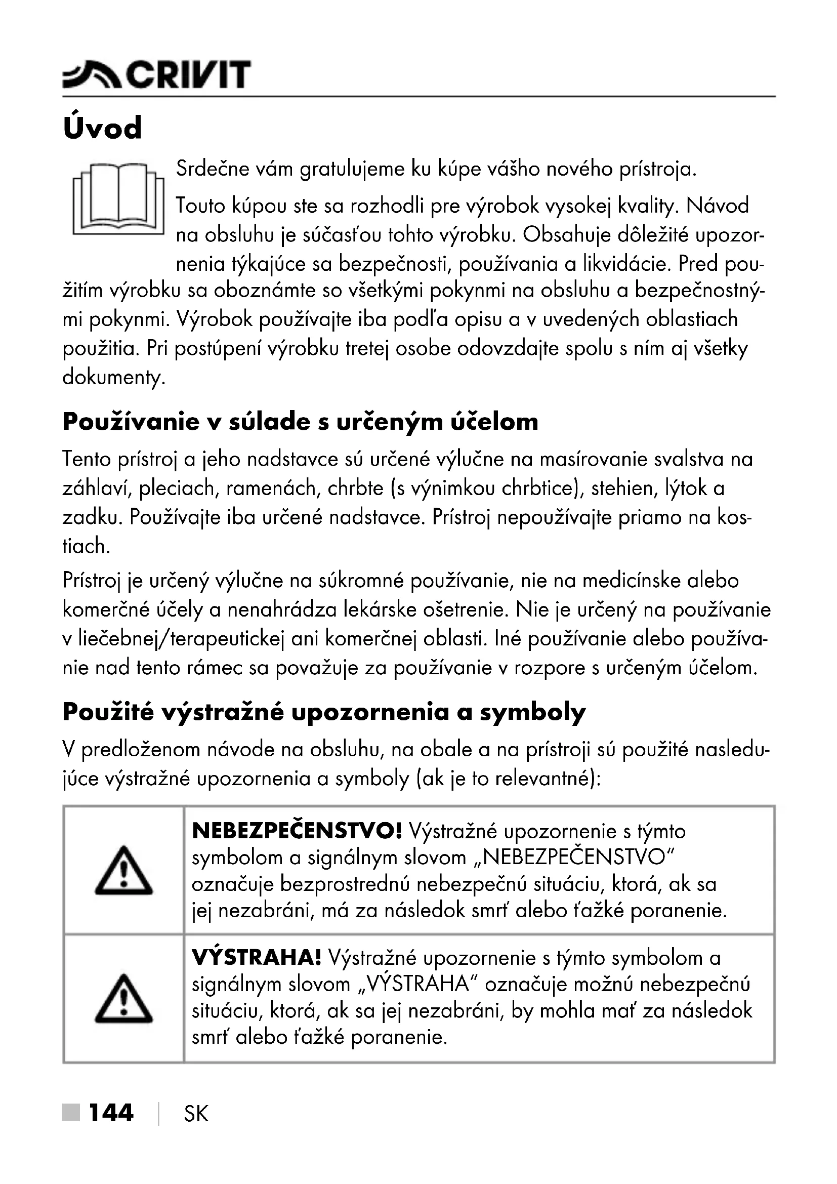 SK Úvod Srdečne vám gratulujeme ku kúpe vášho nového prístroja. Touto kúpou ste sa rozhodli pre výrobok vysokej kvality. Návod naobsluhu je súčasťou tohto výrobku. Obsahuje dôležité upozor- nenia týkajúce sa bezpečnosti, používania a likvidácie. Pred pou- žitím výrobku sa oboznámte sovšetkými pokynmi na obsluhu a bezpečnostný- mi pokynmi. Výrobok používajte iba podľa opisu a vuvedených oblastiach použitia. Pri postúpení výrobku tretej osobe odovzdajte spolu sním aj všetky dokumenty. Používanie vsúlade surčeným účelom Tento prístroj a jeho nadstavce sú určené výlučne na masírovanie svalstva na záhlaví, pleciach, ramenách, chrbte (s výnimkou chrbtice), stehien, lýtok a zadku. Používajte iba určené nadstavce. Prístroj nepoužívajte priamo na kos- tiach. Prístroj je určený výlučne na súkromné používanie, nie na medicínske alebo komerčné účely anenahrádza lekárske ošetrenie. Nie je určený na používanie vliečebnej/terapeutickej ani komerčnej oblasti. Iné používanie alebo používa- nie nad tento rámec sapovažuje zapoužívanie v rozpore surčeným účelom. Použité výstražné upozornenia a symboly Vpredloženom návode na obsluhu, na obale a na prístroji sú použité nasledu- júce výstražné upozornenia a symboly (ak je to relevantné): NEBEZPEČENSTVO! Výstražné upozornenie s týmto symbolom a signálnym slovom „NEBEZPEČENSTVO“ označuje bezprostrednú nebezpečnú situáciu, ktorá, ak sa jej nezabráni, má za následok smrť alebo ťažké poranenie. VÝSTRAHA! Výstražné upozornenie s týmto symbolom a signálnym slovom „VÝSTRAHA“ označuje možnú nebezpečnú situáciu, ktorá, ak sa jej nezabráni, by mohla mať za následok smrť alebo ťažké poranenie. IB_479864_2410_CMMG3.7A1_LB8.indb 144 27.01.2025 07:53:33SK