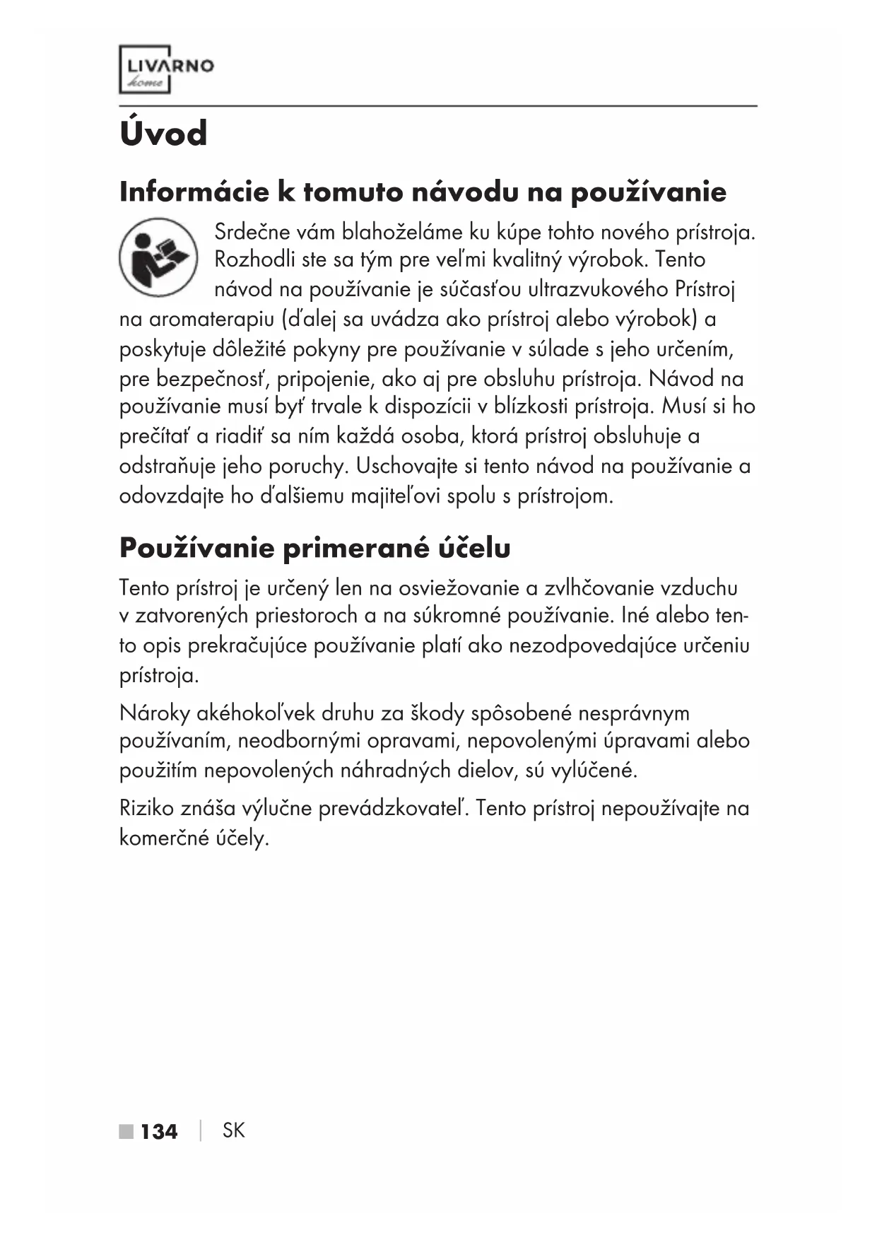 SK Úvod Informácie k tomuto návodu na používanie Srdečne vám blahoželáme ku kúpe tohto nového prístroja. Rozhodli ste sa tým pre veľmi kvalitný výrobok. Tento návod na používanie je súčasťou ultrazvukového Prístroj na aromaterapiu (ďalej sa uvádza ako prístroj alebo výrobok) a poskytuje dôležité pokyny pre používanie v súlade s jeho určením, pre bezpečnosť, pripojenie, ako aj pre obsluhu prístroja. Návod na používanie musí byť trvale k dispozícii v blízkosti prístroja. Musí si ho prečítať a riadiť sa ním každá osoba, ktorá prístroj obsluhuje a odstraňuje jeho poruchy. Uschovajte si tento návod na používanie a odovzdajte ho ďalšiemu majiteľovi spolu s prístrojom. Používanie primerané účelu Tento prístroj je určený len na osviežovanie a zvlhčovanie vzduchu v zatvorených priestoroch a na súkromné používanie. Iné alebo ten- to opis prekračujúce používanie platí ako nezodpovedajúce určeniu prístroja. Nároky akéhokoľvek druhu za škody spôsobené nesprávnym používaním, neodbornými opravami, nepovolenými úpravami alebo použitím nepovolených náhradných dielov, sú vylúčené. Riziko znáša výlučne prevádzkovateľ. Tento prístroj nepoužívajte na komerčné účely. IB_481062_2410_LADG12A1_LADV12A1_LB8.indb 134 14.03.2025 10:49:59SK