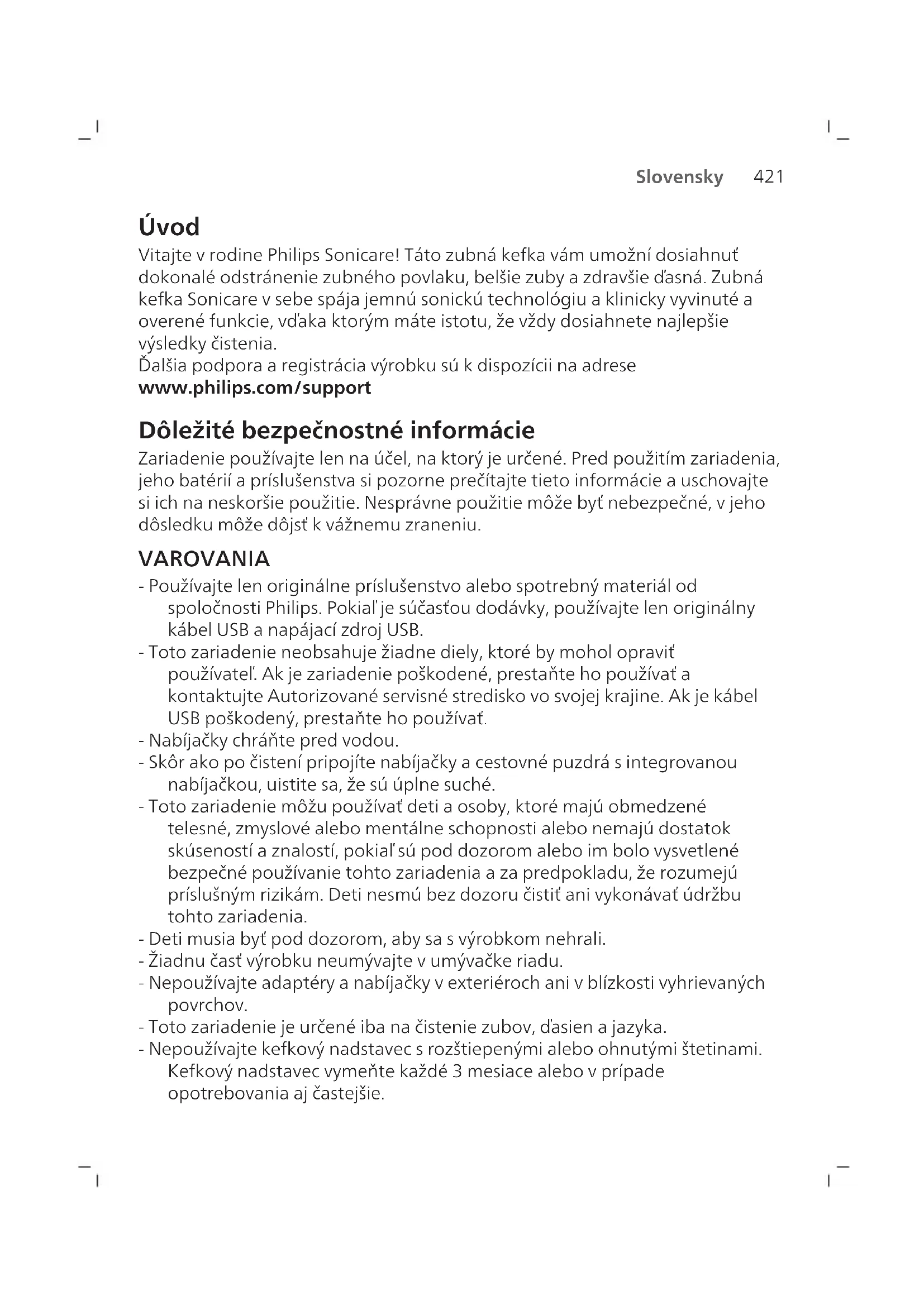 Slovensky Úvod Vitajte v rodine Philips Sonicare! Táto zubná kefka vám umožní dosiahnuť dokonalé odstránenie zubného povlaku, belšie zuby azdravšie ďasná. Zubná kefka Sonicare v sebe spája jemnú sonickú technológiu a klinicky vyvinuté a overené funkcie, vďaka ktorým máte istotu, že vždy dosiahnete najlepšie výsledky čistenia. Ďalšia podpora a registrácia výrobku sú k dispozícii na adrese www.philips.com/support Dôležité bezpečnostné informácie Zariadenie používajte len na účel, na ktorý je určené. Pred použitím zariadenia, jeho batérií a príslušenstva si pozorne prečítajte tieto informácie auschovajte si ich na neskoršie použitie. Nesprávne použitie môže byť nebezpečné, v jeho dôsledku môže dôjsť k vážnemu zraneniu. VAROVANIA - Používajte len originálne príslušenstvo alebo spotrebný materiál od spoločnosti Philips. Pokiaľ je súčasťou dodávky, používajte len originálny kábel USB a napájací zdroj USB. - Toto zariadenie neobsahuje žiadne diely, ktoré by mohol opraviť používateľ. Ak je zariadenie poškodené, prestaňte ho používať a kontaktujte Autorizované servisné stredisko vo svojej krajine. Ak je kábel USB poškodený, prestaňte ho používať. - Nabíjačky chráňte pred vodou. - Skôr ako počistení pripojíte nabíjačky acestovné puzdrá sintegrovanou nabíjačkou, uistite sa, že sú úplne suché. - Toto zariadenie môžu používať deti a osoby, ktoré majú obmedzené telesné, zmyslové alebo mentálne schopnosti alebo nemajú dostatok skúseností a znalostí, pokiaľ sú pod dozorom alebo im bolo vysvetlené bezpečné používanie tohto zariadenia a za predpokladu, že rozumejú príslušným rizikám. Deti nesmú bez dozoru čistiť ani vykonávať údržbu tohto zariadenia. - Deti musia byť pod dozorom, aby sa svýrobkom nehrali. - Žiadnu časť výrobku neumývajte v umývačke riadu. - Nepoužívajte adaptéry a nabíjačky vexteriéroch ani vblízkosti vyhrievaných povrchov. - Toto zariadenie je určené iba na čistenie zubov, ďasien a jazyka. - Nepoužívajte kefkový nadstavec srozštiepenými alebo ohnutými štetinami. Kefkový nadstavec vymeňte každé 3 mesiace alebo v prípade opotrebovania aj častejšie.422 Slovensky - Zabráňte priamemu kontaktu s výrobkami obsahujúcimi esenciálne oleje alebo kokosový olej. Kontakt by mohol spôsobiť uvoľnenie štetiniek. - Možno ho používať v maximálnej nadmorskej výške 4500 metrov.
