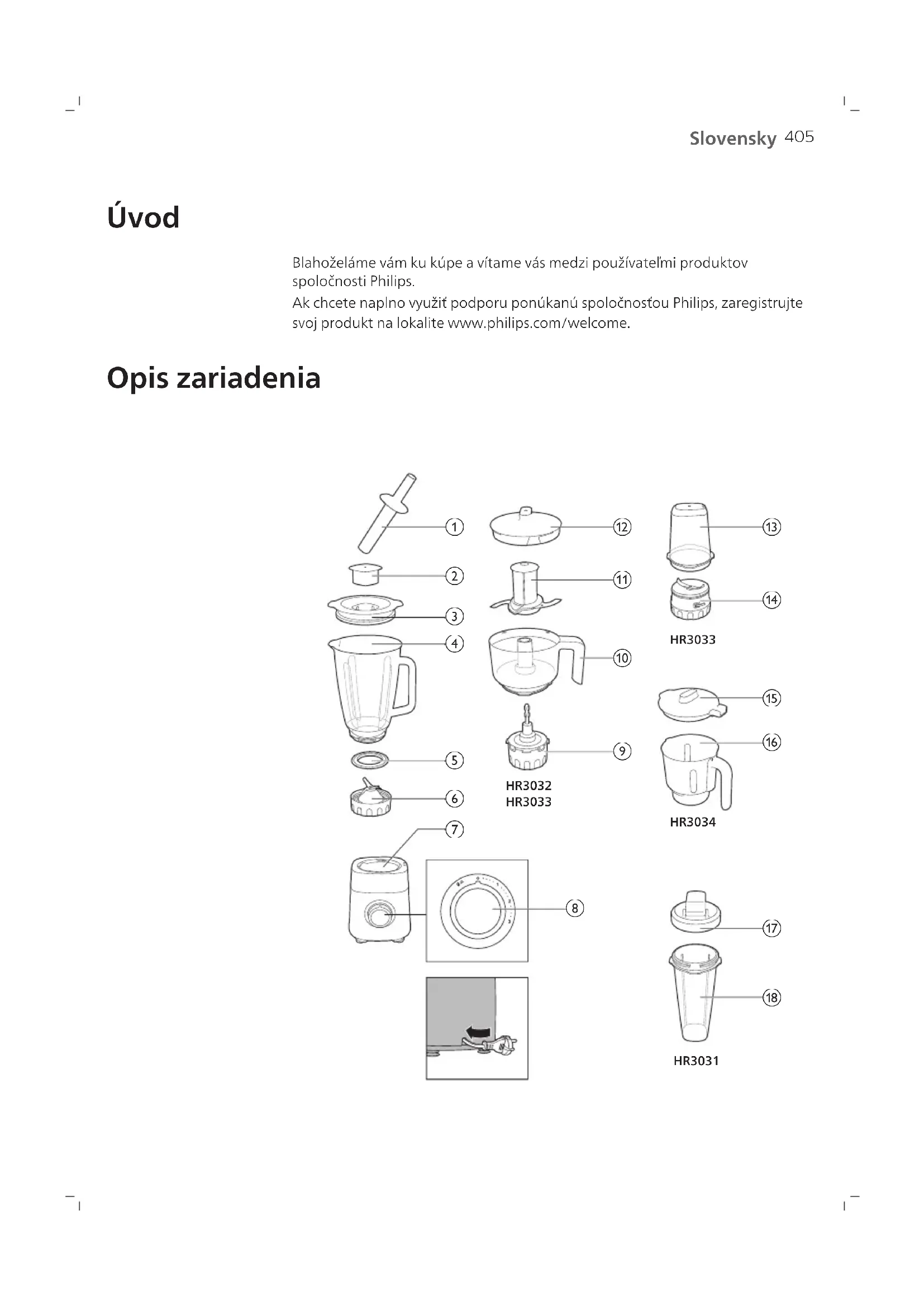 Slovensky Slovensky Úvod Blahoželáme vám ku kúpe avítame vás medzi používateľmi produktov spoločnosti Philips. Ak chcete naplno využiť podporu ponúkanú spoločnosťou Philips, zaregistrujte svoj produkt na lokalite www.philips.com/welcome. Opis zariadenia HR3034HR3031 HR3033HR3032 HR3033