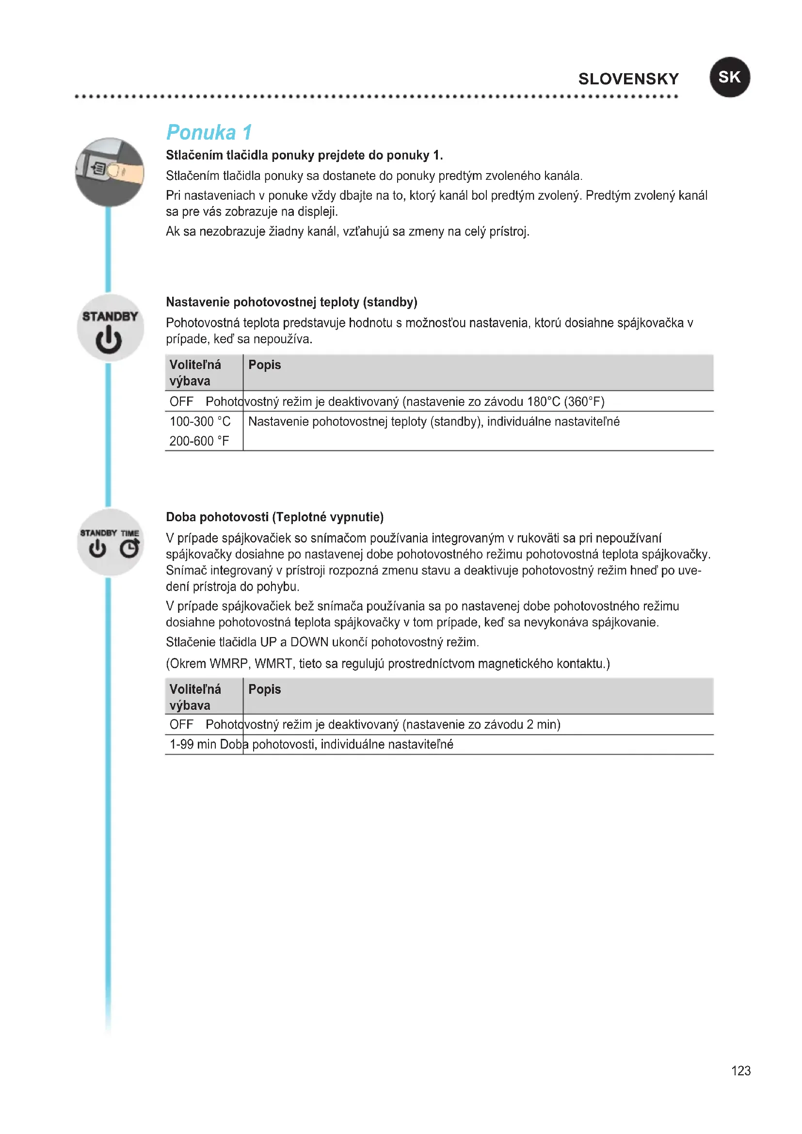 MAGYAR123 Ponuka 1 Stlačenm tlačidla ponuky prejdete do ponuky 1. Stlačenímtlačidlaponukysadostanetedoponukypredtýmzvolenéhokanála. Prinastaveniachvponukevždydbajtenato,ktorýkanálbolpredtýmzvolený.Predtýmzvolenýkanál saprevászobrazujenadispleji. Aksanezobrazuježiadnykanál,vzťahujúsazmenynacelýprístroj. Nastavenie pohotovostnej teploty (standby) Pohotovostnáteplotapredstavujehodnotusmožnosťounastavenia,ktorúdosiahnespájkovačkav prípade,keďsanepoužíva. Voliteľná výbava Popis OFF Pohotovostnýrežimjedeaktivovaný(nastaveniezozávodu180°C(360°F) 100-300°C 200-600°F Nastaveniepohotovostnejteploty(standby),individuálnenastaviteľné Doba pohotovosti (Teplotné vypnutie) Vprípadespájkovačieksosnímačompoužívaniaintegrovanýmvrukovätisaprinepoužívaní spájkovačkydosiahneponastavenejdobepohotovostnéhorežimupohotovostnáteplotaspájkovačky. Snímačintegrovanývprístrojirozpoznázmenustavuadeaktivujepohotovostnýrežimhneďpouve- deníprístrojadopohybu. Vprípadespájkovačiekbežsnímačapoužívaniasaponastavenejdobepohotovostnéhorežimu dosiahnepohotovostnáteplotaspájkovačkyvtomprípade,keďsanevykonávaspájkovanie. StlačenietlačidlaUPaDOWNukončípohotovostnýrežim. (OkremWMRP,WMRT,tietosaregulujúprostredníctvommagnetickéhokontaktu.) Voliteľná výbava Popis OFF Pohotovostnýrežimjedeaktivovaný(nastaveniezozávodu2min) 1-99 min Dobapohotovosti,individuálnenastaviteľné