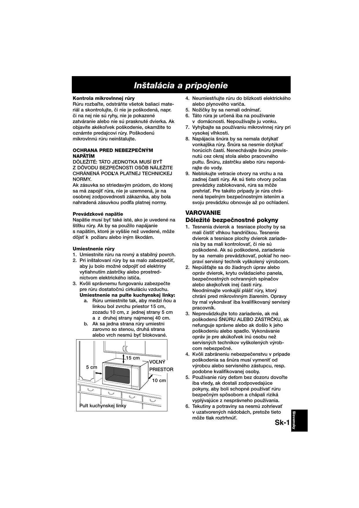 Utiliser une tension identique à celle spécifiée sur le four micro-ondes. Si on utilise une tension supérieure à celle indiquée, l’appareil risque de prendre feu ou d’être endommagé d’une autre manière. De même, si la tension est inférieure, votre appareil sera moins performant. Votre appareil doit être protégé par un fusible de 10 Ampères. Emplacement du four 1. Déposer le four sur une surface plate et stable. 2. Une fois le four installé, il faut pouvoir facilement couper son alimentation électrique, soit en retirant la prise murale soit en actionnant un disjoncteur ou un fusible. 3. Afin de garantir une utilisation optimale du four, veillez à ce qu’il soit suffisamment ventilé. Si vous placez l’appareil sur un plan de travail: a. Laissez un espace de 15 cm en haut du four, de 10 cm à l’arrière, de 5 cm d’un côté du four et d’au moins 40 cm de l’autre côté. b. Si vous placez le four contre le mur, veillez à ce que l’autre côté ou le dessus du four soit totalement libre.
