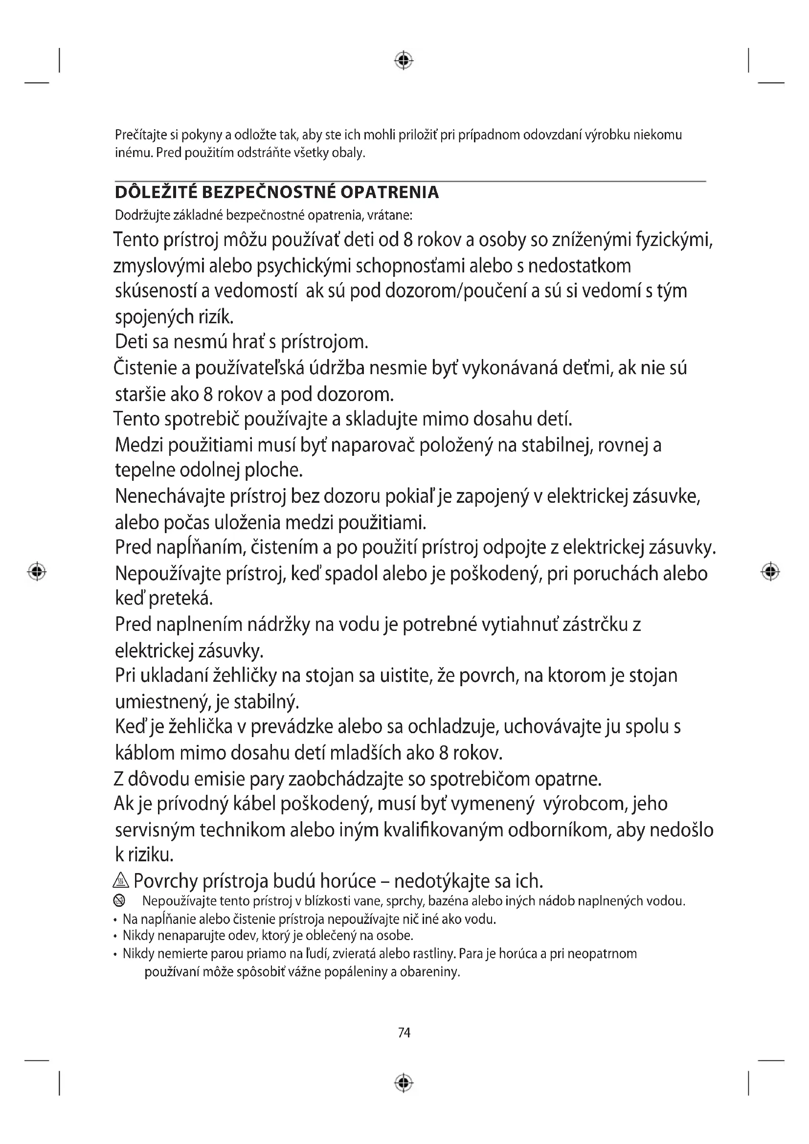 Dodržujte základné bezpečnostné opatrenia, vrátane: Tento prístroj môžu používať deti od 8 rokov a osoby so zníženými fyzickými, zmyslovými alebo psychickými schopnosťami alebo s nedostatkom skúseností a vedomostí ak sú pod dozorom/poučení a sú si vedomí s tým spojených rizík. Deti sa nesmú hrať s prístrojom. Čistenie a používateľská údržba nesmie byť vykonávaná deťmi, ak nie sú staršie ako 8 rokov a pod dozorom. Tento spotrebič používajte a skladujte mimo dosahu detí. Medzi použitiami musí byť naparovač položený na stabilnej, rovnej a tepelne odolnej ploche. Nenechávajte prístroj bez dozoru pokiaľ je zapojený v elektrickej zásuvke, alebo počas uloženia medzi použitiami. Pred napĺňaním, čistením a po použití prístroj odpojte z elektrickej zásuvky. Nepoužívajte prístroj, keď spadol alebo je poškodený, pri poruchách alebo keď preteká. Pred naplnením nádržky na vodu je potrebné vytiahnuť zástrčku z elektrickej zásuvky. Pri ukladaní žehličky na stojan sa uistite, že povrch, na ktorom je stojan umiestnený, je stabilný. Keď je žehlička v prevádzke alebo sa ochladzuje, uchovávajte ju spolu s káblom mimo dosahu detí mladších ako 8 rokov. Z dôvodu emisie pary zaobchádzajte so spotrebičom opatrne. Ak je prívodný kábel poškodený, musí byť vymenený výrobcom, jeho servisným technikom alebo iným kvalifikovaným odborníkom, aby nedošlo k riziku. h Povrchy prístroja budú horúce – nedotýkajte sa ich. b Nepoužívajte tento prístroj v blízkosti vane, sprchy, bazéna alebo iných nádob naplnených vodou.