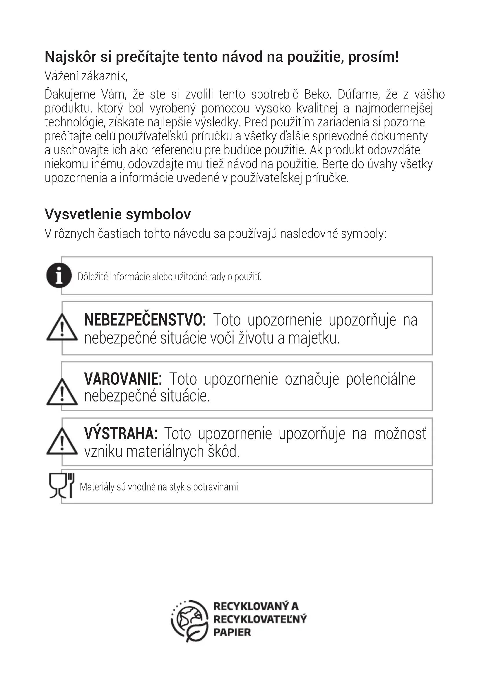- Spotrebiče môžu používať osoby so zníženými fyzickými, zmyslovými alebo duševnými schopnosťami alebo s nedostatočnými skúsenosťami a znalosťami, ak boli pod dohľadom alebo boli poučené o používaní spotrebiča bezpečným spôsobom a rozumejú príslušným nebezpečenstvám.