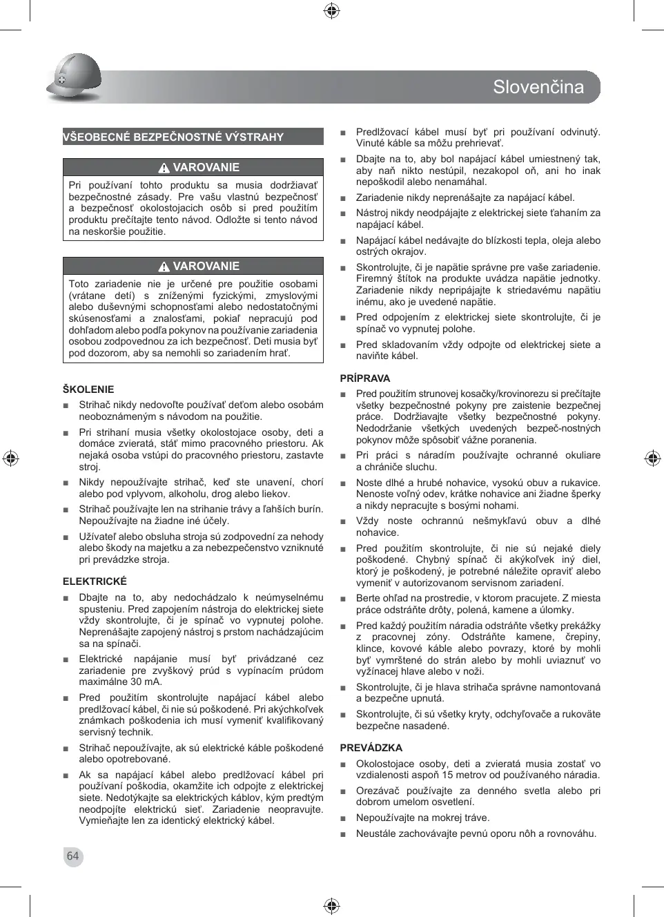 VAROVANIE Pri používaní tohto produktu sa musia dodržiavať bezpečnostné zásady. Pre vašu vlastnú bezpečnosť a bezpečnosť okolostojacich osôb si pred použitím produktu prečítajte tento návod. Odložte si tento návod na neskoršie použitie. VAROVANIE Toto zariadenie nie je určené pre použitie osobami (vrátane detí) s zníženými fyzickými, zmyslovými alebo duševnými schopnosťami alebo nedostatočnými skúsenosťami a znalosťami, pokiaľ nepracujú pod dohľadom alebo podľa pokynov na používanie zariadenia osobou zodpovednou za ich bezpečnosť. Deti musia byť pod dozorom, aby sa nemohli so zariadením hrať.