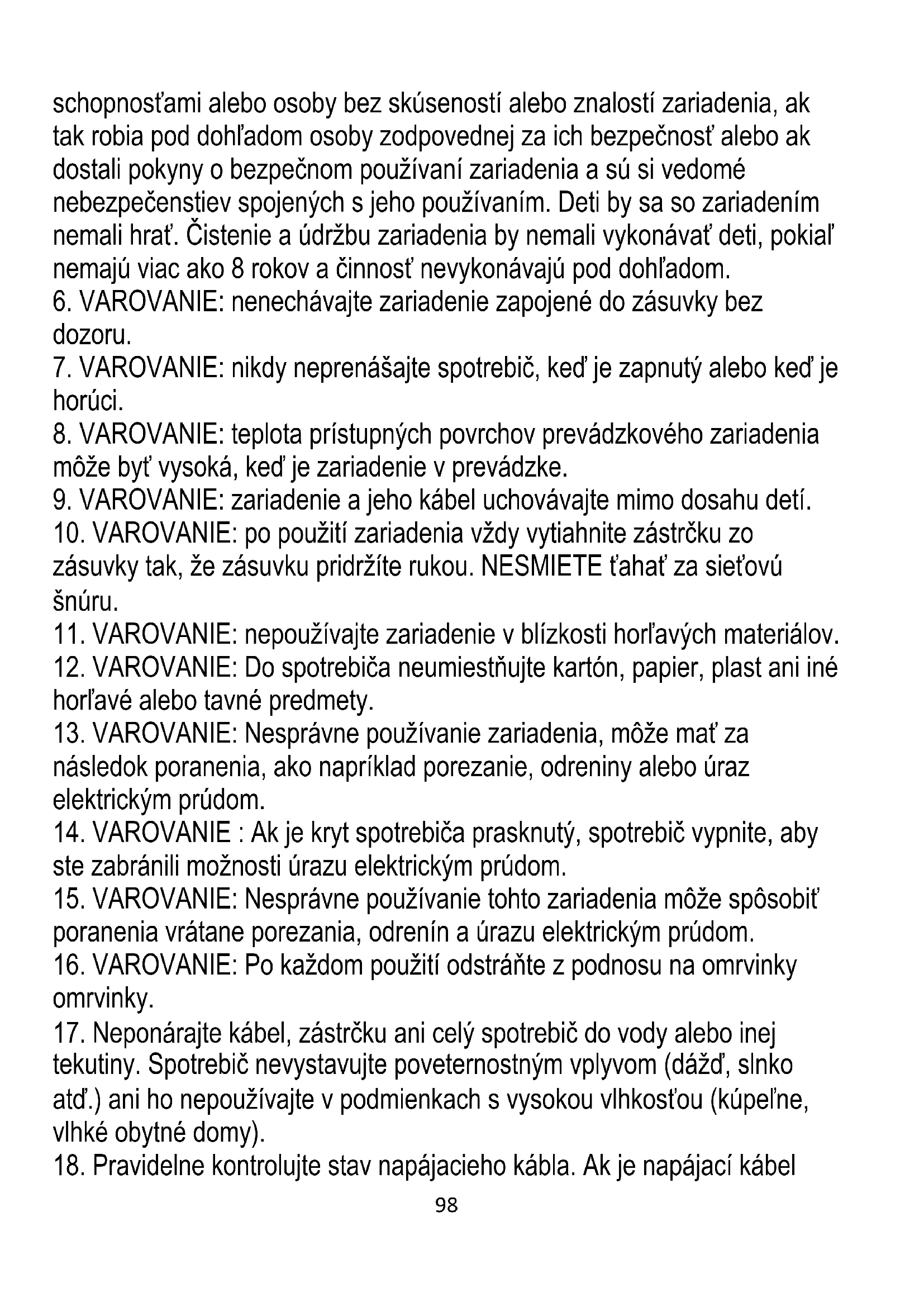 rokov a osoby so zníženými fyzickými, zmyslovými alebo duševnými98 schopnosťami alebo osoby bez skúseností alebo znalostí zariadenia, ak tak robia pod dohľadom osoby zodpovednej za ich bezpečnosť alebo ak dostali pokyny o bezpečnom používaní zariadenia a sú si vedomé nebezpečenstiev spojených s jeho používaním. Deti by sa so zariadením nemali hrať. Čistenie a údržbu zariadenia by nemali vykonávať deti, pokiaľ nemajú viac ako 8 rokov a činnosť nevykonávajú pod dohľadom.