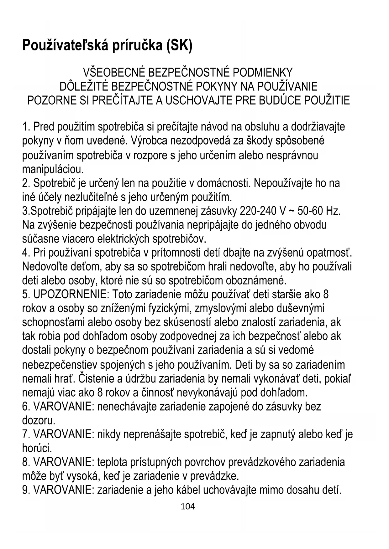 iné účely nezlučiteľné s jeho určeným použitím. 3.Spotrebič pripájajte len do uzemnenej zásuvky 220-240 V ~ 50-60 Hz. Na zvýšenie bezpečnosti používania nepripájajte do jedného obvodu súčasne viacero elektrických spotrebičov.