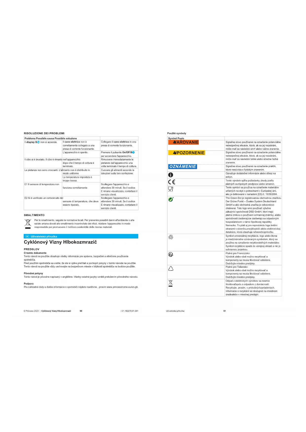 Uživatelská příručka Cyklónový Vízny Hlbokozmrazič PREDSLOV O tomto dokumente Tento návod na použitie obsahuje všetky informácie pre správne, bezpečné a efektívne používanie spotrebiča. Pred použitím spotrebiča sa uistite, že ste si úplne prečítali a pochopili pokyny v tomto návode na použitie. Tento návod na použitie vždy uschovajte na bezpečnom mieste v blízkosti spotrebiča na budúce použitie. Pôvodné pokyny Tento návod je pôvodne napísaný v angličtine. Všetky ostatné jazyky vznikli preložením pôvodného návodu. Podpora Pre náhradné diely a ďalšie informácie o spotrebiči nájdete navštívne , prosím www.princesshome.eu/en-gb. Použité symboly Symbol Popis