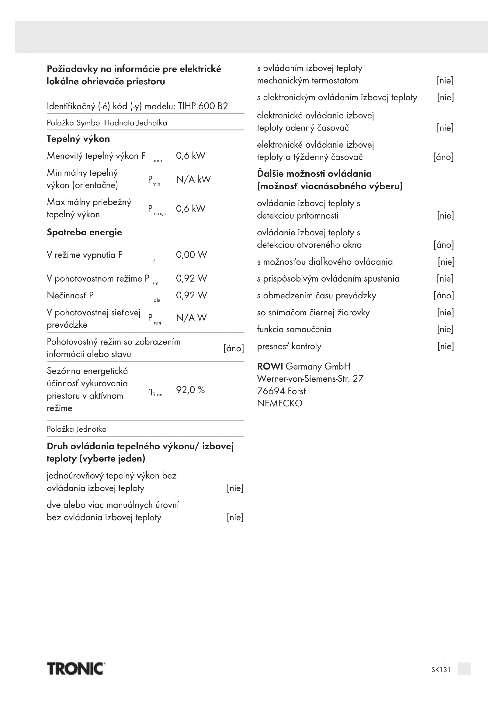 S,on 92,0 % Položka Jednotka Druh ovládania tepelného výkonu/ izbovej teploty (vyberte jeden) jednoúrovňový tepelný výkon bez ovládania izbovej teploty [nie] dve alebo viac manuálnych úrovní bez ovládania izbovej teploty [nie] s ovládaním izbovej teploty mechanickým termostatom [nie] s elektronickým ovládaním izbovej teploty [nie] elektronické ovládanie izbovej teploty adenný časovač [nie] elektronické ovládanie izbovej teploty a týždenný časovač [áno] Ďalšie možnosti ovládania (možnosť viacnásobného výberu) ovládanie izbovej teploty s detekciou prítomnosti [nie] ovládanie izbovej teploty s detekciou otvoreného okna [áno] s možnosťou diaľkového ovládania [nie] s prispôsobivým ovládaním spustenia [nie] s obmedzením času prevádzky [áno] so snímačom čiernej žiarovky [nie] funkcia samoučenia [nie] presnosť kontroly [nie] ROWI Germany GmbH Werner-von-Siemens-Str. 27 76694 Forst NEMECKOSK132