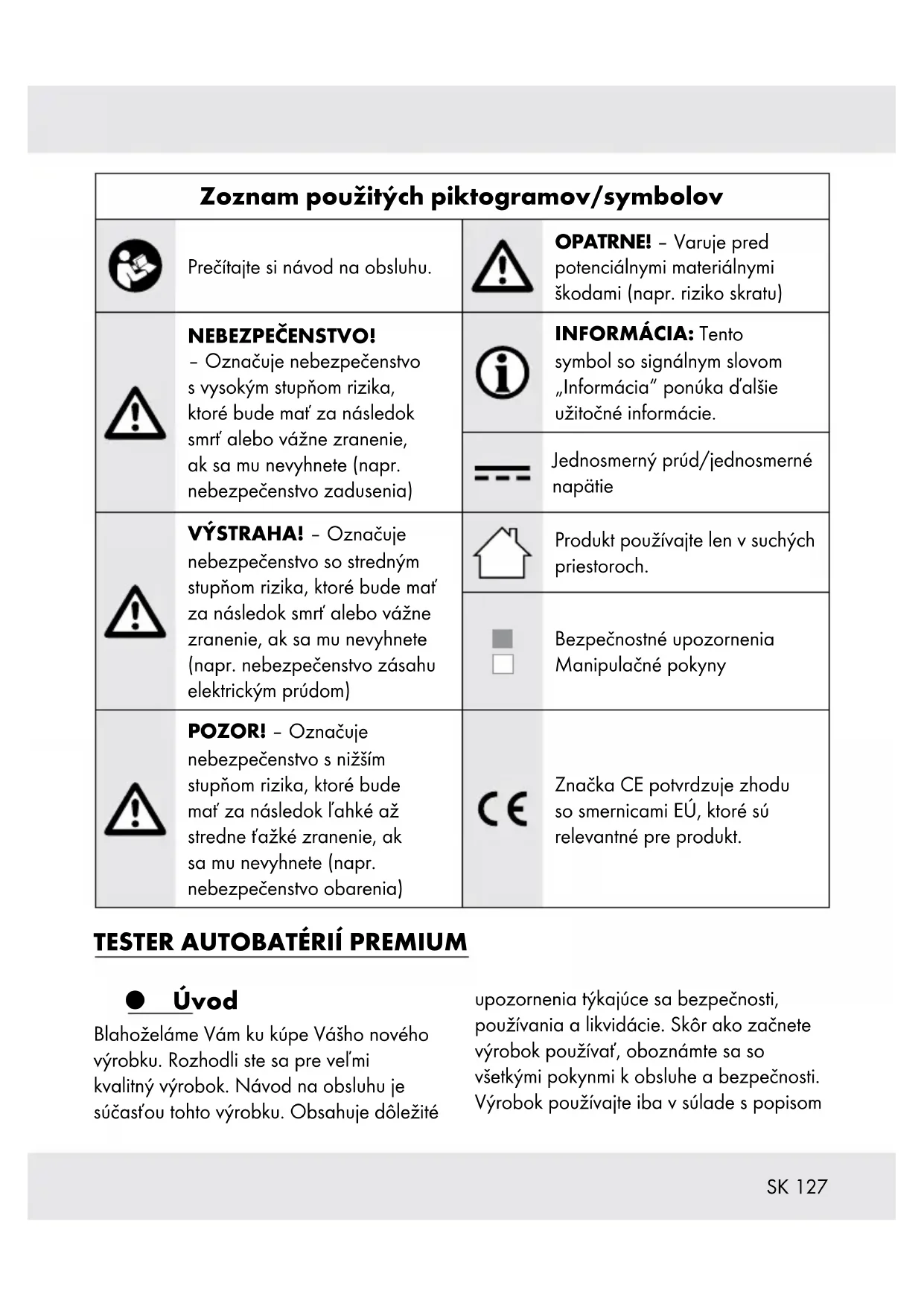 Úvod Blahoželáme Vám ku kúpe Vášho nového výrobku. Rozhodli ste sa pre veľmi kvalitný výrobok. Návod na obsluhu je súčasťou tohto výrobku. Obsahuje dôležité upozornenia týkajúce sa bezpečnosti, používania a likvidácie. Skôr ako začnete výrobok používať, oboznámte sa so všetkými pokynmi k obsluhe a bezpečnosti. Výrobok používajte iba v súlade s popisom128