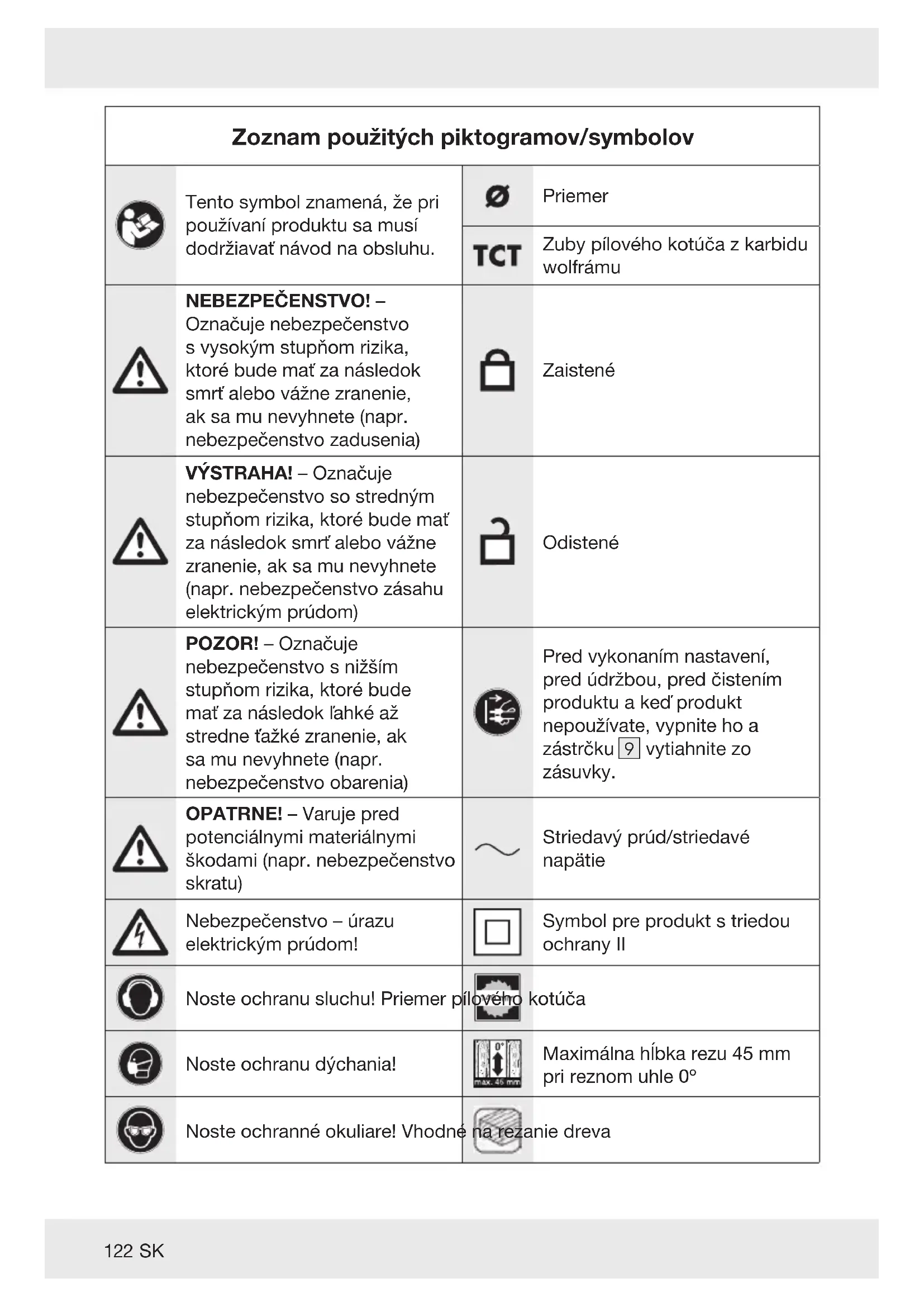 Zoznam použitých piktogramov/symbolov Tento symbol znamená, že pri používaní produktu sa musí dodržiavať návod na obsluhu. Priemer Zuby pílového kotúča z karbidu wolfrámu NEBEZPEČENSTVO! – Označuje nebezpečenstvo s vysokým stupňom rizika, ktoré bude mať za následok smrť alebo vážne zranenie, ak sa mu nevyhnete (napr. nebezpečenstvo zadusenia) Zaistené VÝSTRAHA! –Označuje nebezpečenstvo so stredným stupňom rizika, ktoré bude mať za následok smrť alebo vážne zranenie, ak sa mu nevyhnete (napr. nebezpečenstvo zásahu elektrickým prúdom) Odistené POZOR! –Označuje nebezpečenstvo s nižším stupňom rizika, ktoré bude mať za následok ľahké až stredne ťažké zranenie, ak sa mu nevyhnete (napr. nebezpečenstvo obarenia)