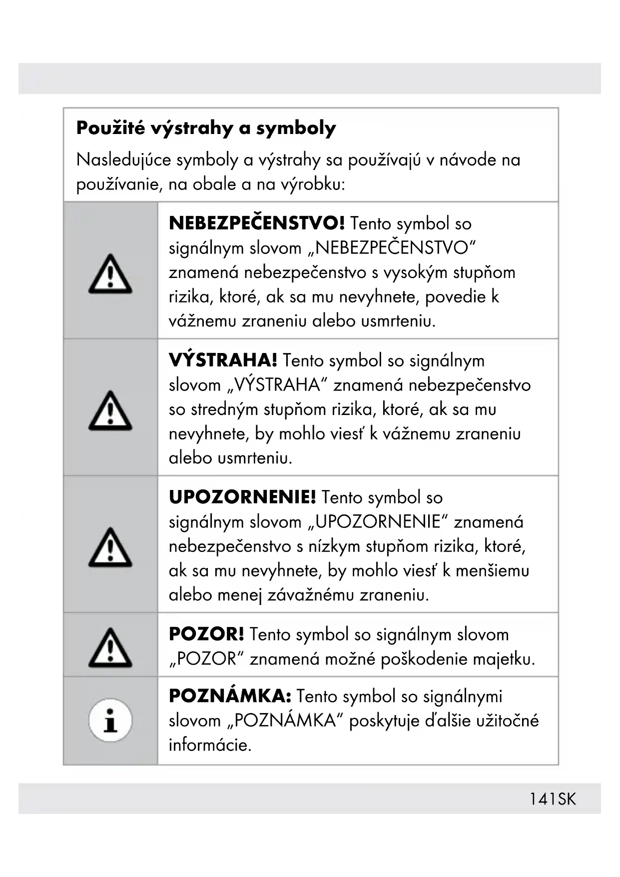 - Ak sa výrobok nebude dlhodobo používať, vstavaná batéria by sa mala úplne nabiť, aby sa predĺžila jeho prevádzková životnosť. Pravidelne nabíjajte vstavanú batériu, ak nebudete výrobok dlhodobo používať. Je to nevyhnutné na zachovanie batérie.158 SK Likvidácia Obal: Obal pozostáva z ekologických materiálov, ktoré môžete odovzdať na miestnych recyklačných zberných miestach. Všímajte si prosím označenie obalových materiálov pre triedenie odpadu, sú označené skratkami (a) a číslami (b) s nasledujúcim významom: 1–7: Plasty / 20–22: Papier a kartón / 80–98: Spojené látky. Výrobok: Informácie o možnostiach likvidácie opotrebovaného výrobku získate na Vašej správe obce alebo mesta. Bočne umiestnený symbol prečiarknutého kontajnera s kolieskami znamená, že tento prístroj podlieha smernici 2012/19/EÚ. Táto smernica hovorí, že prístroj na konci jeho životnosti nesmiete odhodiť do normálneho domového odpadu, ale ho musíte odovzdať na špeciálne zriadených zberných miestach, zariadeniach pre recykláciu cenných surovín alebo pre recykláciu odpadu. Táto likvidácia je pre Vás bezplatná. Chráňte životné prostredie a likvidujte odpad správnym spôsobom.159SK Výrobok vr. príslušenstva aobalové materiály sú recyklovateľné apodliehajú rozšírenej zodpovednosti výrobcu. Pre lepšie spracovanie odpadu ich zlikvidujte oddelene podľa obrázkov Info-tri (informácie otriedení). Triman-Logo platí iba pre Francúzsko. Batérií/akumulátorov: Pri nesprávnej likvidácii batérií/ akumulátorov hrozí poškodenie životného prostredia! Defektné alebo opotrebované batérie/akumulátorové batérie musia byť odovzdané na recykláciu podľa NARIADENIA 2023/1542. Batérie/akumulátorové batérie a/alebo prístroj odovzdajte prostredníctvom dostupných miestnych zberných stredísk. Symbol preškrtnutého smetného koša na batériach alebo akumulátorových batériach znamená, že batérie a akumulátorové batérie nesmiete vyhadzovať do domového odpadu. Pred likvidáciou vyberte batérie/akumulátorové batérie z výrobku. Môžu obsahovať jedovaté ťažké kovy a je potrebné zaobchádzať s nimi ako s nebezpečným odpadom. Chemické značky ťažkých kovov sú nasledujúce: Cd = kadmium, Hg = ortuť, Pb = olovo.160 SK Záruka Výrobok bol starostlivo vyrobený v súlade s prísnymi smernicami kvality a pred dodaním dôkladne otestovaný. V prípade materiálových alebo výrobných chýb máte zákonné práva voči predajcovi výrobku. Vaše zákonné práva nie sú žiadnym spôsobom obmedzené našou zárukou uvedenou nižšie. Záruka na tento výrobok je 3 roky od dátumu nákupu. Záručná doba začína plynúť dátumom kúpy. Originál dokladu o kúpe si uschovajte na bezpečnom mieste, pretože tento doklad je potrebný ako dôkaz o kúpe. Akékoľvek poškodenie alebo nedostatky prítomné už v čase nákupu je potrebné nahlásiť ihneď po vybalení výrobku. Ak sa v priebehu 3 rokov od dátumu zakúpenia preukáže, že výrobok vykazuje chyby materiálu alebo spracovania, podľa vlastného uváženia Vám ho bezplatne opravíme alebo vymeníme. Záručná doba sa na základe poskytnutej záručnej reklamácie nepredlžuje. To platí aj pre vymenené alebo opravené diely. Táto záruka je neplatná, ak bol výrobok poškodený alebo nesprávne používaný alebo udržiavaný. Záruka sa vzťahuje na chyby materiálu a výrobné chyby. Táto záruka sa nevzťahuje na časti výrobku, ktoré podliehajú bežnému opotrebovaniu, a preto sa považujú za opotrebovateľné diely (napr. batérie, nabíjateľné batérie, hadice, atramentové kazety), ani na poškodenie krehkých častí, napr. spínačov alebo častí zo skla.161SK Postup v prípade poškodenia v záruke Pre zaručenie rýchleho spracovania Vašej požiadavky dodržte prosím nasledujúce pokyny: Pre všetky otázky majte pripravený pokladničný doklad a číslo výrobku (IAN470595_2407) ako dôkaz o kúpe. Číslo výrobku nájdete na typovom štítku, gravúre, na prednej strane Vášho návodu (dole vľavo) alebo ako nálepku na zadnej alebo spodnej strane. Ak sa vyskytnú funkčné poruchy alebo iné nedostatky, najskôr telefonicky alebo e-mailom kontaktujte následne uvedené servisné oddelenie. Produkt označený ako defektný potom môžete s priloženým dokladom o kúpe (pokladničný lístok) a uvedením, v čom spočíva nedostatok a kedy sa vyskytol, bezplatne odoslať na Vám oznámenú adresu servisného pracoviska. Servis Servis Slovensko Tel.: 0800 008158 E-pošta: owim@lidl.sk162 ES Advertencias y símbolos utilizados ....... Página 163 Introducción ............................. Página 165 Uso previsto ............................ Página 166 Avisos relacionados con marcas comerciales .. Página 166 Contenido del paquete ................... Página 167 Descripción de las piezas ................. Página 167 Especificaciones técnicas.................. Página 167 Avisos de seguridad ..................... Página 169 Antes del uso ............................ Página 172 Funcionamiento y uso.................... Página 172 Cargar la batería externa ................. Página 172 Comprobar el estado de la batería .......... Página 174 Carga de dispositivos móviles con la batería externa................................ Página 175 Solucionar problemas ................... Página 177 Limpieza y mantenimiento ............... Página 179 Almacenamiento mientras no se utiliza el producto ................................ Página 179 Desecho................................. Página 180 Garantía ................................ Página 182 Tramitación de la garantía................. Página 183 Asistencia.............................. Página 184163ES Advertencias y símbolos utilizados Los siguientes símbolos y advertencias se utilizan en las instrucciones de funcionamiento, en el emba