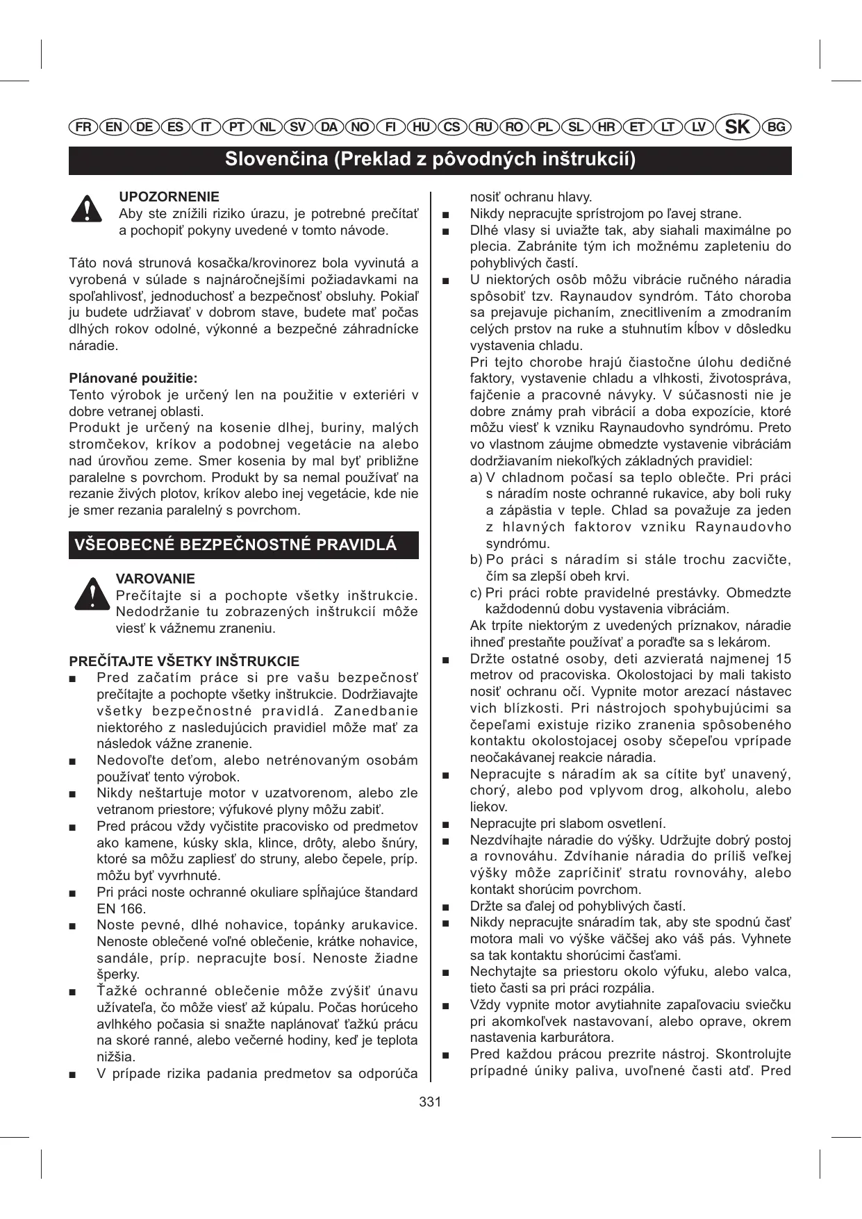 Pred zaatím práce si pre vašu bezpenos8 preítajte a pochopte všetky inštrukcie. Dodržiavajte všetky bezpenostné pravidlá. Zanedbanie niektorého z nasledujúcich pravidiel môže ma8 za následok vážne zranenie. Nedovo7te de8om, alebo netrénovaným osobám používa8 tento výrobok. Nikdy neštartuje motor v uzatvorenom, alebo zle vetranom priestore; výfukové plyny môžu zabi8. Pred prácou vždy vyistite pracovisko od predmetov ako kamene, kúsky skla, klince, drôty, alebo šnúry, ktoré sa môžu zaplies8 do struny, alebo epele, príp. môžu by8 vyvrhnuté. Pri práci noste ochranné okuliare spajúce štandard EN 166. Noste pevné, dlhé nohavice, topánky arukavice. Nenoste obleené vo7né obleenie, krátke nohavice, sandále, príp. nepracujte bosí. Nenoste žiadne šperky. ažké ochranné obleenie môže zvýši8 únavu užívate7a, o môže vies8 až kúpalu. Poas horúceho avlhkého poasia si snažte naplánova8 8ažkú prácu na skoré ranné, alebo veerné hodiny, ke je teplota nižšia. V prípade rizika padania predmetov sa odporúa