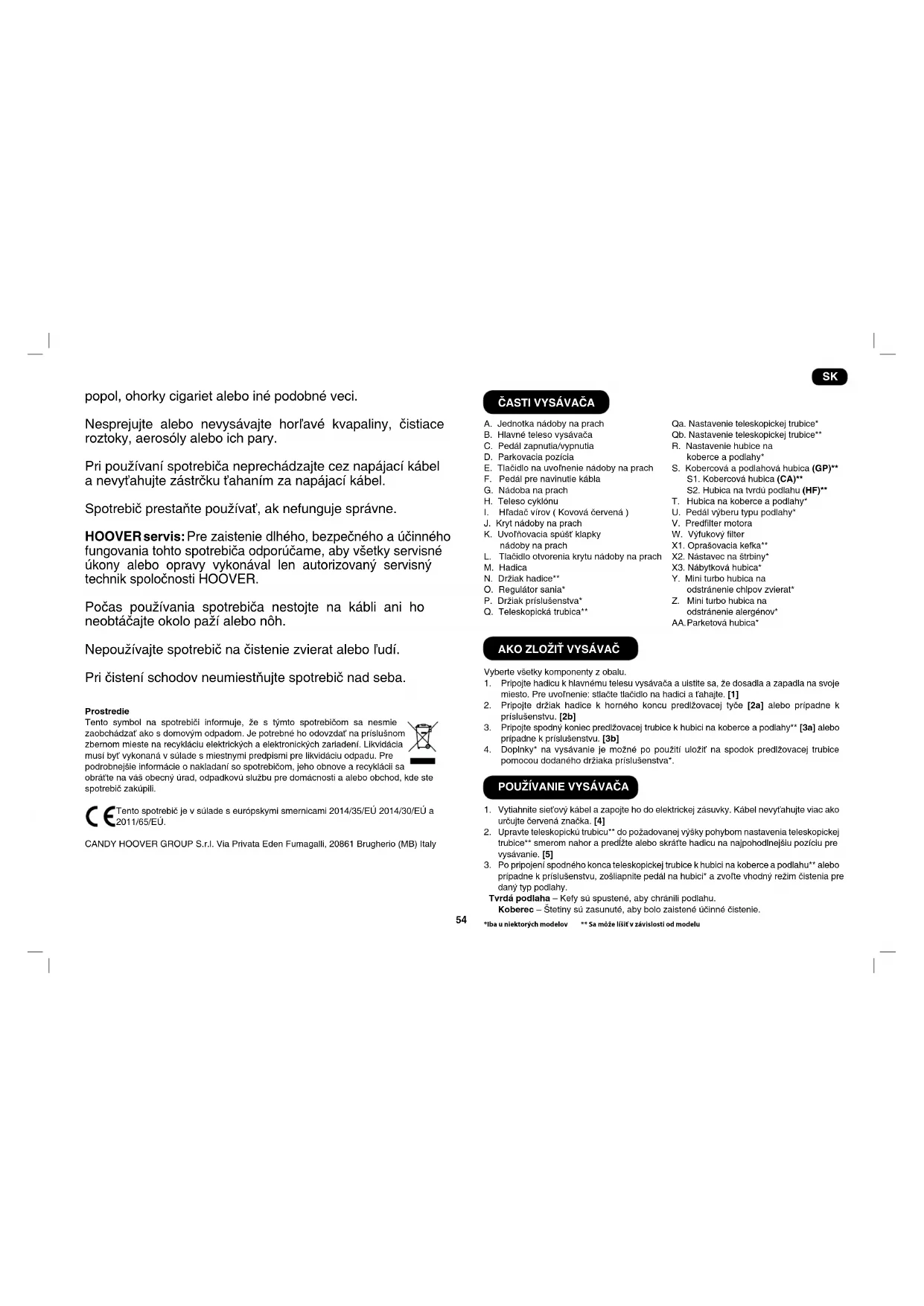 Tento spotrebič je určený na domáce čistenie, ako je uvedené v tejto používateľskej príručke. Pred použitím spotrebiča sa uistite, že ste tejto príručke plne porozumeli. Spotrebič nenechávajte zapojený do elektrickej siete. Spotrebič vypnite a vytiahnite zástrčku zo zásuvky vždy po jeho použití, pred čistením, alebo akoukoľvek údržbou. Tento spotrebič môžu používať deti staršie ako 8 rokov a osoby s obmedzenými fyzickými, zmyslovými alebo duševnými schopnosťami, alebo nedostatočnými skúsenosťami a znalosťami vtedy, ak sú pod dohľadom alebo im boli dané pokyny týkajúce sa bezpečného použitia spotrebiča a rozumejú možným rizikám. Deti sa so spotrebičom nesmú hrať. Čistenie a údržbu nesmú vykonávať deti bez dozoru. Ak je napájací kábel poškodený, okamžite prestaňte spotrebič používať. Aby nedošlo k ohrozeniu bezpečnosti, napájací kábel musí vymeniť autorizovaný servisný technik spoločnosti HOOVER. Ruky, nohy, voľné oblečenie a vlasy držte v bezpečnej vzdialenosti od rotujúcich kief. Používajte iba príslušenstvo, spotrebný materiál alebo náhradné diely odporúčané alebo dodávané spoločnosťou HOOVER. Statická elektrina: Niektoré koberce môžu spôsobiť menšie nahromadenie statickej elektriny. Prípadný statický výboj nie je zdraviu škodlivý. Nepoužívajte spotrebič vonku, na akomkoľvek mokrom povrchu alebo na mokré vysávanie. Nevysávajte tvrdé alebo ostré predmety, zápalky, horúci SK54 popol, ohorky cigariet alebo iné podobné veci. Nesprejujte alebo nevysávajte horľavé kvapaliny, čistiace roztoky, aerosóly alebo ich pary. Pri používaní spotrebiča neprechádzajte cez napájací kábel a nevyťahujte zástrčku ťahaním za napájací kábel. Spotrebič prestaňte používať, ak nefunguje správne. HOOVER servis: Pre zaistenie dlhého, bezpečného a účinného fungovania tohto spotrebiča odporúčame, aby všetky servisné úkony alebo opravy vykonával len autorizovaný servisný technik spoločnosti HOOVER. Počas používania spotrebiča nestojte na kábli ani ho neobtáčajte okolo paží alebo nôh. Nepoužívajte spotrebič na čistenie zvierat alebo ľudí. Pri čistení schodov neumiestňujte spotrebič nad seba. Prostredie Tento symbol na spotrebiči informuje, že s týmto spotrebičom sa nesmie zaobchádzať ako s domovým odpadom. Je potrebné ho odovzdať na príslušnom zbernom mieste na recykláciu elektrických a elektronických zariadení. Likvidácia musí byť vykonaná v súlade s miestnymi predpismi pre likvidáciu odpadu. Pre podrobnejšie informácie o nakladaní so spotrebičom, jeho obnove a recyklácii sa obráťte na váš obecný úrad, odpadkovú službu pre domácnosti a alebo obchod, kde ste spotrebič zakúpili. Tento spotrebič je v súlade s európskymi smernicami 2014/35/EÚ 2014/30/EÚ a 2011/65/EÚ. CANDY HOOVER GROUP S.r.l. Via Privata Eden Fumagalli, 20861 Brugherio (MB) Italy