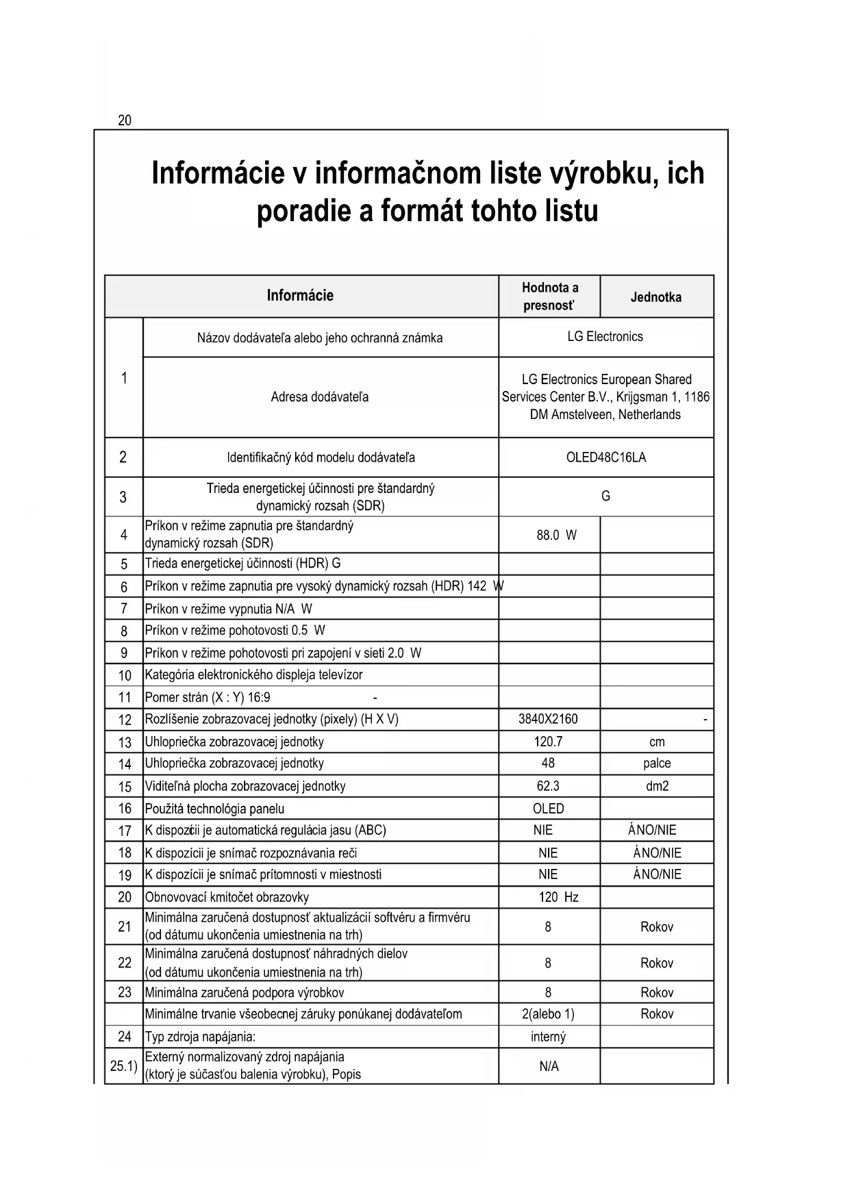 LG Electronics LG Electronics European Shared Services Center B.V., Krijgsman 1, 1186 DM Amstelveen, Netherlands Informácie25.2) Externý normalizovaný zdroj napájania (ktorý je súčasťou balenia výrobku), Vstupné napätie N/A V 25.3) Externý normalizovaný zdroj napájania (ktorý je súčasťou balenia výrobku), Výstupné napätie N/A V 26.1) Externý normalizovaný vhodný zdroj napájania (ak nie je súčasťou balenia výrobku), Podporovaný štandardný názov alebo zoznam N/A 26.2) Externý normalizovaný vhodný zdroj napájania (ak nie je súčasťou balenia výrobku), Požadované výstupné napätie N/A V 26.3) Externý normalizovaný vhodný zdroj napájania (ak nie je súčasťou balenia výrobku), Požadovaný dodávaný prúd (minimálne) N/A A 26.4) Externý normalizovaný vhodný zdroj napájania (ak nie je súčasťou balenia výrobku), Požadovaná frekvencia prúdu N/A Hz21 Vrednost in natančnost Enota Dobaviteljevo ime ali blagovna znamka; Naslov dobavitelja