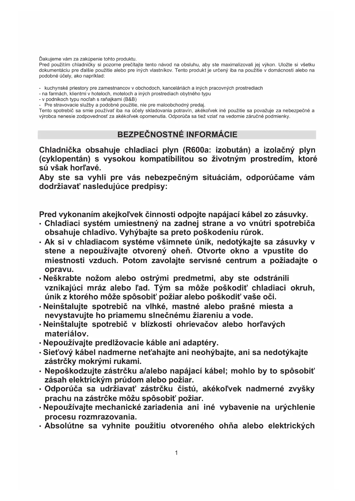 Chladnička obsahuje chladiaci plyn (R600a: izobután) a izolačný plyn (cyklopentán) s vysokou kompatibilitou so životným prostredím, ktoré sú však horľavé. Aby ste sa vyhli pre vás nebezpečným situáciám, odporúčame vám dodržiavať nasledujúce predpisy: Pred vykonaním akejkoľvek činnosti odpojte napájací kábel zo zásuvky.