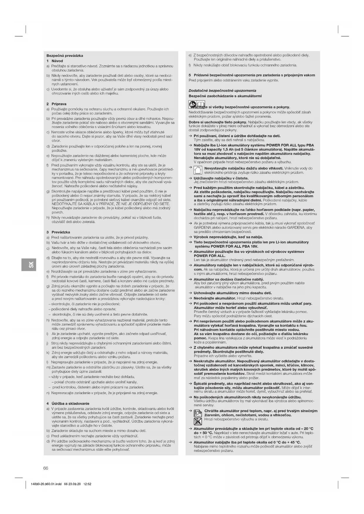 Elektrická bezpečnosť NEBEZPEČENSTVO! Zástava srdca!Tento výrobok vytvára počas prevádzky elektromagnetické pole. Toto pole môže mať za určitých podmienok vplyv na činnosť aktívnych alebo pasívnych medicínskych implantátov. Aby sa eliminovali nebezpečné situácie, ktoré by mohli viesť k ťažkým alebo smrteľným zraneniam, mali by osoby s medicínskym implantátom použitie tohto výrobku konzultovať so svojím lekárom alebo s výrobcom implantátu. NEBEZPEČENSTVO! Nebezpečenstvo výbuchu!S výrobkom nepracujte v prostredí s nebezpečím výbuchu, kde sa nachá-dzajú horľavé tekutiny, plyny alebo prach. Elektrické náradie spôsobuje iskrenie, ktoré môže vznietiť prach alebo výpary.Pri odfukovaní veľkých množstiev odfukovaného materiálu, ktorý obsa-huje prach, môže dôjsť k elektrostatickým nábojom, ktoré sa môžu pri nepriaznivých (napr. veľmi suchých) okolitých podmienkach náhle vybiť.Výrobok nabíjaný akumulátormi používajte len v rozsahu teplôt 0 °C až 40 °C.Nepoužívajte výrobok vo vlhkom prostredí.Chráňte kontakty akumulátora pred vlhkosťou.Osobná bezpečnosť NEBEZPEČENSTVO! Nebezpečenstvo zadusenia!Menšie diely je možné ľahko prehltnúť. Obaly z umelých hmôt predsta-vujú pre malé deti nebezpečenstvo zadusenia. Pri montáži držte malé deti v dostatočnej vzdialenosti.Výrobok používajte len pri dennom svetle alebo dobrom umelom osvetlení.Pohybujte sa pokojnou chôdzou, nebežte.Pevne dotiahnite všetky matice, čapy a skrutky, aby ste zaistili, že je výrobok vtakom pracovnom stave, ktorý zaručuje bezpečnosť.Vyvarujte sa používaniu výrobku pri nepriaznivom počasí, obzvlášť pri búrke.Nenoste odev, ktorý by sa mohol nasať do nasávacieho otvoru vzduchu (napr. šál, kravata, šperky).Zopnite si dlhé vlasy a zaistite ich (napr. prilbou, čiapkou, šatkou na hlavu).Varovanie: Nepoužívajte výrobok bez vyfukovacej trubice, aby ste zabránili kon-taktu s poletujúcimi nečistotami, ktoré môže spôsobiť ťažké zranenia.Používajte vždy ochranné rukavice a ochranu očí, aby ste zamedzili vniknutiu kamienkov a sypkých materiálov do očí a tváre, čo by mohlo spôsobiť ťažné zranenia, dokonca oslepnutie.Pri nastavovaní výrobku buďte opatrní, aby ste si počas montáže dielov fúkača nezacvikli prsty medzi pohyblivé a pevné diely výrobku.Nepoužívajte výrobok, ak je niektorá časť poškodená alebo pokazená alebo je niektorá skrutka uvoľnená. Poruchu nechajte opraviť u autorizovaného odbor-níka.Fúkač nepoužívajte v blízkosti zapálenej trávy alebo krovia, v blízkosti krbov, grilov, popolníkov a pod. Správne použitie fúkača pomáha zabrániť rozšíreniu ohňa.Do otvorov fúkača nevkladajte žiadne predmety, lístie odfukujte vždy smerom preč od ľudí, zvierat, skla a pevných objektov ako stromov, áut, stien, atď.Sila prúdu vzduchu môže spôsobiť vymrštenie alebo vyhodenie kamienkov, nečistôt a konárikov, ktoré môžu zraniť osoby alebo zvieratá, rozbiť sklo alebo spôsobiť iné materiálne škody.Nikdy nepoužívajte výrobok na rozmetávanie chemikálií, hnojiva alebo iných látok. To zabráni šíreniu toxických materiálov.Pre zabránenie podráždenia spôsobeného prachom odporúčame používať ochrannú masku proti prachu.Pokiaľ sa výrobok kvôli poruche nedá vypnúť, vytiahnite okamžite akumulátor akontaktujte servis GARDENA.Pokiaľ používate výrobok, nepohybujte sa smerom dozadu, mohli by ste sa potknúť.Upozornenie! Pri používaní ochrany sluchu a pri hlučnosti spôsobenej výrobkom sa môže stať, že nezbadáte osoby vo Vašej blízkosti.Tento výrobok je určený len pre použitie vo vonkajšom prostredí.Buďte vždy pozorní, dávajte pozor na to, čo robíte a pri prevádzke elektrického zariadenia používajte zdravý rozum.Elektrické náradie nepoužívajte, ak cítite únavu, ochorenie alebo ste pod vplyvom drog, alkoholu alebo liekov. Jeden moment nepozornosti pri prevádzke elektric-kého náradia môže viesť k ťažkým úrazom.Nedemontujte výrobok na viac častí, ako bol v čase dodania.