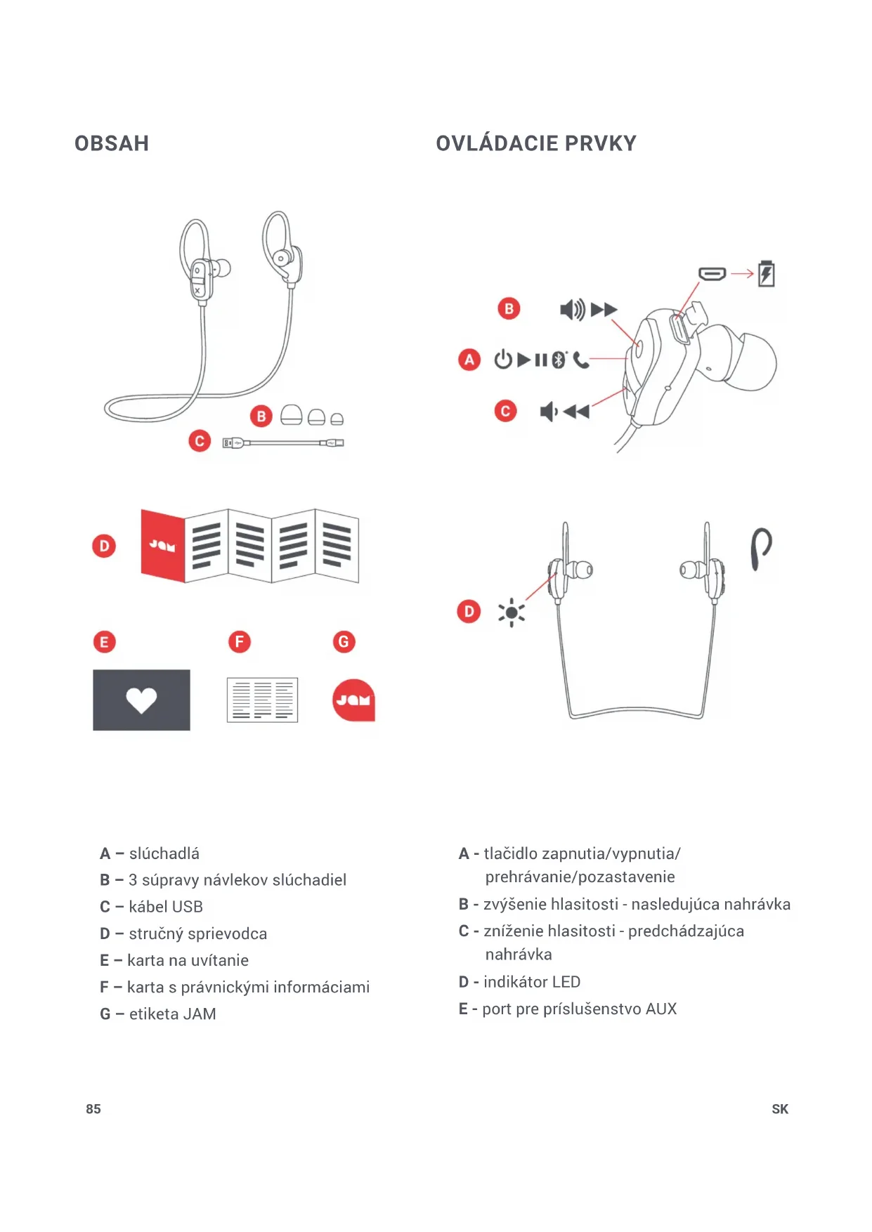 Tento symbol znamená, že batérie nesmú byť zlikvidované spolu s domovým odpadom, pretože obsahujú látky, ktoré môžu poškodzovať životné prostredie a zdravie. Batérie zlikvidujte na určených zberných miestach. FKA Brands Ltd týmto vyhlasuje, že toto rádiové zariadenie spĺňa základné požiadavky a ďalšie príslušné ustanovenia smernice 2014/53/EÚ. Kópiu vyhlásenia o zhode môžete získať na adrese uk.jamaudio.com/DoC. Všetky práva vyhradené. IB-HXEP303DT89 EN 89EN 89 “Live Large” HX-EP303 Manual de instrucţiuniRO90 CONȚINUT A – căști B – 3 seturi capace auriculare C – cablu USB D – ghid de iniţiere rapidă E – șă introductivă F – șă juridică G – autocolant Jam COMENZI A – buton de pornire/oprire sau redare/pauză B – creștere volum / piesa următoare C – reducere volum / piesa anterioară D – indicator cu LED E – port de intrare AUX