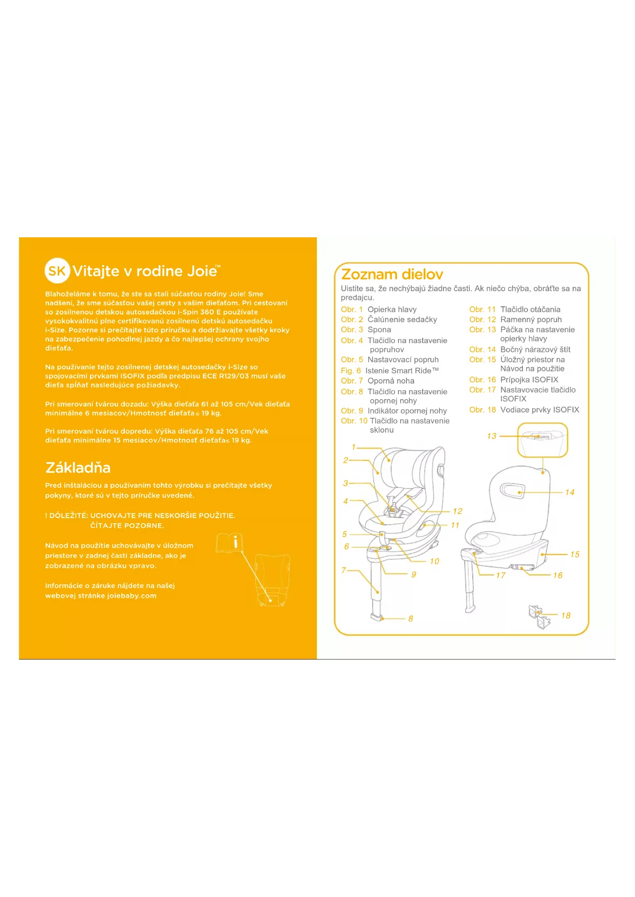Blahoželáme k tomu, že ste sa stali súčasťou rodiny Joie! Sme nadšení, že sme súčasťou vašej cesty s vašim dieťaťom. Pri cestovaní so zosilnenou detskou autosedačkou i-Spin 360 E používate vysokokvalitnú plne certifikovanú zosilnenú detskú autosedačku i-Size. Pozorne si prečítajte túto príručku a dodržiavajte všetky kroky na zabezpečenie pohodlnej jazdy a čo najlepšej ochrany svojho dieťaťa.Na používanie tejto zosilnenej detskej autosedačky i-Size so spojovacími prvkami ISOFIX podľa predpisu ECE R129/03 musí vaše dieťa spĺňať nasledujúce požiadavky.Pri smerovaní tvárou dozadu: Výška dieťaťa 61 až 105 cm/Vek dieťaťa minimálne 6 mesiacov/Hmotnosť dieťaťa 19 kg.Pri smerovaní tvárou dopredu: Výška dieťaťa 76 až 105 cm/Vek dieťaťa minimálne 15 mesiacov/Hmotnosť dieťaťa 19 kg. Základňa Pred inštaláciou a používaním tohto výrobku si prečítajte všetky pokyny, ktoré sú v tejto príručke uvedené.! DÔLEŽITÉ: UCHOVAJTE PRE NESKORŠIE POUŽITIE.ČÍTAJTE POZORNE.Návod na použitie uchovávajte v úložnom priestore v zadnej časti základne, ako je zobrazené na obrázku vpravo. Informácie o záruke nájdete na našej webovej stránke joiebaby.com Zoznam dielov Obr. 1 Opierka hlavyObr. 2 Čalúnenie sedačkyObr. 3 SponaObr. 4 Tlačidlo na nastavenie popruhovObr. 5 Nastavovací popruhFig. 6 Istenie Smart Ride™Obr. 7 Oporná nohaObr. 8 Tlačidlo na nastavenie opornej nohyObr. 9 Indikátor opornej nohyObr. 10 Tlačidlo na nastavenie sklonuObr. 11 Tlačidlo otáčaniaObr. 12 Ramenný popruhObr. 13 Páčka na nastavenie opierky hlavyObr. 14 Bočný nárazový štítObr. 15 Úložný priestor na Návod na použitieObr. 16 Prípojka ISOFIXObr. 17 Nastavovacie tlačidlo ISOFIXObr. 18 Vodiace prvky ISOFIX Uistite sa, že nechýbajú žiadne časti. Ak niečo chýba, obráťte sa na predajcu.