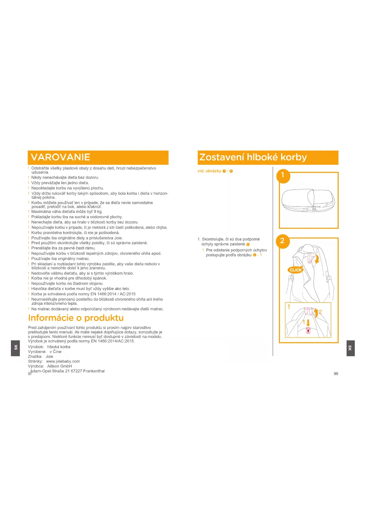 VAROVANIE ! Odstráňte všetky plastové obaly z dosahu detí, hrozí nebezpečenstvo udusenia.! Nikdy nenechávajte dieťa bez dozoru.! Vždy prevážajte len jedno dieťa.! Nepokladajte korbu na vyvýšenú plochu. ! Vždy držte rukoväť korby takým spôsobom, aby bola korba i dieťa v horizon- tálnej polohe.! Korbu môžete používať len v prípade, že sa dieťa nevie samostatne posadiť, pretočiť na bok, alebo kľaknúť.! Maximálna váha dieťaťa môže byť 9 kg.! Pokladajte korbu iba na suché a vodorovné plochy.! Nenechajte dieťa, aby sa hralo v blízkosti korby bez dozoru.! Nepoužívajte korbu v prípade, či je niektorá z ich častí poškodená, alebo chýba.! Korbu pravidelne kontrolujte, či nie je poškodená.! Používajte iba originálne diely a príslušenstva Joie.! Pred použitím skontrolujte všetky poistky, či sú správne zaistené.! Prenášajte iba za pevné časti rámu.! Nepoužívajte korbu v blízkosti tepelných zdrojov, otvoreného ohňa apod.! Používajte iba originálny matrac.! Pri skladaní a rozkladaní tohto výrobku zaistite, aby vaše dieťa nebolo v blízkosti a nemohlo doisť k jeho zraneniu.! Nedovoľte vášmu dieťaťu, aby si s týmto výrobkom hralo.! Korba nie je vhodná pre dlhodobý spánok.! Nepoužívajte korbu na žiadnom stojanu.! Hlavička dieťaťa v korbe musí byť vždy vyššie ako telo.! Korba je schválená podľa normy EN 1466:2014 / AC:2015! Neumiestňujte prenosnú postieľku do blízkosti otvoreného ohňa ani iného zdroja intenzívneho tepla.! Na matrac dodávaný alebo odporúčaný výrobcom nedávajte ďalší matrac. Informácie o produktu Pred zahájením používaní tohto produktu si prosím najprv starostlivo preštudujte tento manuál. Ak máte nejaké doplňujúce dotazy, konzultujte je s predajcom. Niektoré funkcie nemusí byť dostupné v závislosti na modelu. Výrobok je schválený podľa normy EN 1466:2014/AC:2015.Výrobok: hlboká korbaVyrobené: v ČíneZnačka: JoieStránky: www.joiebaby.comVýrobca: Allison GmbH Adam-Opel-Straße 21 67227 Frankenthal Zostavení hlboké korby vid. obrázky
