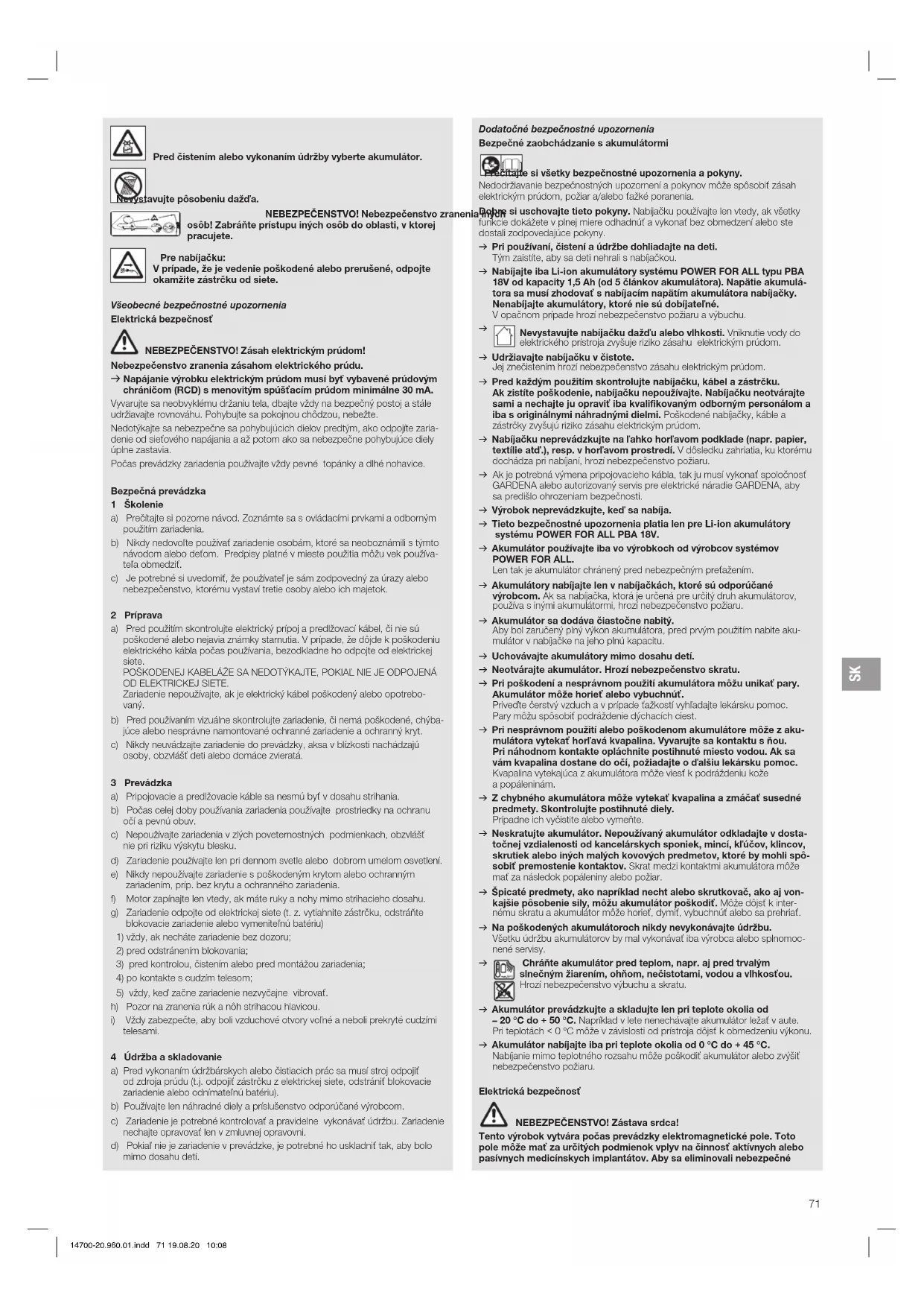 Nevystavujte nabíjačku dažďu alebo vlhkosti. Vniknutie vody do elektrického prístroja zvyšuje riziko zásahu elektrickým prúdom. v Udržiavajte nabíjačku v čistote. Jej znečistením hrozí nebezpečenstvo zásahu elektrickým prúdom. v Pred každým použitím skontrolujte nabíjačku, kábel a zástrčku. Ak zistíte poškodenie, nabíjačku nepoužívajte. Nabíjačku neotvárajte sami a nechajte ju opraviť iba kvalifikovaným odborným personálom a iba s originálnymi náhradnými dielmi. Poškodené nabíjačky, káble a zástrčky zvyšujú riziko zásahu elektrickým prúdom. v Nabíjačku neprevádzkujte na ľahko horľavom podklade (napr. papier, textílie atď.), resp. v horľavom prostredí. V dôsledku zahriatia, ku ktorému dochádza pri nabíjaní, hrozí nebezpečenstvo požiaru. v Ak je potrebná výmena pripojovacieho kábla, tak ju musí vykonať spoločnosť GARDENA alebo autorizovaný servis pre elektrické náradie GARDENA, aby sa predišlo ohrozeniam bezpečnosti. v Výrobok neprevádzkujte, keď sa nabíja. v Tieto bezpečnostné upozornenia platia len pre Li-ion akumulátory systému POWER FOR ALL PBA 18V. v Akumulátor používajte iba vo výrobkoch od výrobcov systémov POWER FOR ALL. Len tak je akumulátor chránený pred nebezpečným preťažením. v Akumulátory nabíjajte len v nabíjačkách, ktoré sú odporúčané výrobcom. Ak sa nabíjačka, ktorá je určená pre určitý druh akumulátorov, používa s inými akumulátormi, hrozí nebezpečenstvo požiaru. v Akumulátor sa dodáva čiastočne nabitý. Aby bol zaručený plný výkon akumulátora, pred prvým použitím nabite aku- mulátor v nabíjačke na jeho plnú kapacitu. v Uchovávajte akumulátory mimo dosahu detí. v Neotvárajte akumulátor. Hrozí nebezpečenstvo skratu. v Pri poškodení a nesprávnom použití akumulátora môžu unikať pary. Akumulátor môže horieť alebo vybuchnúť. Priveďte čerstvý vzduch a v prípade ťažkostí vyhľadajte lekársku pomoc. Pary môžu spôsobiť podráždenie dýchacích ciest. v Pri nesprávnom použití alebo poškodenom akumulátore môže z aku- mulátora vytekať horľavá kvapalina. Vyvarujte sa kontaktu s ňou. Pri náhodnom kontakte opláchnite postihnuté miesto vodou. Ak sa vám kvapalina dostane do očí, požiadajte o ďalšiu lekársku pomoc. Kvapalina vytekajúca z akumulátora môže viesť k podráždeniu kože a popáleninám. v Z chybného akumulátora môže vytekať kvapalina a zmáčať susedné predmety. Skontrolujte postihnuté diely. Prípadne ich vyčistite alebo vymeňte. v Neskratujte akumulátor. Nepoužívaný akumulátor odkladajte v dosta- točnej vzdialenosti od kancelárskych sponiek, mincí, kľúčov, klincov, skrutiek alebo iných malých kovových predmetov, ktoré by mohli spô- sobiť premostenie kontaktov. Skrat medzi kontaktmi akumulátora môže mať za následok popáleniny alebo požiar. v Špicaté predmety, ako napríklad necht alebo skrutkovač, ako aj von- kajšie pôsobenie sily, môžu akumulátor poškodiť. Môže dôjsť k inter- nému skratu a akumulátor môže horieť, dymiť, vybuchnúť alebo sa prehriať. v Na poškodených akumulátoroch nikdy nevykonávajte údržbu. Všetku údržbu akumulátorov by mal vykonávať iba výrobca alebo splnomoc- nené servisy.
