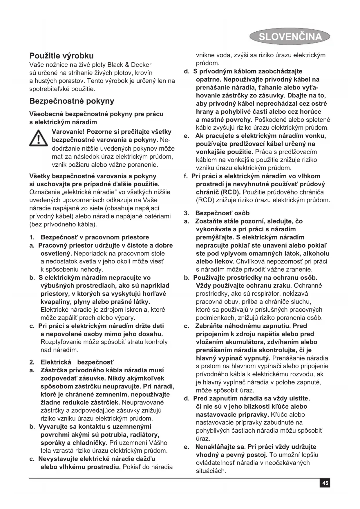 zawiesza uprawnień kupującego wynikających z niezgodności towaru z umową. Centralny Serwis Gwarancyjny ERPATECH ul. Bakaliowa 26, 05-080 Mościska tel.: (22) 862-08-08, (22) 431-05-05 faks: (22) 862-08-0945 SLOVENČINA Použitie výrobku Vaše nožnice na živé ploty Black & Decker sú určené na strihanie živých plotov, krovín a hustých porastov. Tento výrobok je určený len na spotrebiteľské použitie. Bezpečnostné pokyny Všeobecné bezpečnostné pokyny pre prácu s elektrickým náradím Varovanie! Pozorne si prečítajte všetky bezpečnostné varovania a pokyny. Ne- dodržanie nižšie uvedených pokynov môže mať za následok úraz elektrickým prúdom, vznik požiaru alebo vážne poranenie. Všetky bezpečnostné varovania a pokyny si uschovajte pre prípadné ďalšie použitie. Označenie „elektrické náradie“ vo všetkých nižšie uvedených upozorneniach odkazuje na Vaše náradie napájané zo siete (obsahuje napájací prívodný kábel) alebo náradie napájané batériami (bez prívodného kábla).