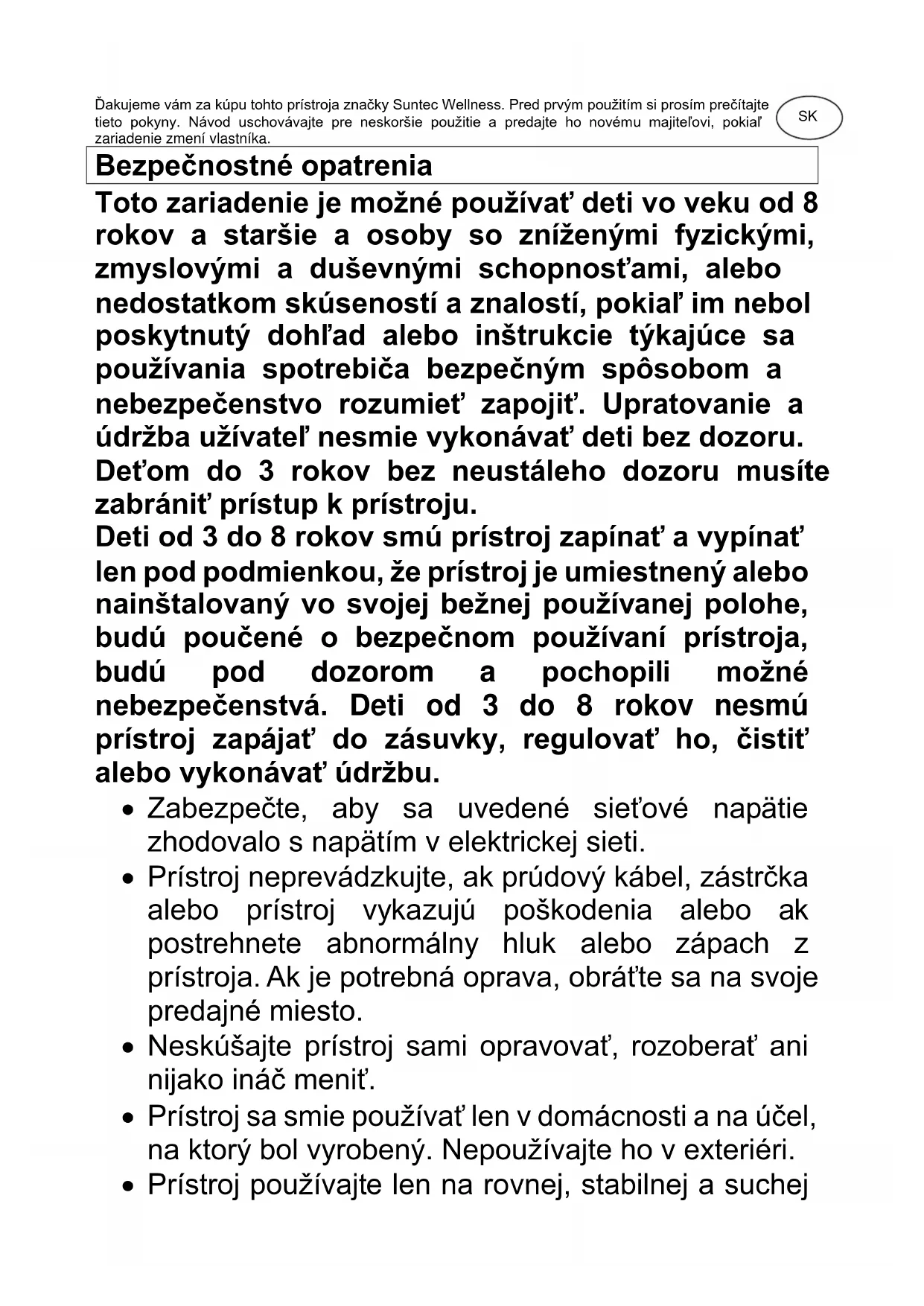 Monsun 6000 black SUNTEC WELLNESS GMBH / HOLZSTRASSE 2 / 40 221 DÜSSELDORF / GERMANYĎakujeme vám za kúpu tohto prístroja značky Suntec Wellness. Pred prvým použitím si prosím prečítajte tieto pokyny. Návod uschovávajte pre neskoršie použitie a predajte ho novému majiteľovi, pokiaľ zariadenie zmení vlastníka. Bezpečnostné opatrenia Toto zariadenie je možné používať deti vo veku od 8 rokov a staršie a osoby so zníženými fyzickými, zmyslovými a duševnými schopnosťami, alebo nedostatkom skúseností a znalostí, pokiaľ im nebol poskytnutý dohľad alebo inštrukcie týkajúce sa používania spotrebiča bezpečným spôsobom a nebezpečenstvo rozumieť zapojiť. Upratovanie a údržba užívateľ nesmie vykonávať deti bez dozoru. Deťom do 3 rokov bez neustáleho dozoru musíte zabrániť prístup k prístroju. Deti od 3 do 8 rokov smú prístroj zapínať a vypínať len pod podmienkou, že prístroj je umiestnený alebo nainštalovaný vo svojej bežnej používanej polohe, budú poučené o bezpečnom používaní prístroja, budú pod dozorom a pochopili možné nebezpečenstvá. Deti od 3 do 8 rokov nesmú prístroj zapájať do zásuvky, regulovať ho, čistiť alebo vykonávať údržbu.