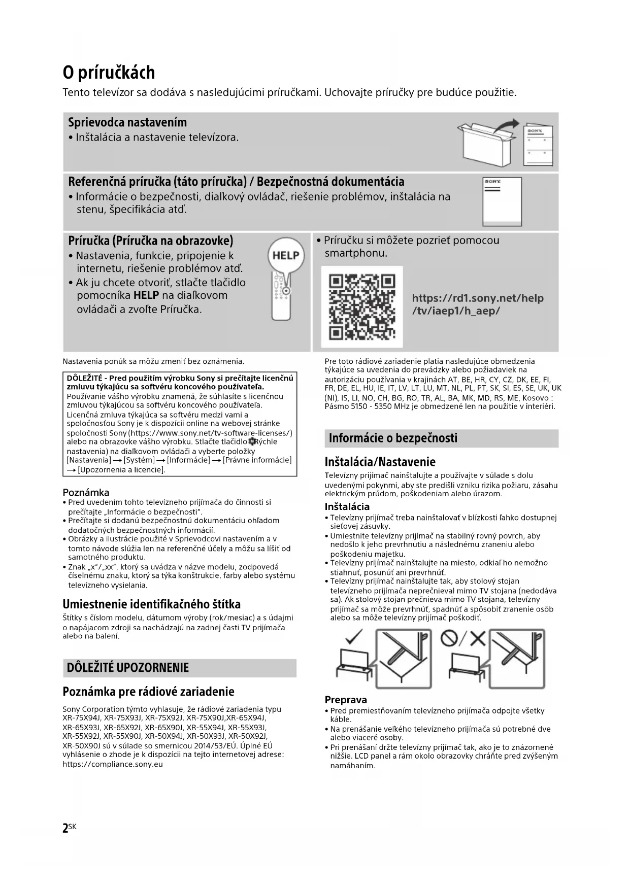 Poznámka pre rádiové zariadenie Sony Corporation týmto vyhlasuje, že rádiové zariadenia typu XR-75X94J, XR-75X93J, XR-75X92J, XR-75X90J,XR-65X94J, XR-65X93J, XR-65X92J, XR-65X90J, XR-55X94J, XR-55X93J, XR-55X92J, XR-55X90J, XR-50X94J, XR-50X93J, XR-50X92J, XR-50X90J sú v súlade so smernicou 2014/53/EÚ. Úplné EÚ vyhlásenie o zhode je k dispozícii na tejto internetovej adrese: https://compliance.sony.euPre toto rádiové zariadenie platia nasledujúce obmedzenia týkajúce sa uvedenia do prevádzky alebo požiadaviek na autorizáciu používania v krajinách AT, BE, HR, CY, CZ, DK, EE, FI, FR, DE, EL, HU, IE, IT, LV, LT, LU, MT, NL, PL, PT, SK, SI, ES, SE, UK, UK (NI), IS, LI, NO, CH, BG, RO, TR, AL, BA, MK, MD, RS, ME, Kosovo :Pásmo 5150 - 5350 MHz je obmedzené len na použitie v interiéri. Informácie o bezpečnosti Inštalácia/Nastavenie Televízny prijímač nainštalujte a používajte v súlade s dolu uvedenými pokynmi, aby ste predišli vzniku rizika požiaru, zásahu elektrickým prúdom, poškodeniam alebo úrazom. Inštalácia