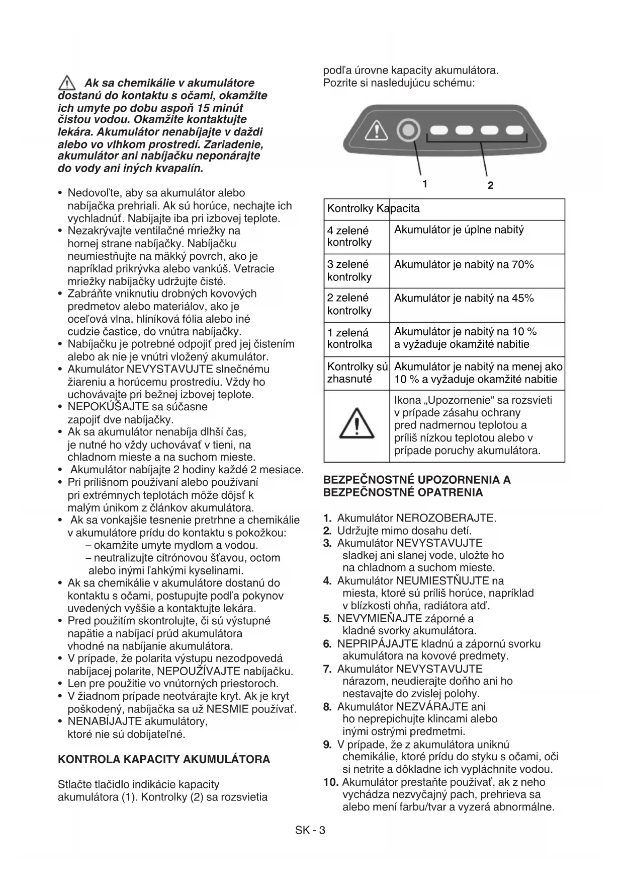 - NEPOKÚŠAJTE sa skratovať svorky akumulátora.SK - 3 Ak sa chemikálie v akumulátore dostanú do kontaktu s očami, okamžite ich umyte po dobu aspoň 15 minút čistou vodou. Okamžite kontaktujte lekára. Akumulátor nenabíjajte v daždi alebo vo vlhkom prostredí. Zariadenie, akumulátor ani nabíjačku neponárajte do vody ani iných kvapalín.