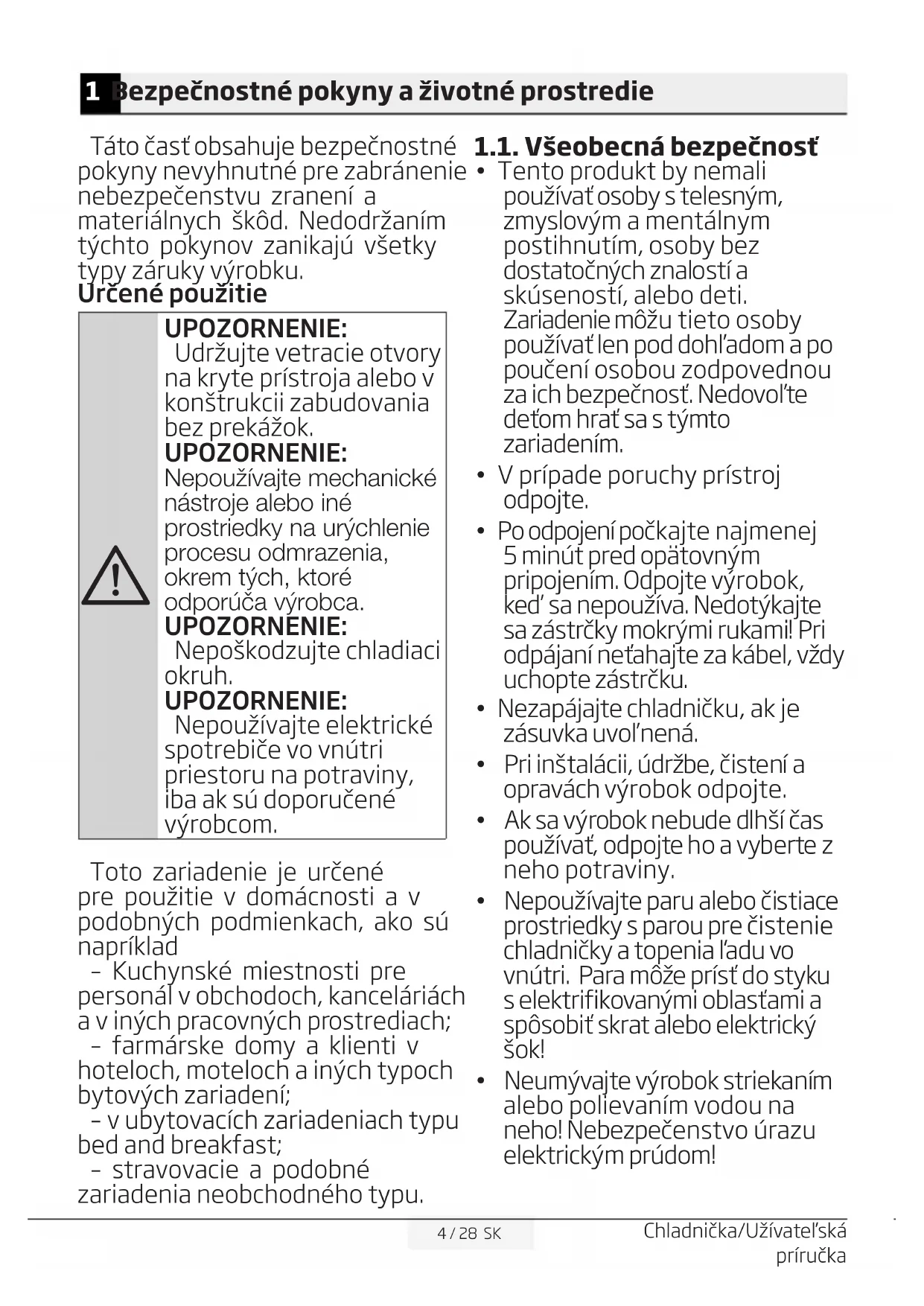 UPOZORNENIE: Udržujte vetracie otvory na kryte prístroja alebo v konštrukcii zabudovania bez prekážok. UPOZORNENIE: Nepoužívajte mechanické nástroje alebo iné prostriedky na urýchlenie procesu odmrazenia, okrem tých, ktoré odporúča výrobca. UPOZORNENIE: Nepoškodzujte chladiaci okruh. UPOZORNENIE: Nepoužívajte elektrické spotrebiče vo vnútri priestoru na potraviny, iba ak sú doporučené výrobcom. Toto zariadenie je určené pre použitie v domácnosti a v podobných podmienkach, ako sú napríklad – Kuchynské miestnosti pre personál v obchodoch, kanceláriách a v iných pracovných prostrediach; – farmárske domy a klienti v hoteloch, moteloch a iných typoch bytových zariadení; – v ubytovacích zariadeniach typu bed and breakfast; – stravovacie a podobné zariadenia neobchodného typu. 1.1. Všeobecná bezpečnosť