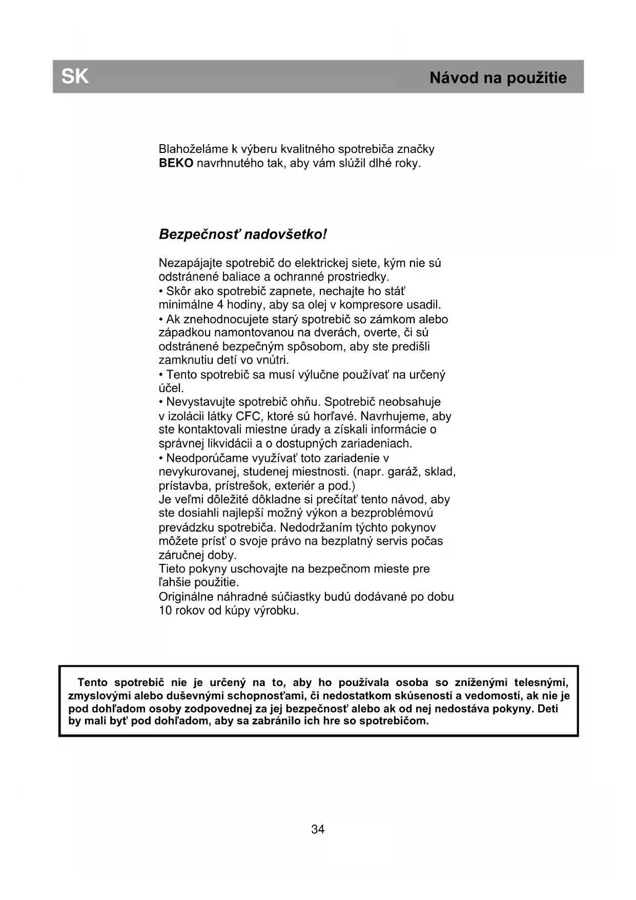 - Neodporúčame využívať toto zariadenie v nevykurovanej, studenej miestnosti. (napr. garáž, sklad, prístavba, prístrešok, exteriér a pod.) Je veľmi dôležité dôkladne si prečítať tento návod, aby ste dosiahli najlepší možný výkon a bezproblémovú prevádzku spotrebiča. Nedodržaním týchto pokynov môžete prísť o svoje právo na bezplatný servis počas záručnej doby. Tieto pokyny uschovajte na bezpečnom mieste pre ľahšie použitie. Originálne náhradné súčiastky budú dodávané po dobu 10 rokov od kúpy výrobku.