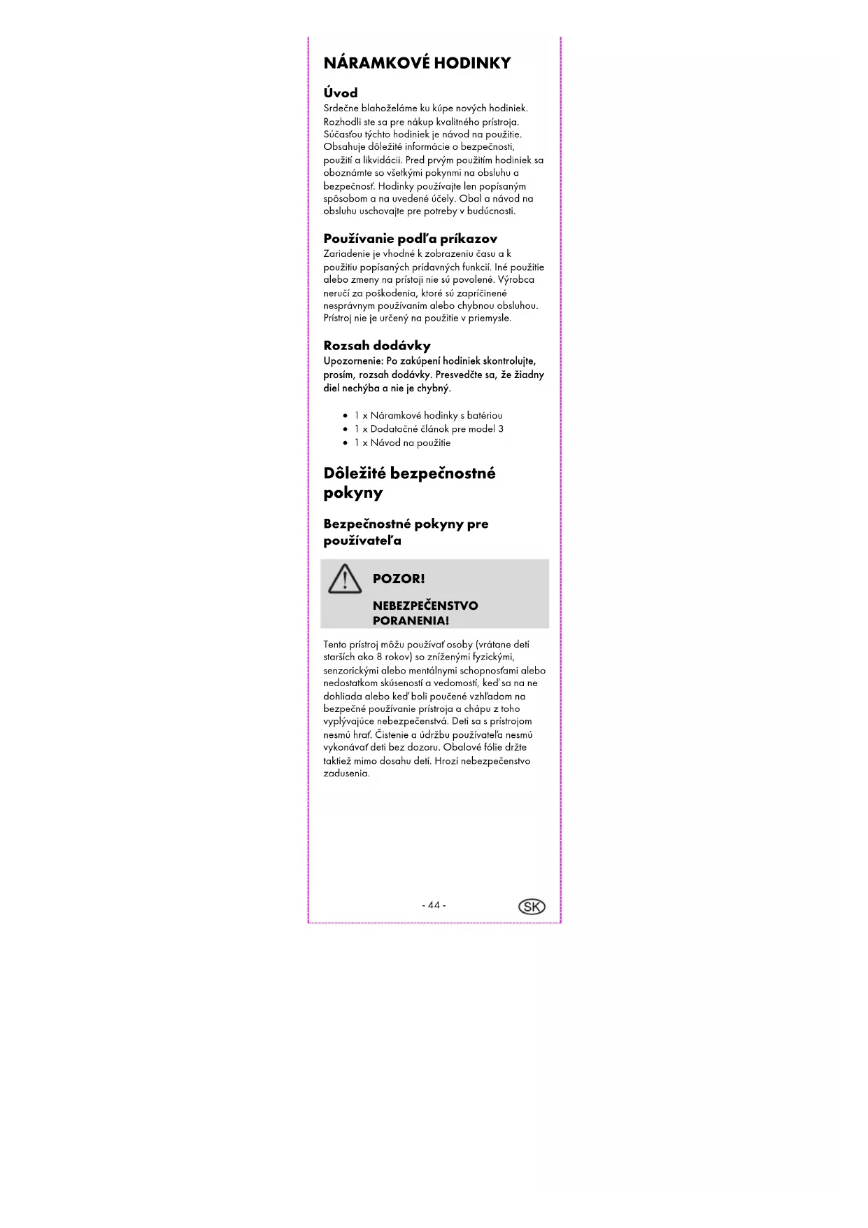 Úvod Srdečne blahoželáme ku kúpe nových hodiniek. Rozhodli ste sa pre nákup kvalitného prístroja. Súčasťou týchto hodiniek je návod na použitie. Obsahuje dôležité informácie o bezpečnosti, použití a likvidácii. Pred prvým použitím hodiniek sa oboznámte so všetkými pokynmi na obsluhu a bezpečnosť. Hodinky používajte len popísaným spôsobom a na uvedené účely. Obal a návod na obsluhu uschovajte pre potreby v budúcnosti. Používanie podľa príkazov Zariadenie je vhodné k zobrazeniu času a k použitiu popísaných prídavných funkcií. Iné použitie alebo zmeny na prístoji nie sú povolené. Výrobca neručí za poškodenia, ktoré sú zapríčinené nesprávnym používaním alebo chybnou obsluhou. Prístroj nie je určený na použitie v priemysle. Rozsah dodávky Upozornenie: Po zakúpení hodiniek skontrolujte, prosím, rozsah dodávky. Presvedčte sa, že žiadny diel nechýba a nie je chybný. 1 x Náramkové hodinky s batériou 1 x Dodatočné článok pre model 3 1 x Návod na použitie Dôležité bezpečnostné pokyny Bezpečnostné pokyny pre používateľa