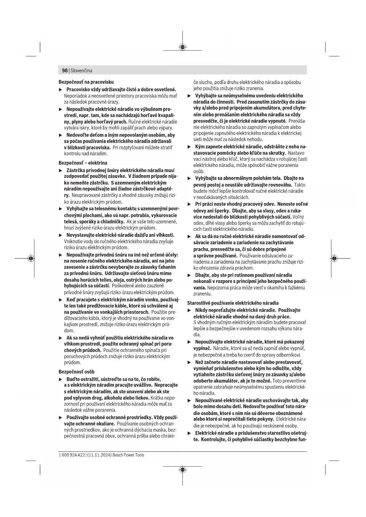 Úroveň vibrácií ahodnota emisií hluku uvedené vtýchto po- kynoch boli namerané podľa normovaného meracieho po- stupu adajú sa použiť na vzájomné porovnávanie elektrické- ho náradia. Hodia sa aj na predbežný odhad emisie vibrácií ahluku. Uvedená úroveň vibrácií ahodnota emisií hluku reprezentuje hlavné spôsoby použitia elektrického náradia. Ak sa však elektrické náradie využíva na iné spôsoby použitia, sodlišný- mi vkladacími nástrojmi alebo pri nedostatočnej údržbe, mô- že sa úroveň vibrácií ahodnota emisií hlukuodlišovať. To môže emisiu vibrácií ahluku počas celého pracovného času výrazne zvýšiť. Na presný odhad emisií vibrácií ahluku by sa mal zohľadniť aj čas, vpriebehu ktorého je náradie vypnuté alebo síce spustené, ale vskutočnosti sa nepoužíva. To môže emisie vibrácií ahluku počas celého pracovného času výrazne zní- žiť. Na ochranu obsluhujúcej osoby pred pôsobením vibrácií ur- čite doplnkové bezpečnostné opatrenia, ako napríklad: údrž- ba elektrického náradia avkladacích nástrojov, udržiavanie správnej teploty rúk, organizácia pracovných procesov. Akumulátor Bosch predáva akumulátorové elektrické náradie aj bez aku- mulátora. Informáciu, či je súčasťou dodávky vášho elektric- kého náradia akumulátor, nájdete na obale. Nabíjanie akumulátora u Používajte len nabíjačky uvedené vtechnických úda- joch. Len tieto nabíjačky sú prispôsobené na lítium-ió- nový akumulátor používaný pri vašom elektrickom náradí. Upozornenie: Lítiovo-iónové akumulátory sa na základe medzinárodných dopravných predpisov dodávajú čiastočne nabité. Aby ste zaručili plný výkon akumulátora, pred prvým použitím ho úplne nabite. Vkladanie akumulátora Zasuňte nabitý akumulátor do uchytenia akumulátora tak, aby zaskočil. Vyberanie akumulátora Na vybratie akumulátora stlačte odisťovacie tlačidlá akumu- látora aakumulátor vytiahnite von. Nepoužívajte pritom ne- primeranú silu. 1 609 92A A22 | (11.11.2024) Bosch Power ToolsSlovenčina | 101 Indikácia stavu nabitia akumulátora Indikácia stavu nabitia akumulátora (5) na elektrickom nára- dí sa skladá ztroch zelených LED kontroliek. Po zapnutí avy- pnutí počas niekoľkých sekúnd zobrazuje stav nabitia aku- mulátora. LED Kapacita Trvalé svietenie: 3× zelená 60 – 100% Trvalé svietenie: 2× zelená 30 – 60% Trvalé svietenie 1× zelená 10 – 30% pomalé blikanie 1× zelená 0 – 10% 3LED kontrolky indikácie stavu nabitia akumulátora rýchlo blikajú, keď je teplota akumulátora mimo rozsahu prevádzkovej teploty od –30 do +70 °C a/alebo sa akti- vovala ochrana pred preťažením. Pokyny na optimálne zaobchádzanie sakumulátorom Chráňte akumulátor pred vlhkosťou avodou. Akumulátor skladujte iba pri teplote vrozsahu od –20°C do 50°C. Nenechávajte akumulátor napríklad vlete položený vautomobile. Príležitostne vyčistite vetracie štrbiny akumulátora čistým, mäkkým asuchým štetcom. Výrazne skrátená doba prevádzky akumulátora po nabití sig- nalizuje, že akumulátor je opotrebovaný atreba ho vymeniť za nový. Dodržiavajte upozornenia týkajúce sa likvidácie. Montáž u Pred vykonávaním akýchkoľvek prác na elektrickom náradí (napr. údržba, výmena nástroja atď.) vyberte zelektrického náradia akumulátor. Vprípade neúmy- selného stlačenia zapínača/vypínača hrozí nebezpečen- stvo poranenia. Výmena brúsneho listu (pozriobrázokB) Pri odoberaní brúsneho listu (9) ho zboku nadvihnite astiah- nite zbrúsneho taniera (7). Pred založením nového brúsneho listu odstráňte nečistoty aprach zbrúsneho taniera (7), napr. štetcom. Povrch brúsneho taniera (7) pozostáva zo suchého zipsu, aby sa brúsne kotúče dali suchým zipsom rýchlo ajednodu- cho upevniť. Brúsny list (9) pevne pritlačte na dolnú stranu brúsneho ta- niera (7). Aby bolo zaručené optimálne odsávanie prachu, dbajte na to, aby sa výrezy vbrúsnom liste (9) zhodovali sotvormi na brúsnom tanieri (7). Na zvýšenie životnosti brúsneho taniera, predovšetkým pri používaní sieťového brúsiva (napr. Bosch M480), môžete medzi brúsny tanier abrúsivo vložiť PadSaver (chránič) (prí- slušenstvo). Voľba brúsneho taniera Podľa spôsobu použitia možno elektrické náradie vybaviť brúsnymi taniermi rozdielneho stupňa tvrdosti: – Mäkký brúsny tanier: vhodný na citlivé brúsenie, aj na ob- lých plochách – Stredne tvrdý brúsny tanier: vhodný na všetky druhy brúsnych prác, univerzálne použiteľný – Tvrdý brúsny tanier: vhodný na brúsenie sveľkým brús- nym výkonom na rovných plochách Výmena brúsneho taniera (pozri obrázokC) Upozornenie: Poškodený brúsny tanier (7) okamžite vy- meňte. Odoberte brúsny list. Úplne vyskrutkujte 4 skrutky (10) (po- mocou skrutkovača T20) aodoberte brúsny tanier (7). Na- saďte nový brúsny tanier (7) askrutky znova utiahnite. Upozornenie: Pri zakladaní brúsneho taniera dbajte na to, aby ozubenie unášača zapadlo do výrezov brúsneho taniera. Upozornenie: Poškodený držiak brúsneho taniera(11) smie vymieňať len autorizovaný zákaznícky servis pre elektrické náradie Bosch. Odsávanie prachu atriesok Prach zniektorých materiálov, napr. znáterov obsahujúcich olovo, zniektorých druhov dreva aminerálov, môže byť zdraviu škodlivý. Kontakt stakýmto prachom alebo jeho vdy- chovanie môže vyvolávať alergické reakcie a/alebo ochore- nia dýchacích ciest používateľa alebo osôb, ktoré sa nachá- dzajú vblízkosti. Určité druhy prachu, ako napríklad prach zdubového alebo zbukového dreva, sa považujú za rakovinotvorné, predov- šetkým vspojení sprídavnými látkami, ktoré sa používajú na ošetrenie dreva (chróman, prostriedky na ochranu dreva). Materiál, ktorý obsahuje azbest, smú spracovávať len odbor- 